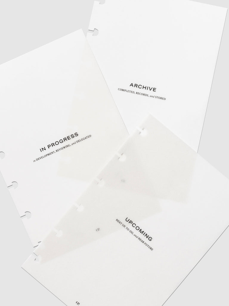 A5 Reinvention Dashboard from the Confidential Collection, translucent planner cover displayed on a white background. A5 Reinvention Dashboard shown inside a ring-bound planner with a minimal, layered spread.