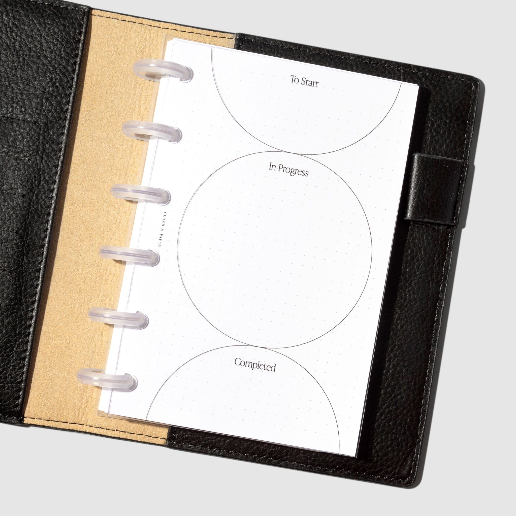 A crystal clear plastic planner dashboard printed in black ink with a Kanban layout for tracking project stages.