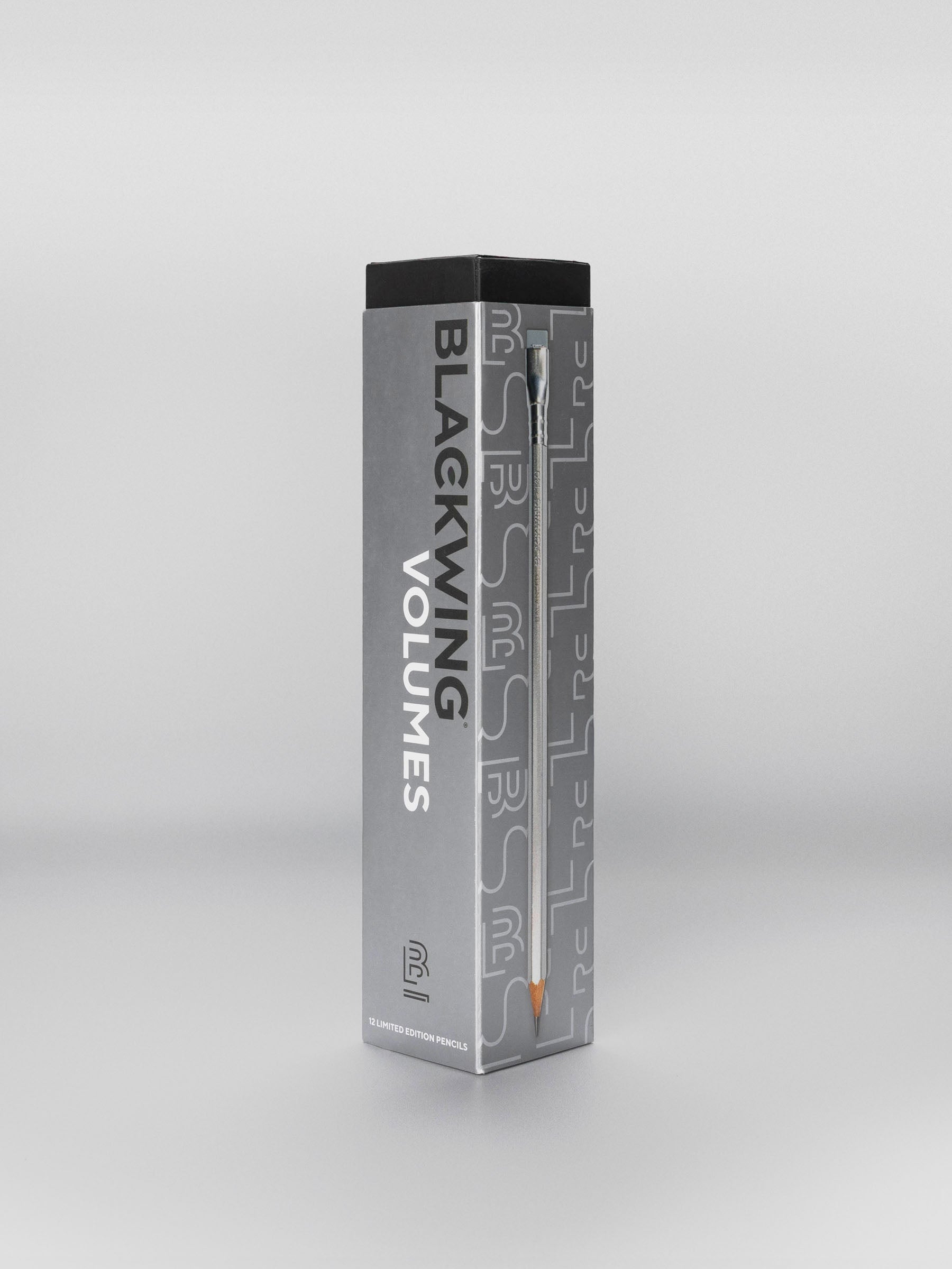Box of Blackwing Volumes 140 pencils standing upright, featuring a sleek gray design.