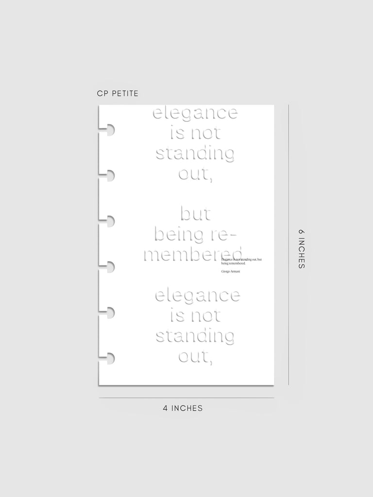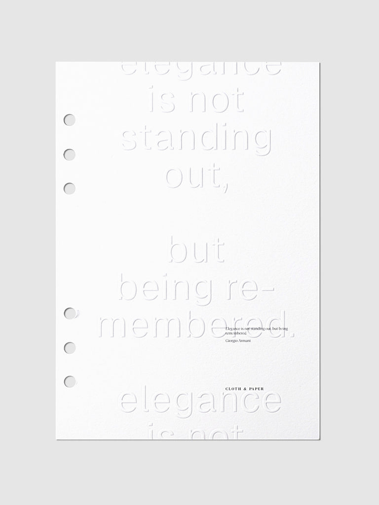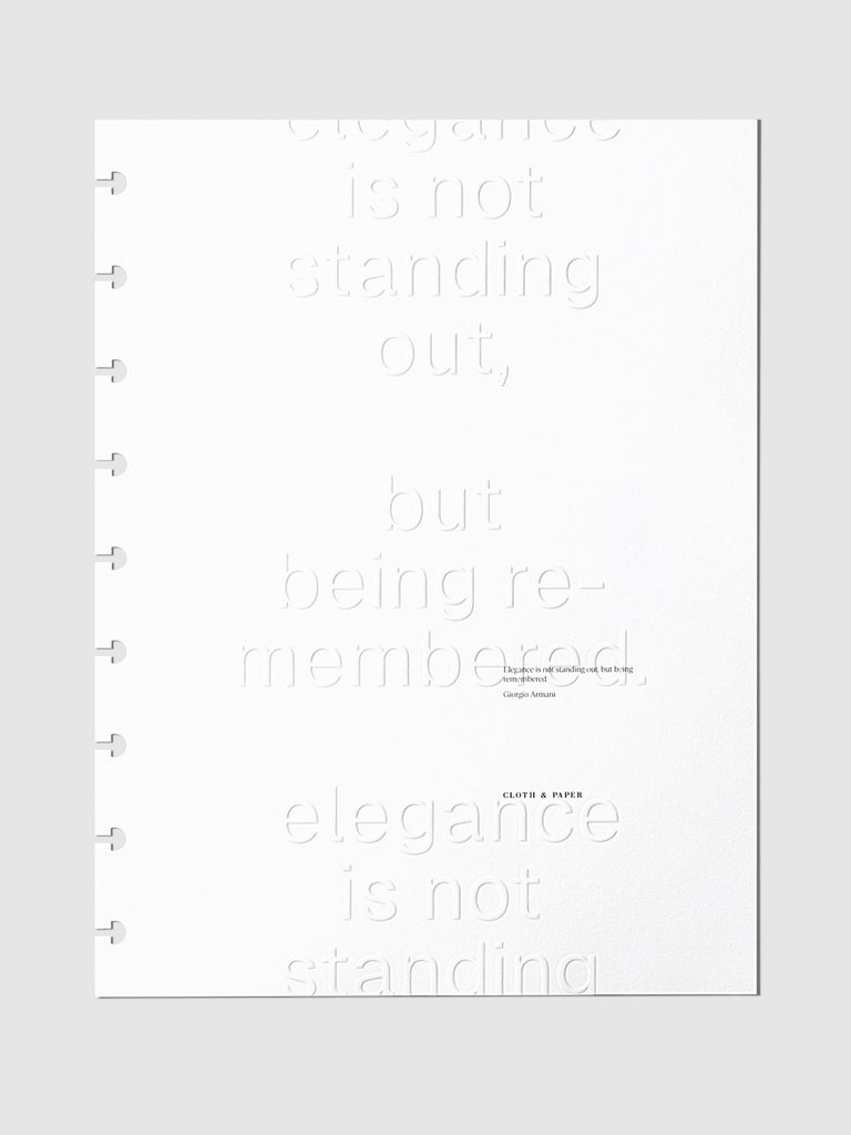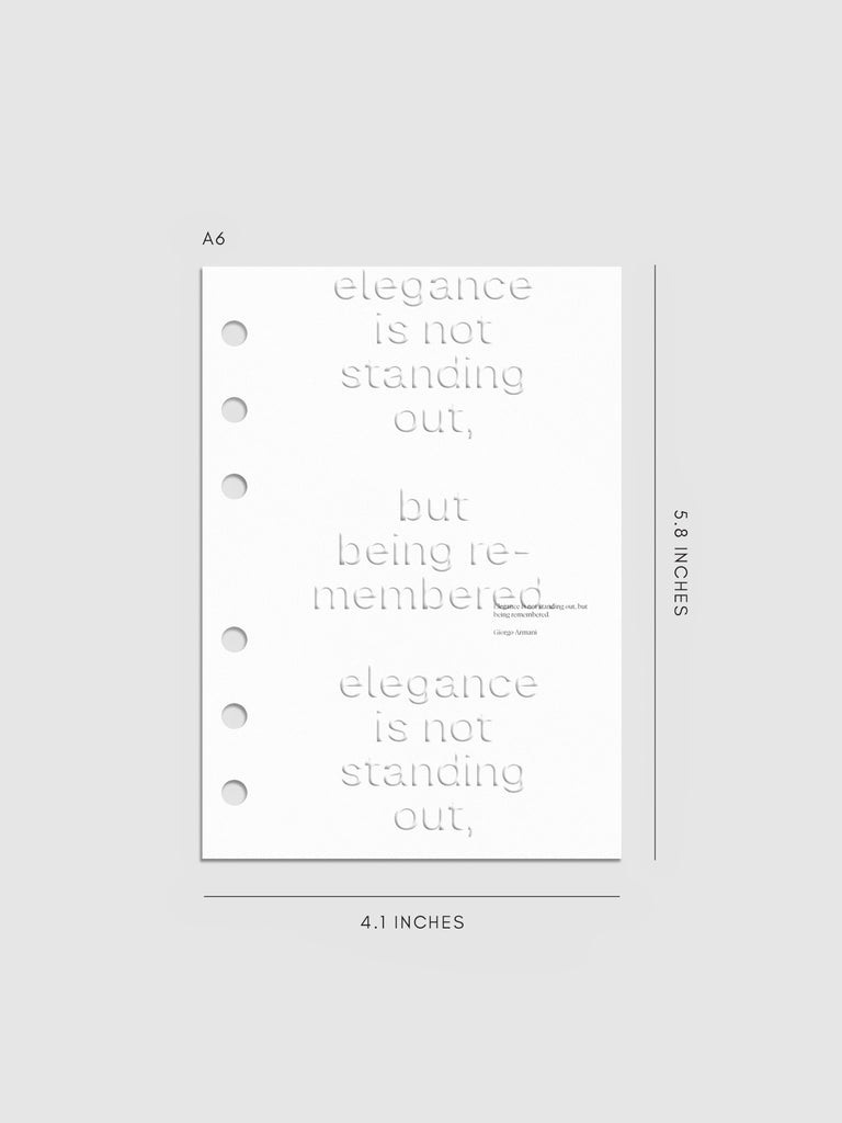 An off-white cotton paper planner dashboard with a quote and black ink printing for an elegant finish.