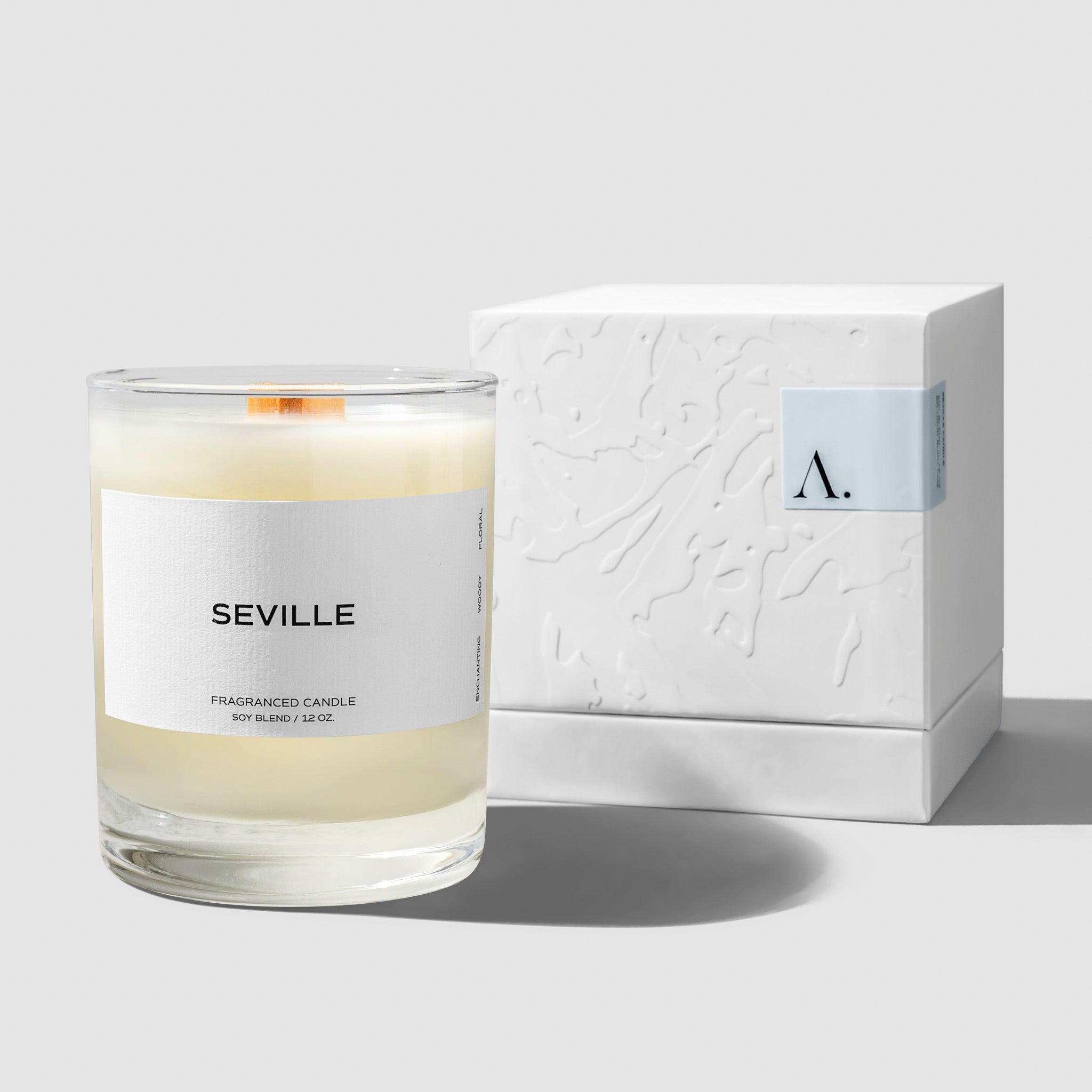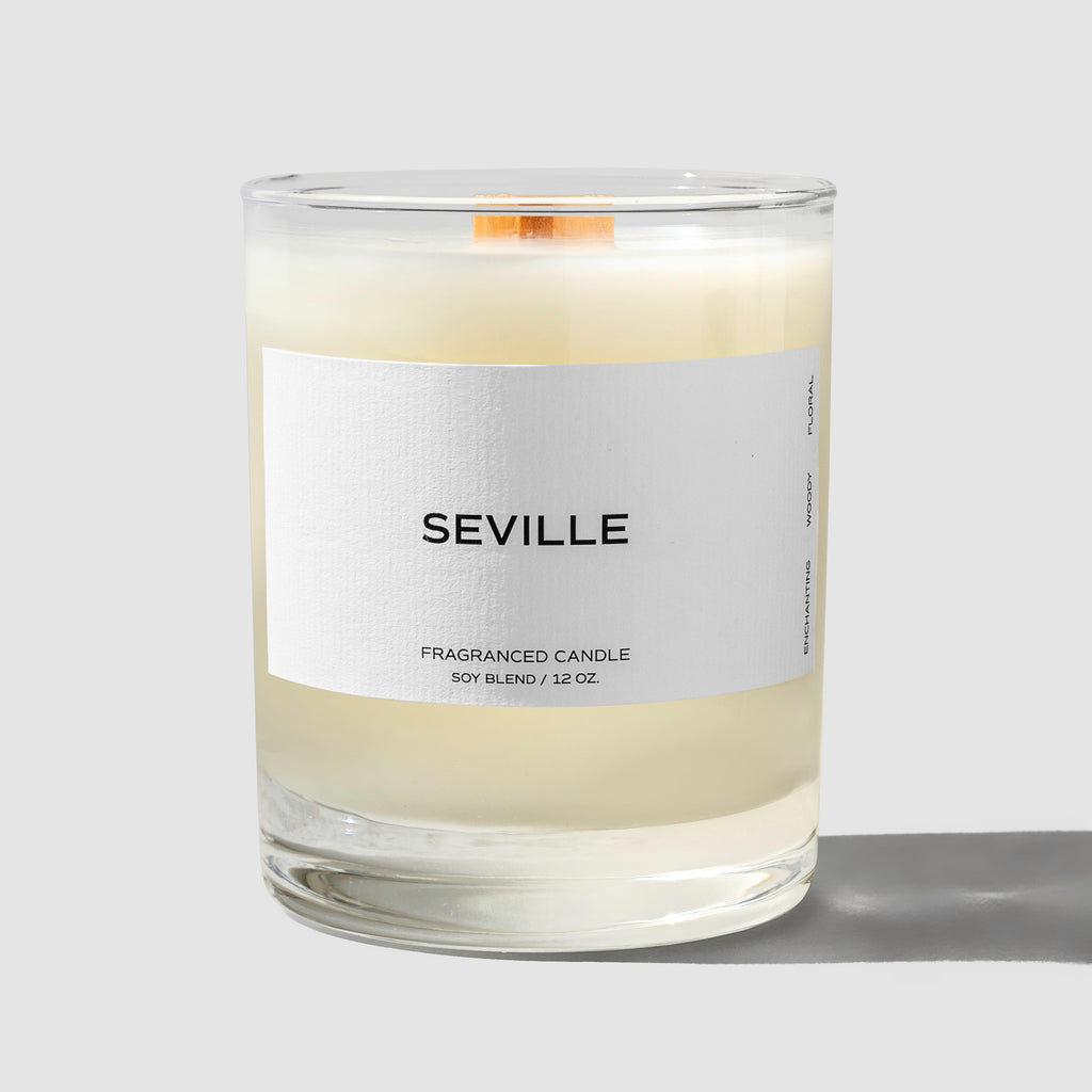 Seville scented candle with a soy wax blend, glass holder, and crackling wooden wick, offering a warm and floral fragrance experience.