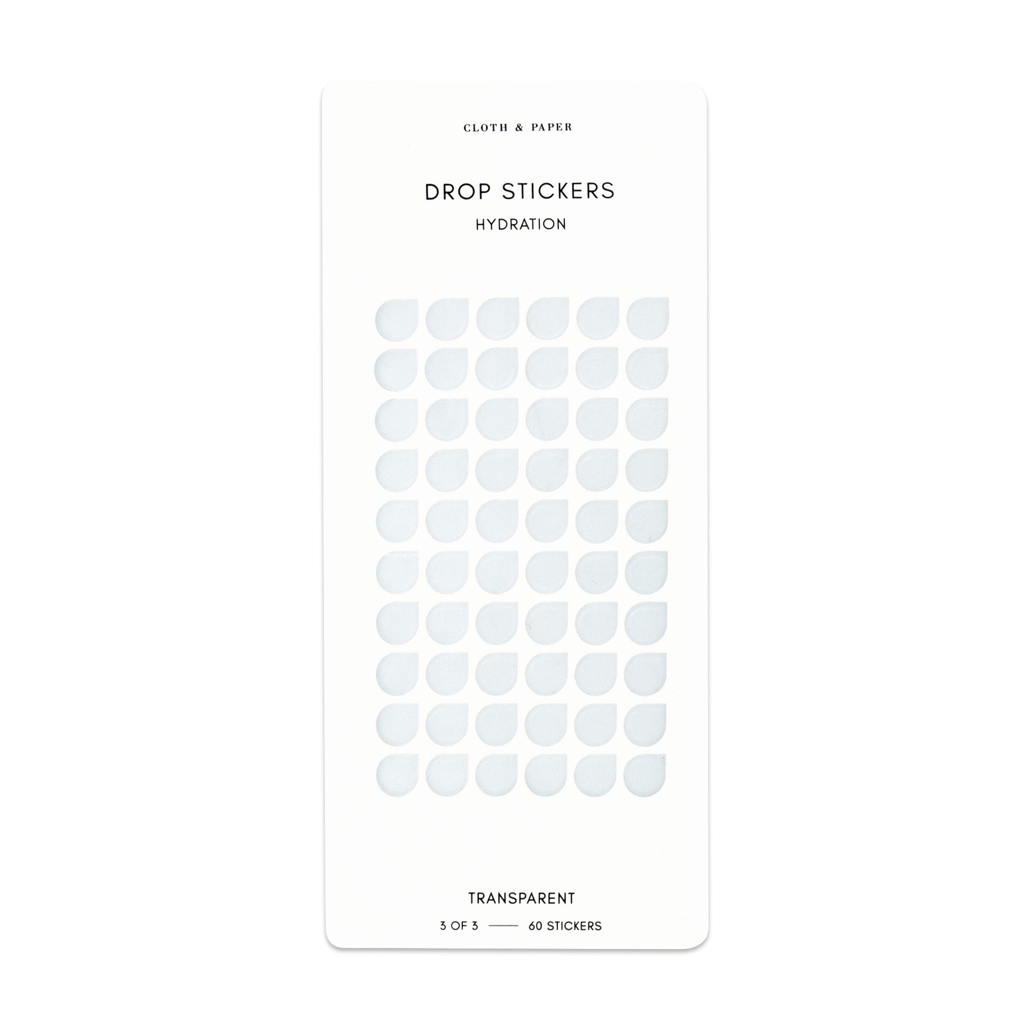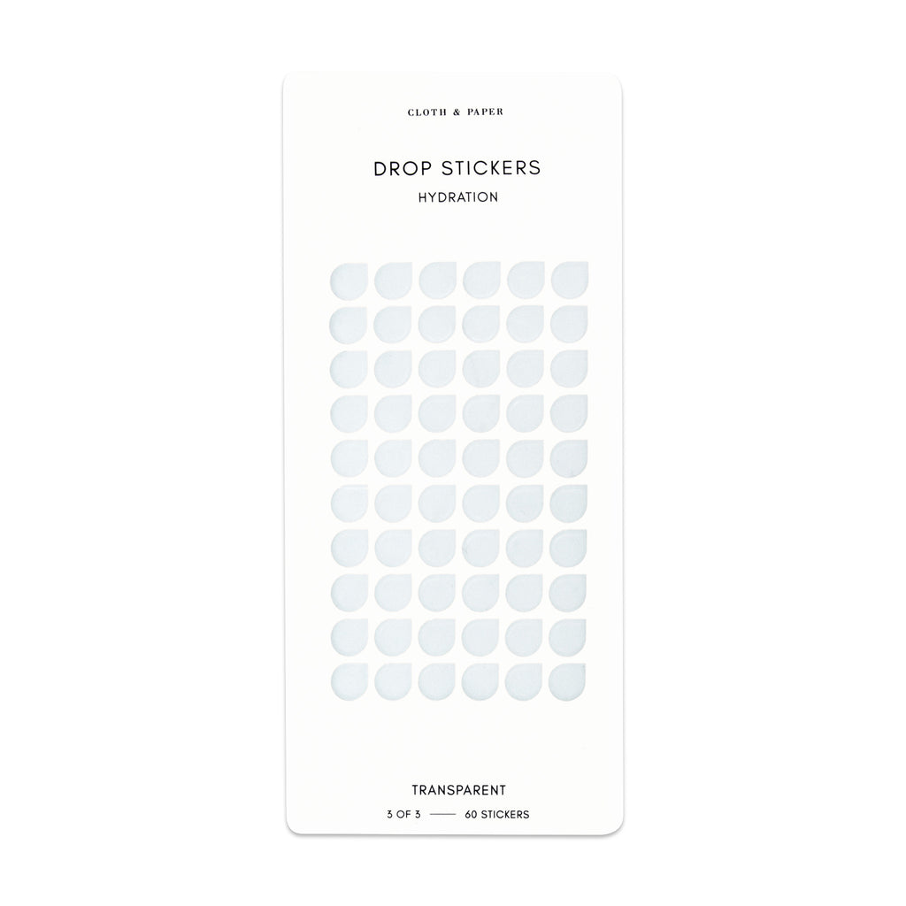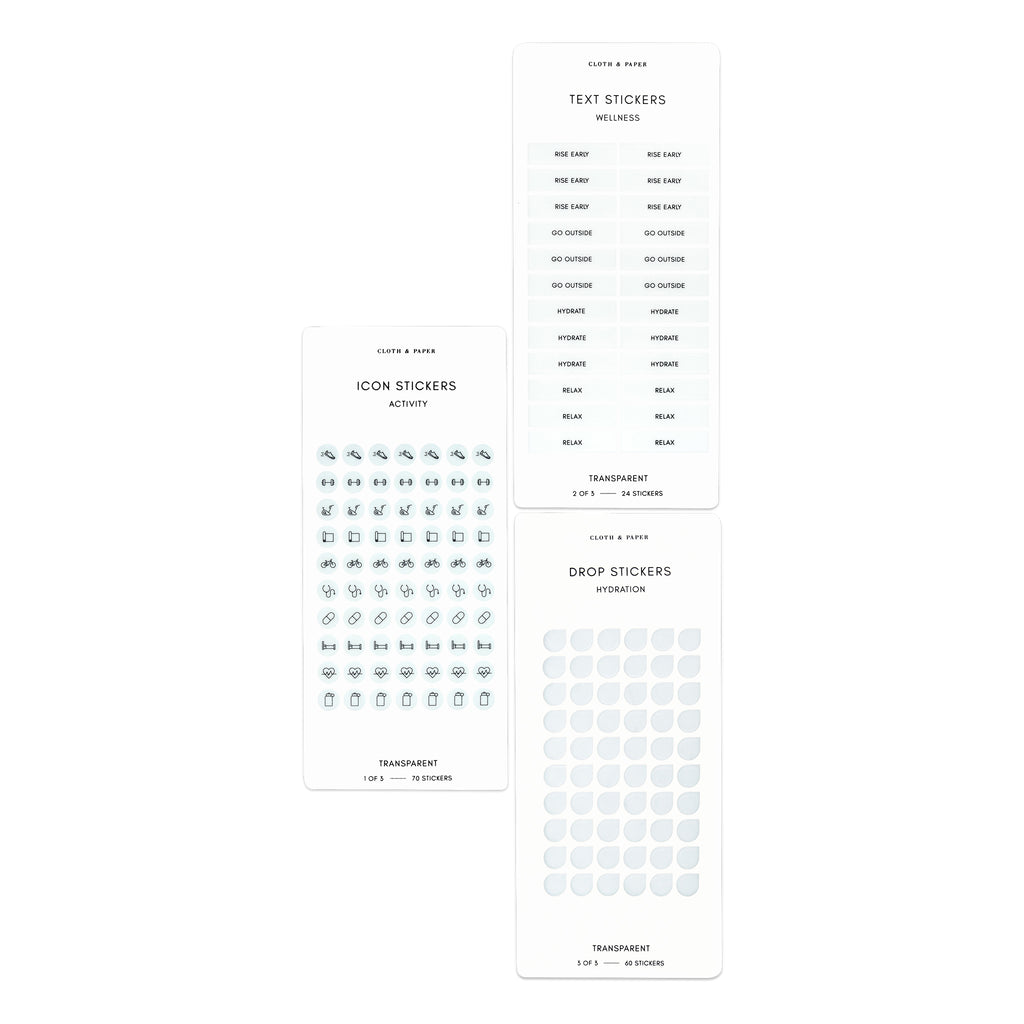 Wellness stickers on transparent Aspen paper with icons, text, and hydration drops to support healthy routines.