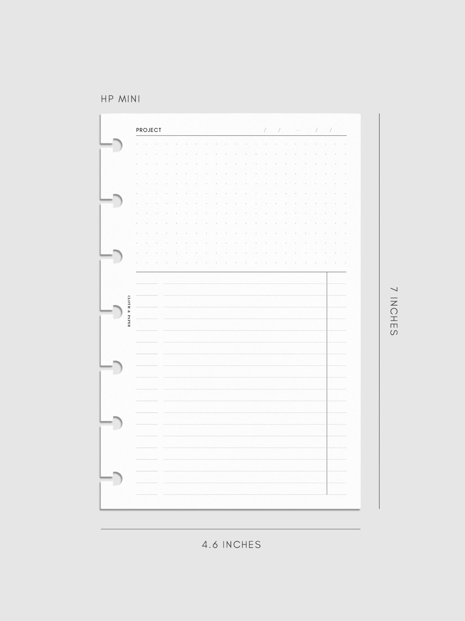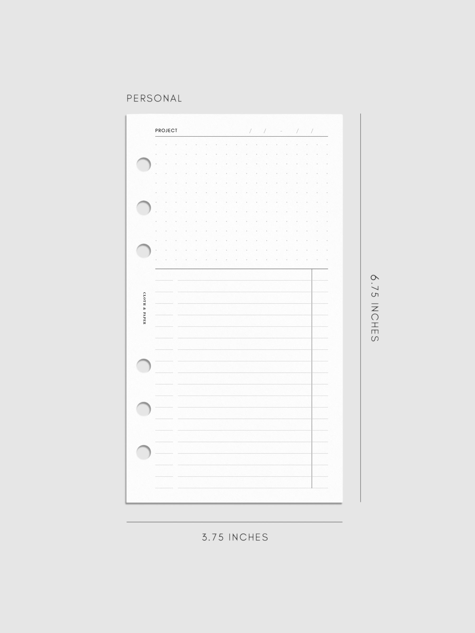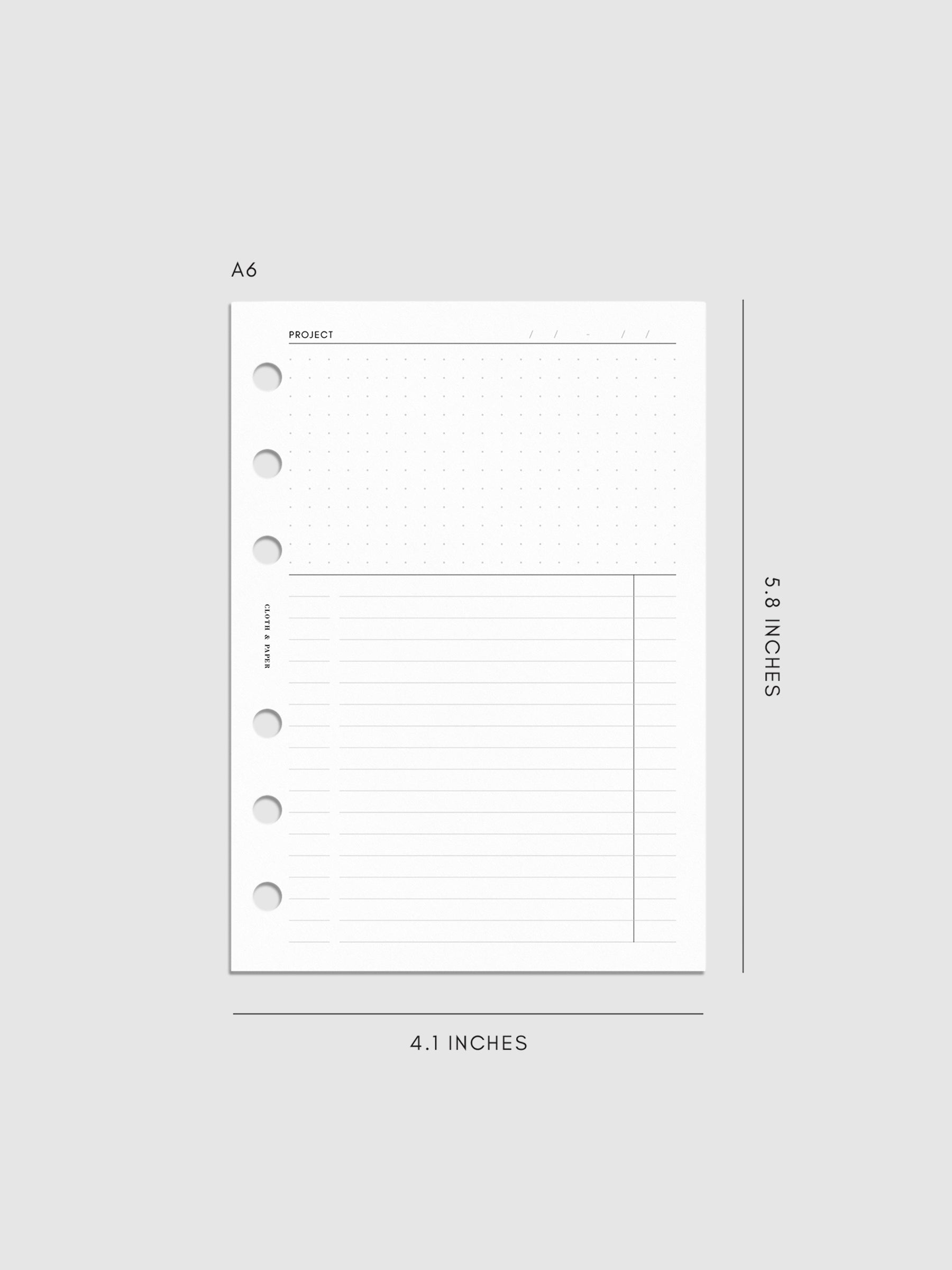 A planner insert with timeline and project pages, combining checklists and dot grid sections for planning.