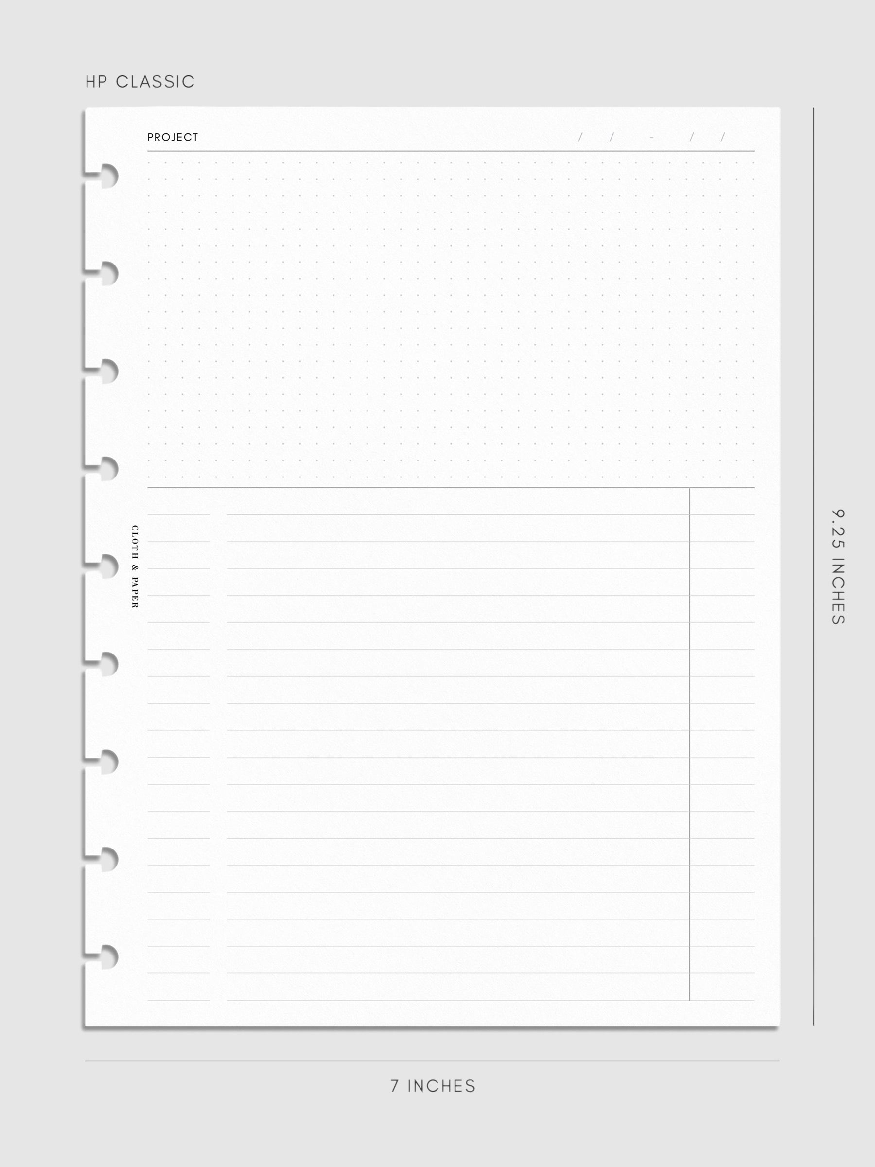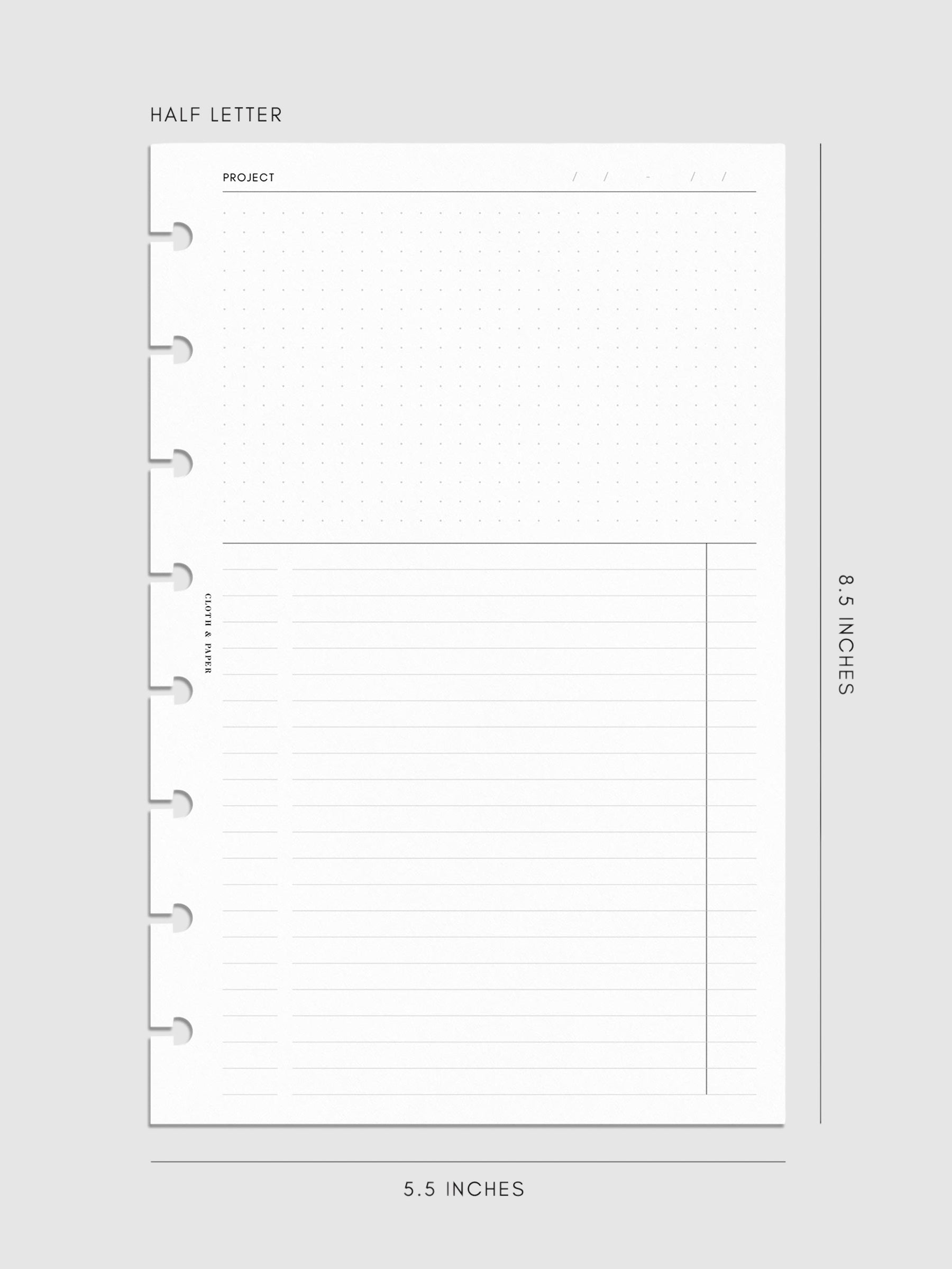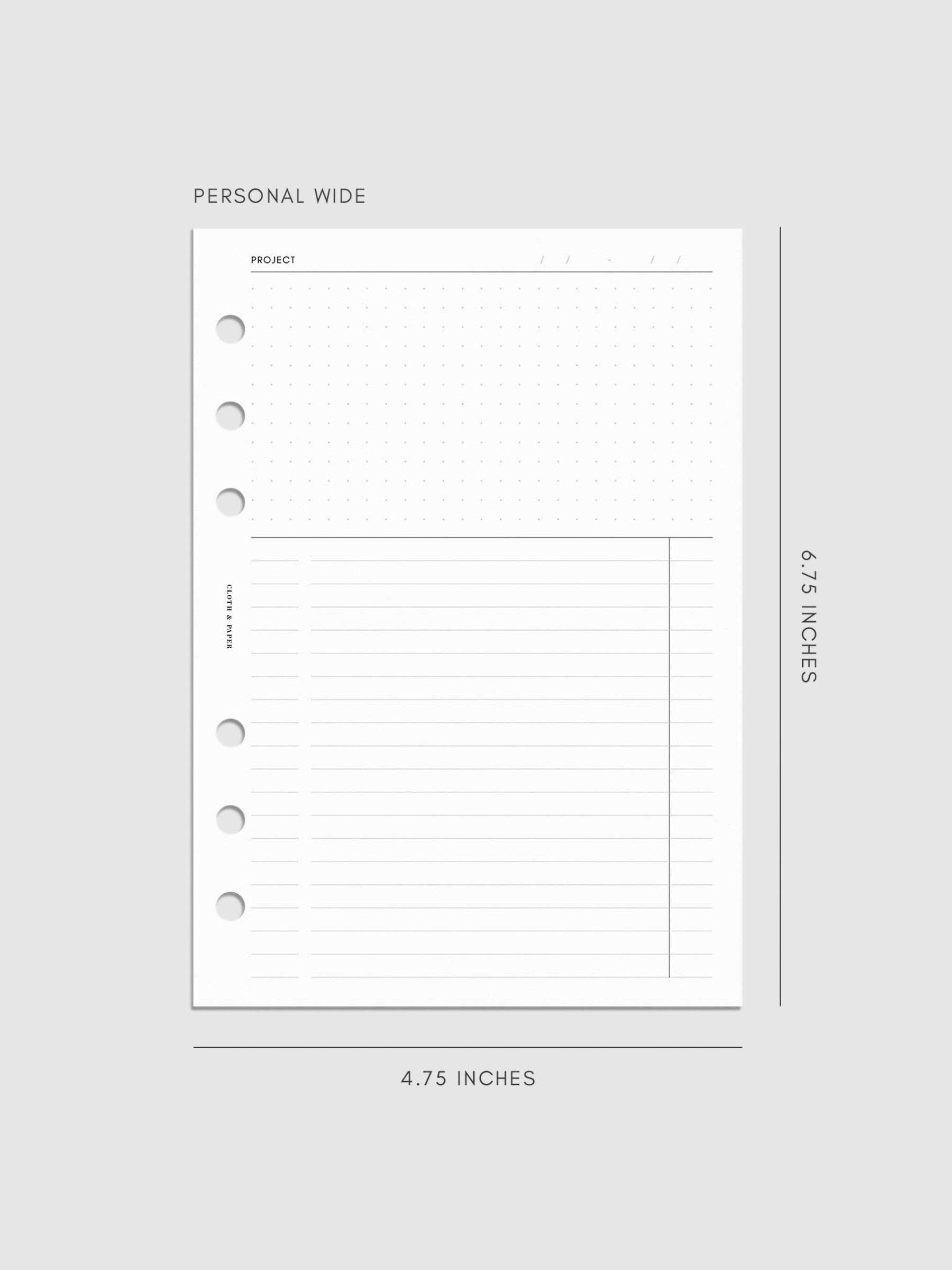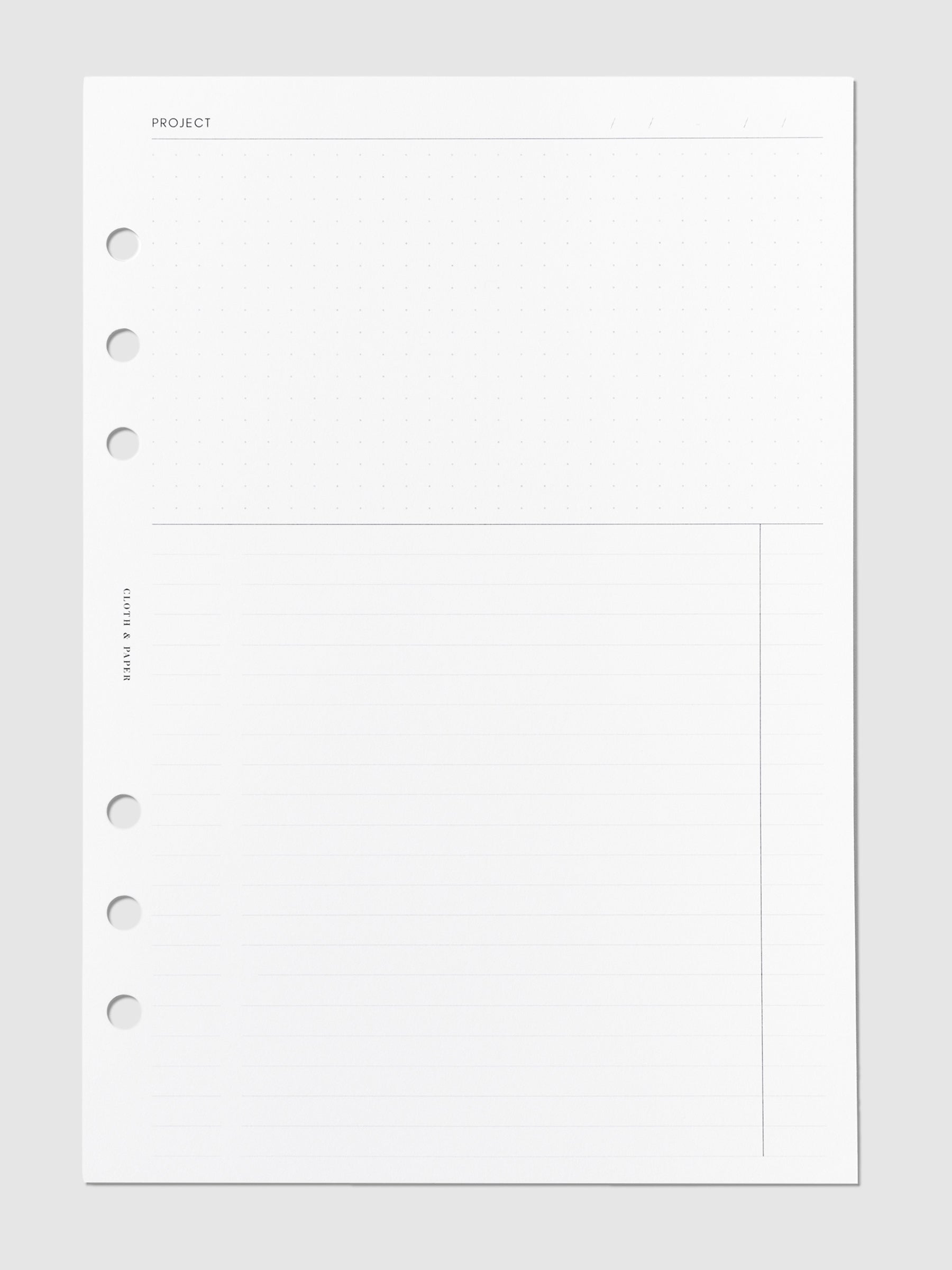 A planner insert with timeline and project pages, combining checklists and dot grid sections for planning.