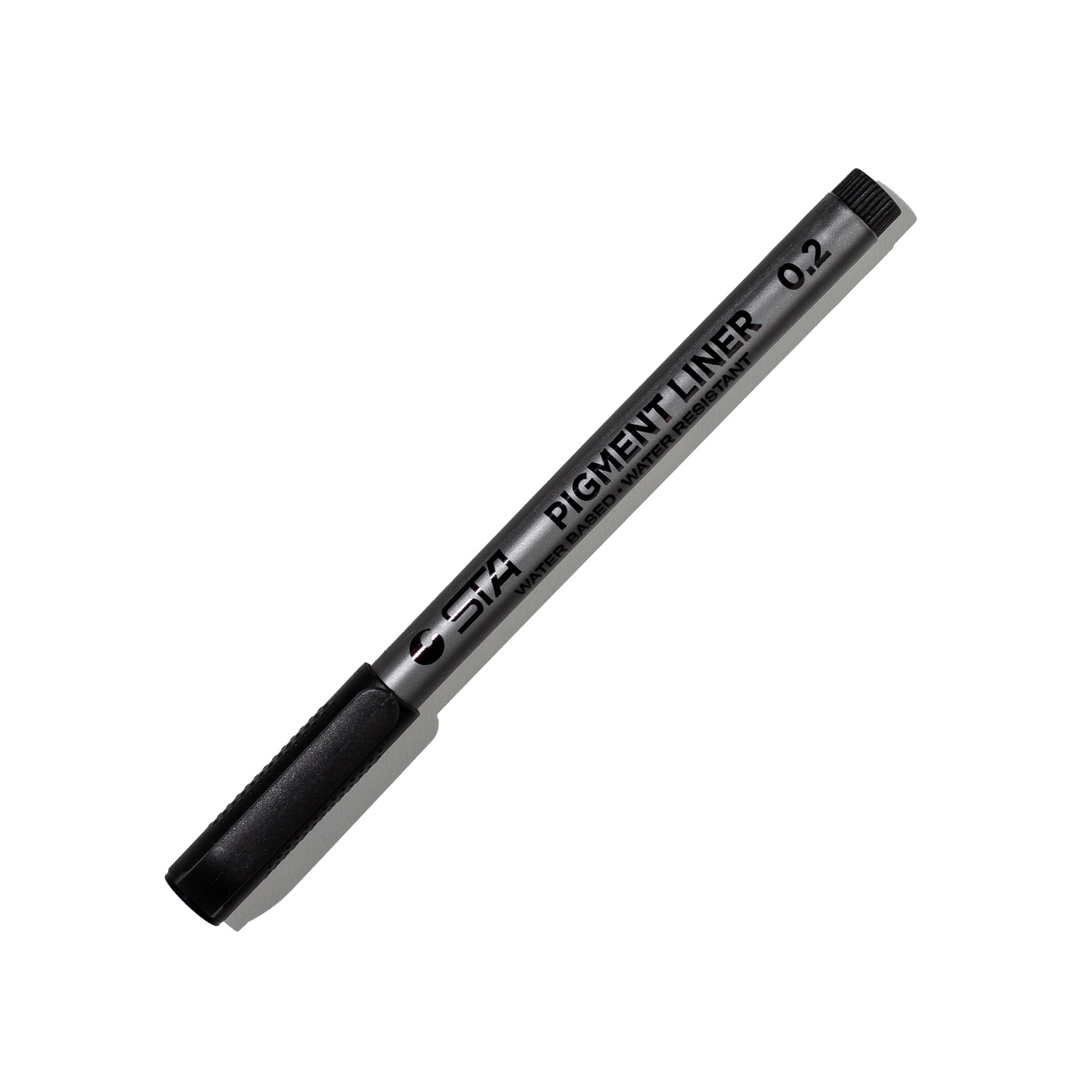 A precise 0.2 mm fineliner with black ink and a needle tip for detailed writing or drawing.