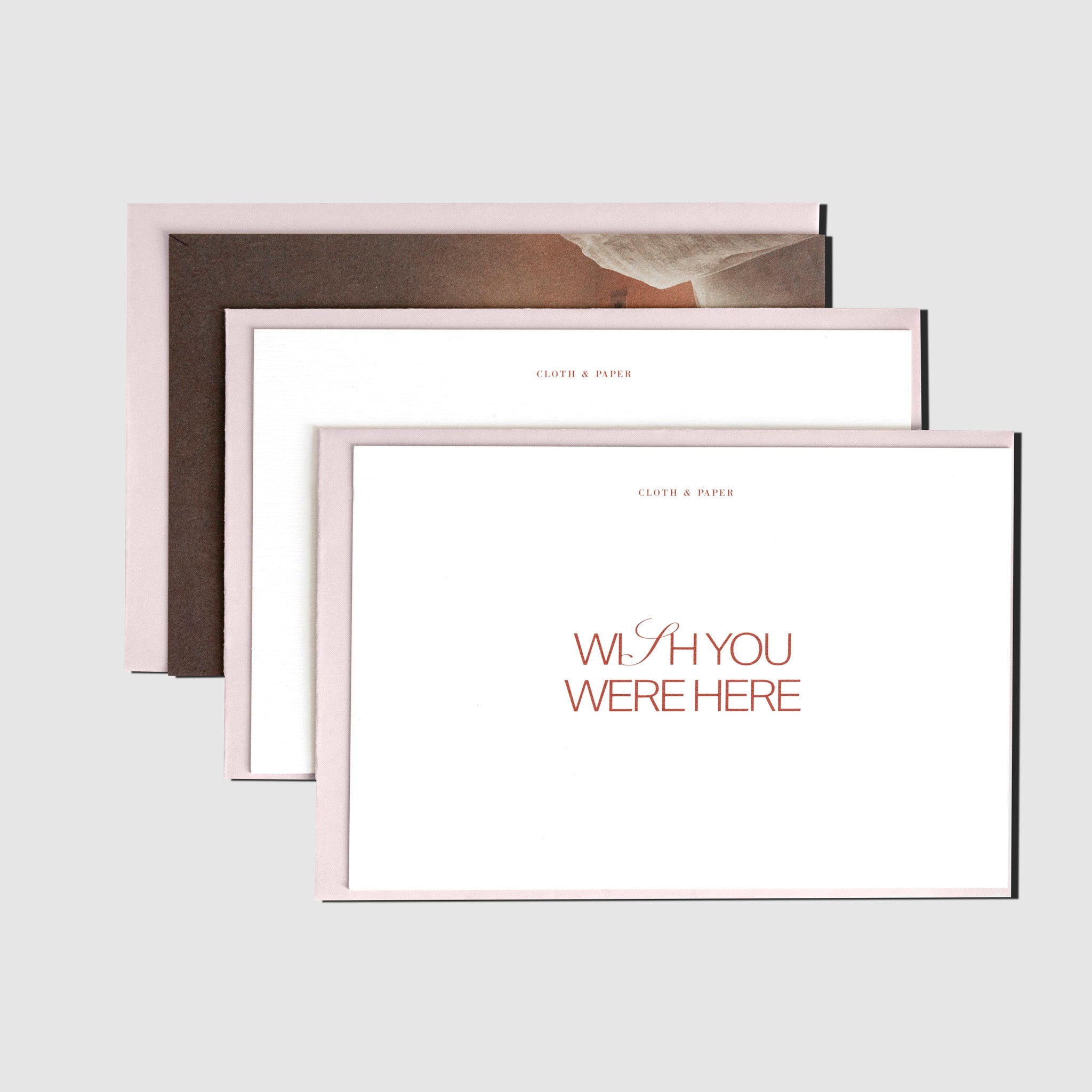 Set of three postcards with matching envelopes, including one fully printed card and two text-based designs, ideal for personal notes or correspondence.