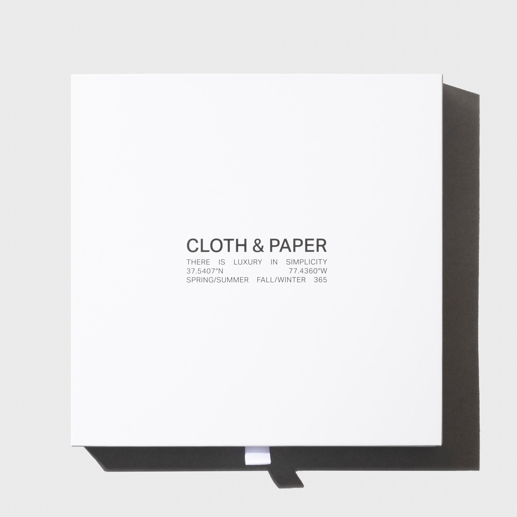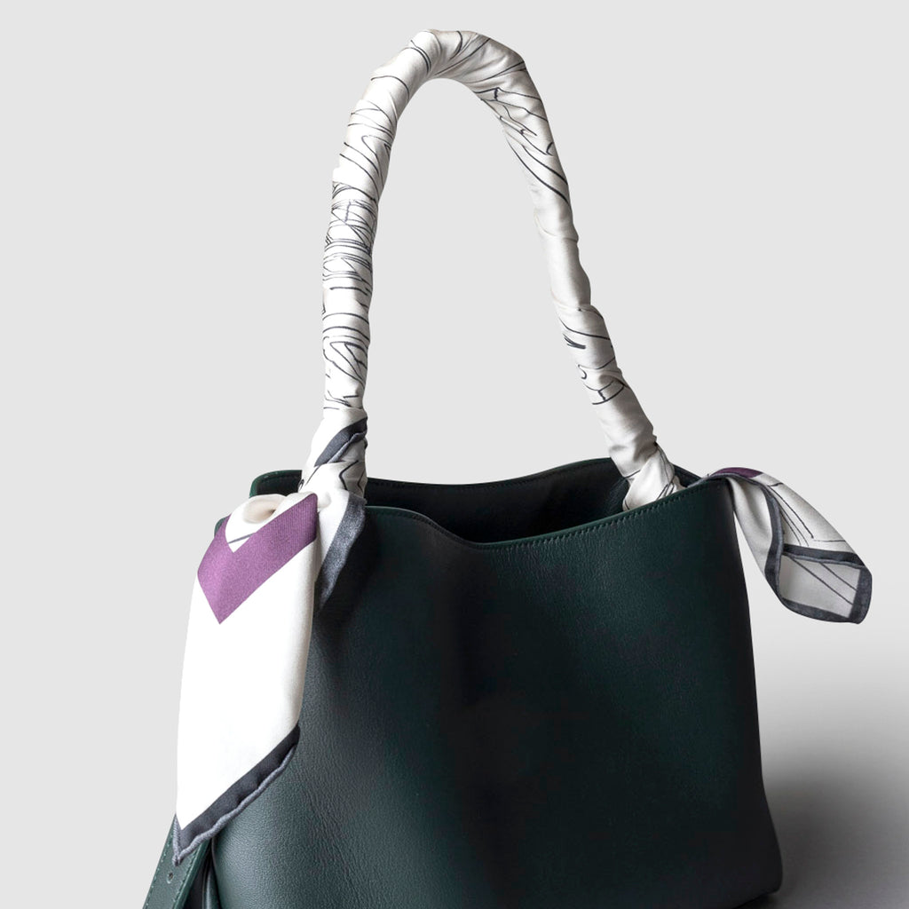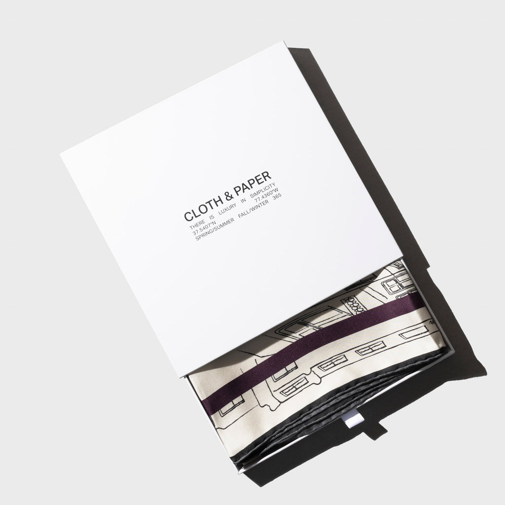 Silk Scarf | Pueblo with printed purple accents on white silk, measuring 24 x 24 inches, packaged in a C&P branded storage box.