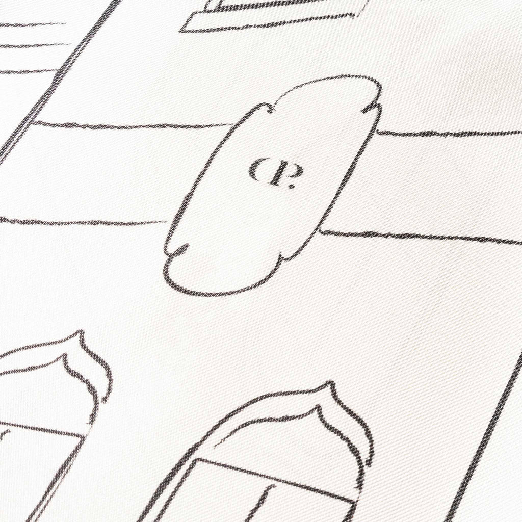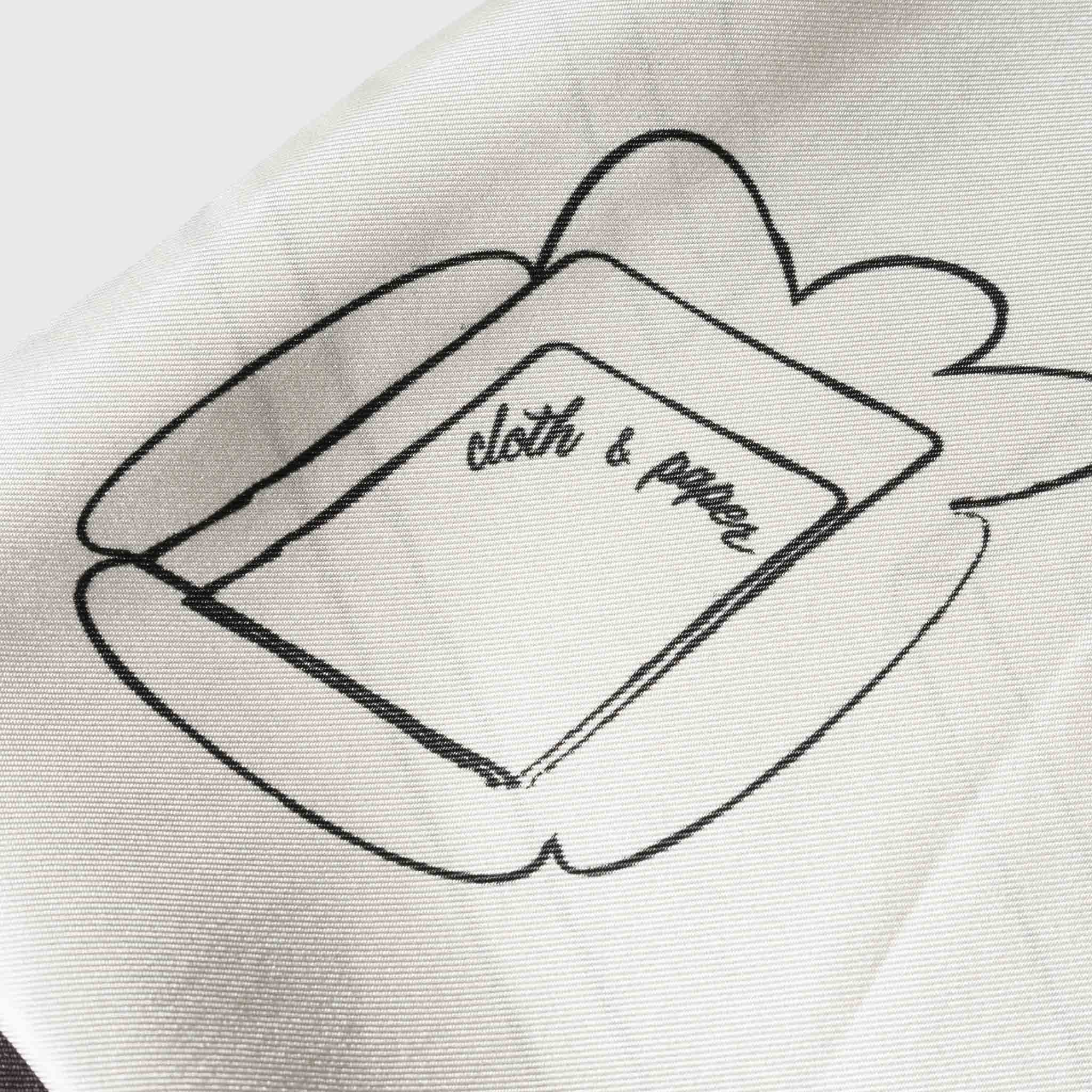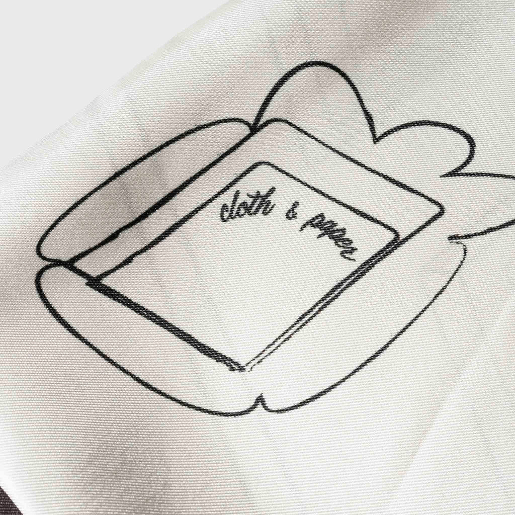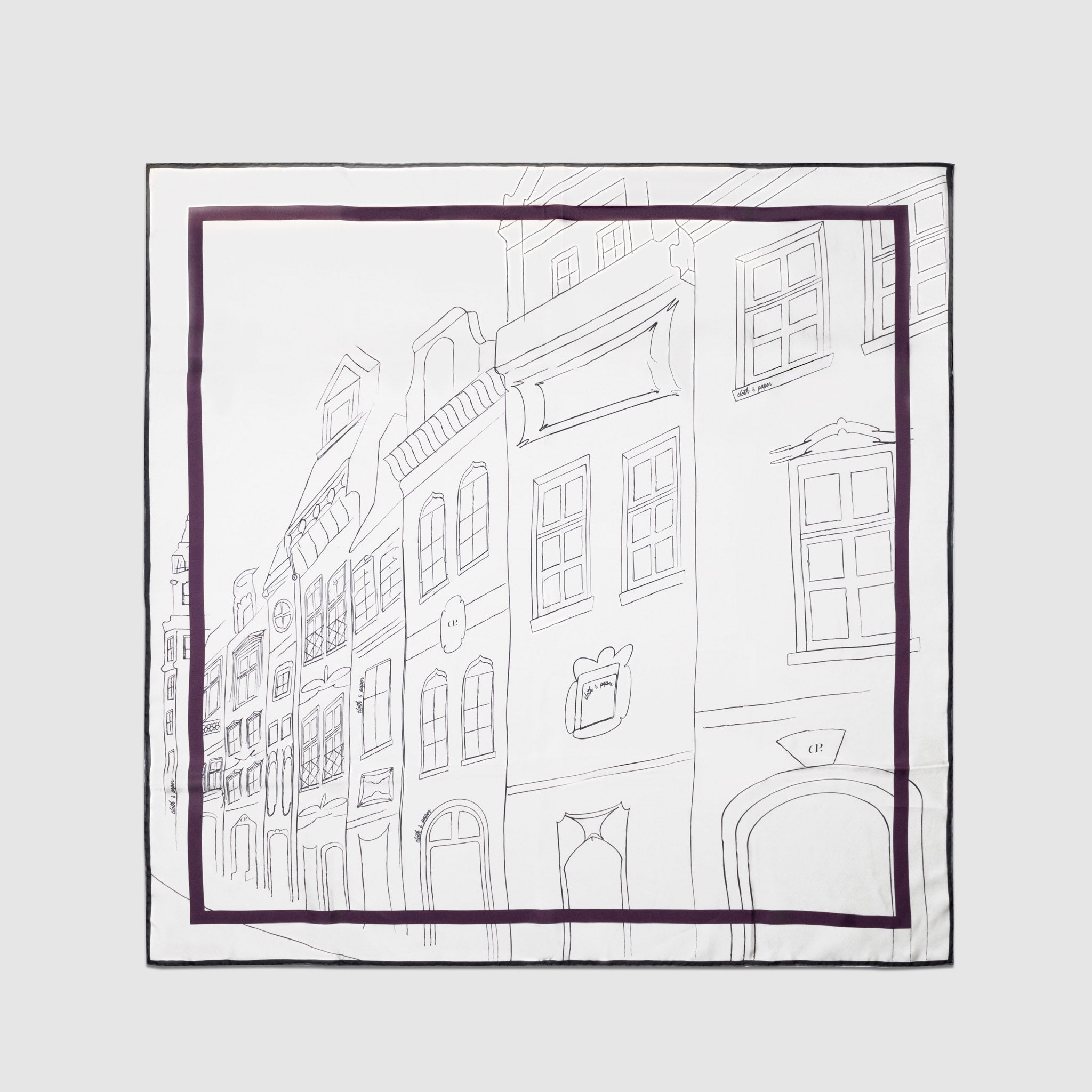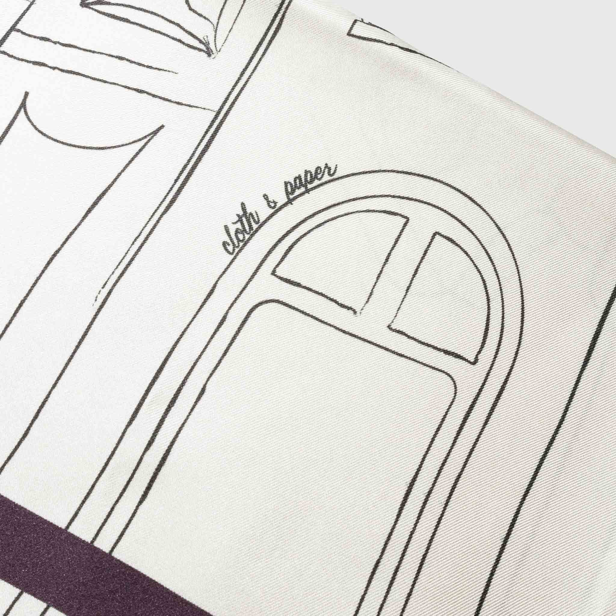 Silk Scarf, Pueblo, Cloth and Paper. Scarf displayed on a neutral background. It features a hand-drawn pattern with buildings and purple accents.