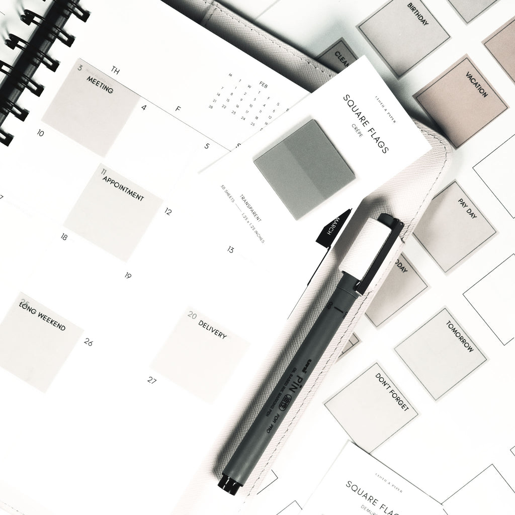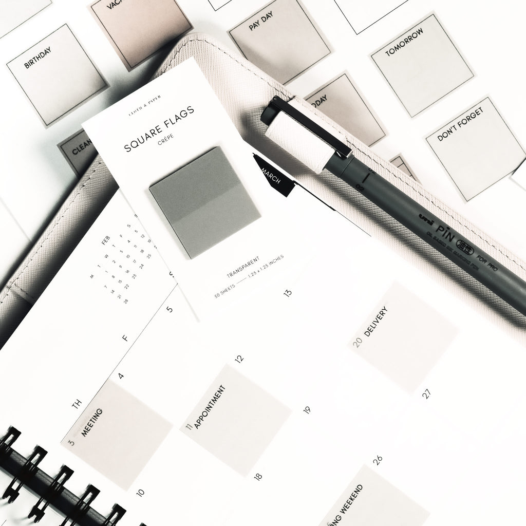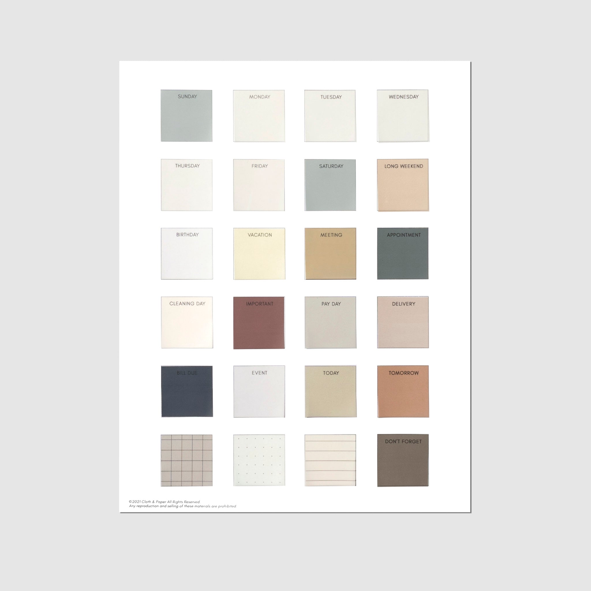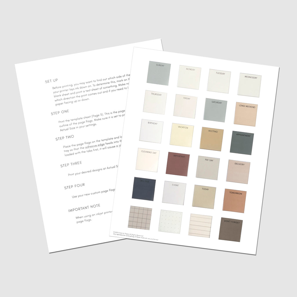A digital PDF printable with page flag templates featuring days of the week, notes, and grid patterns.