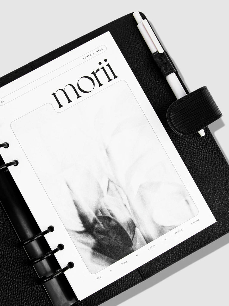 A textured off-white paper planner dashboard printed in black ink with the word Morii and its meaning.