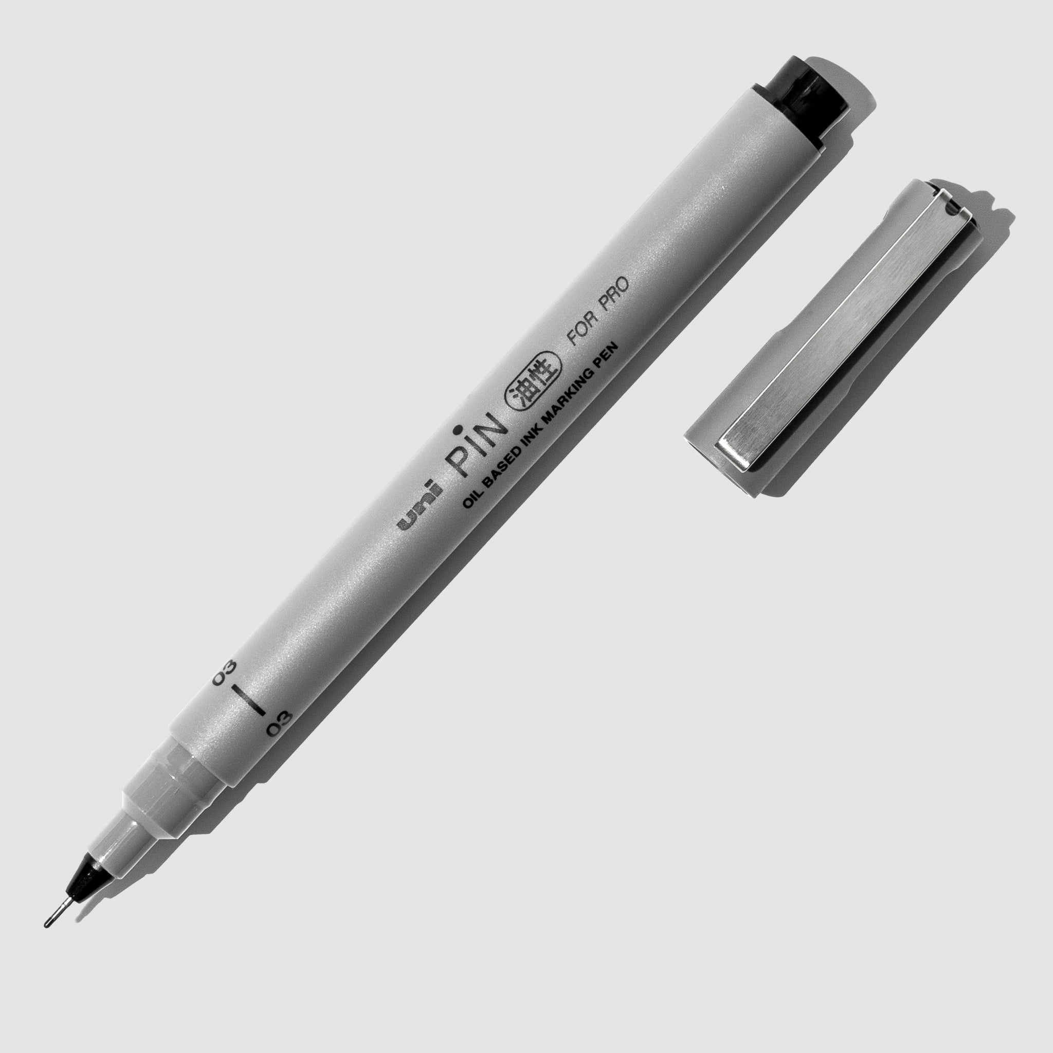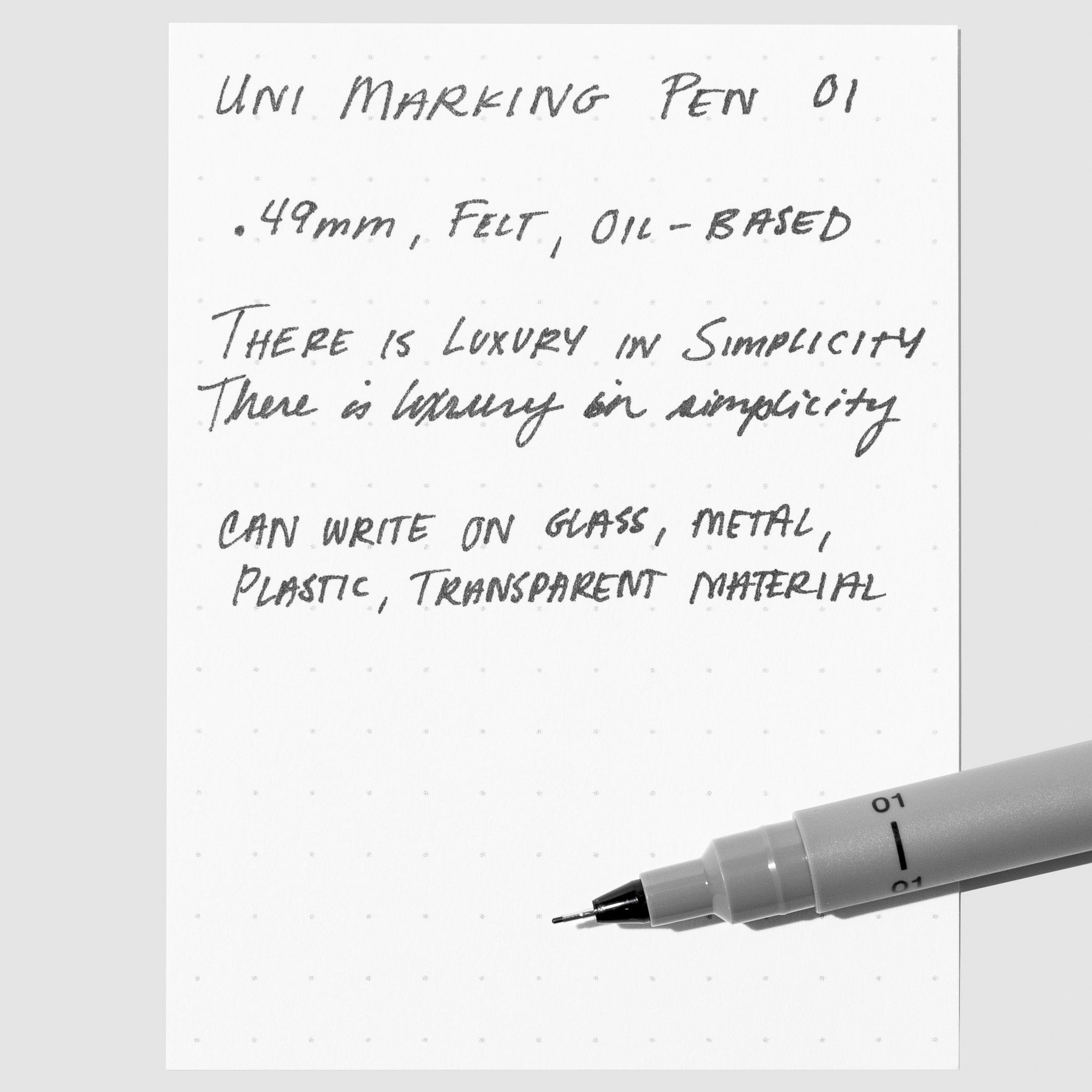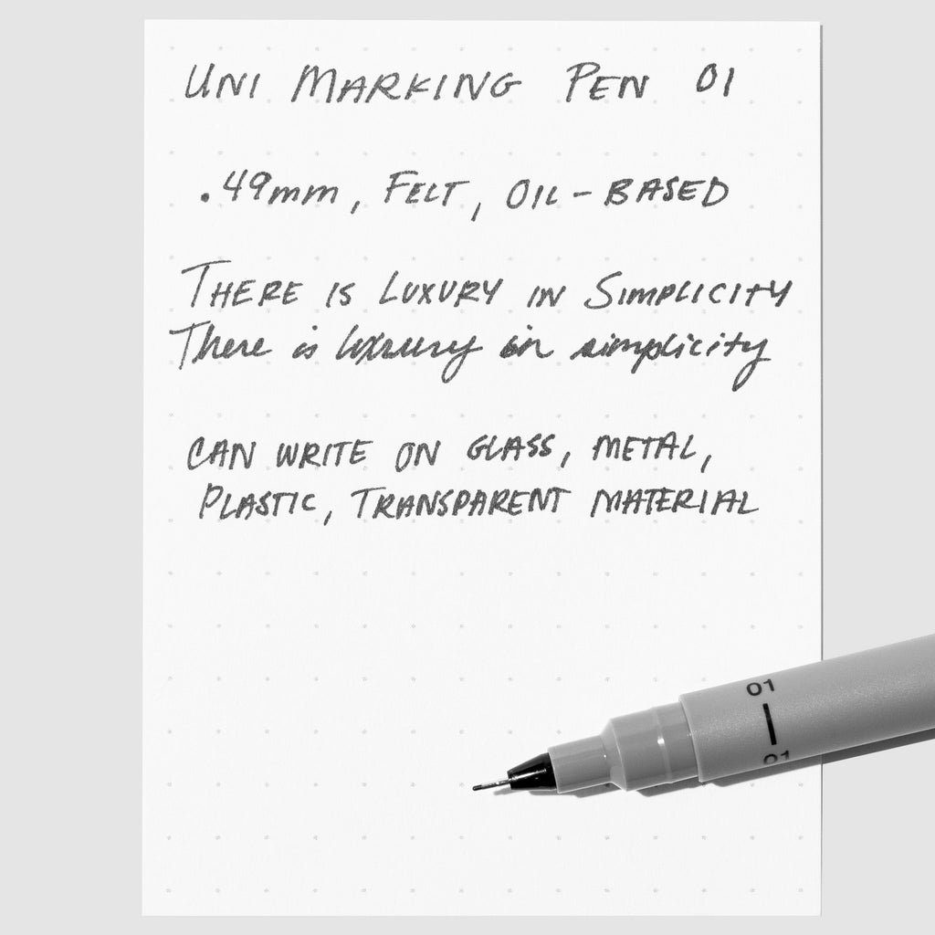 Uni Pin Marking Pen, 01, Cloth and Paper. Pen against a neutral background.