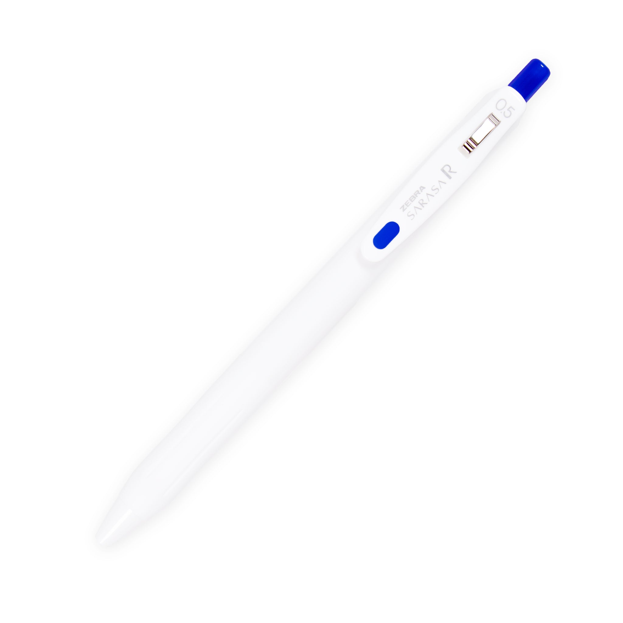 Zebra Sarasa R Pen, 0.5 mm, Blue, Cloth and Paper. Pen with nib exposed turned to the right against a neutral background.