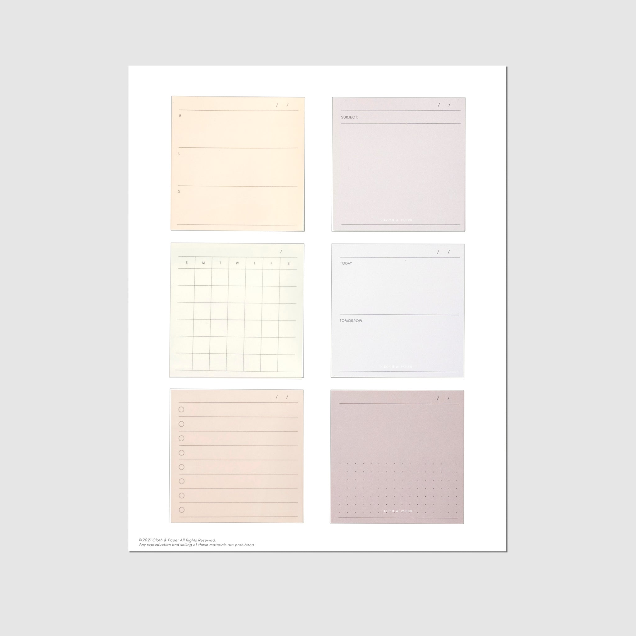 A digital PDF printable with six sticky note designs for 3x3 pads, offering customizable planning layouts.