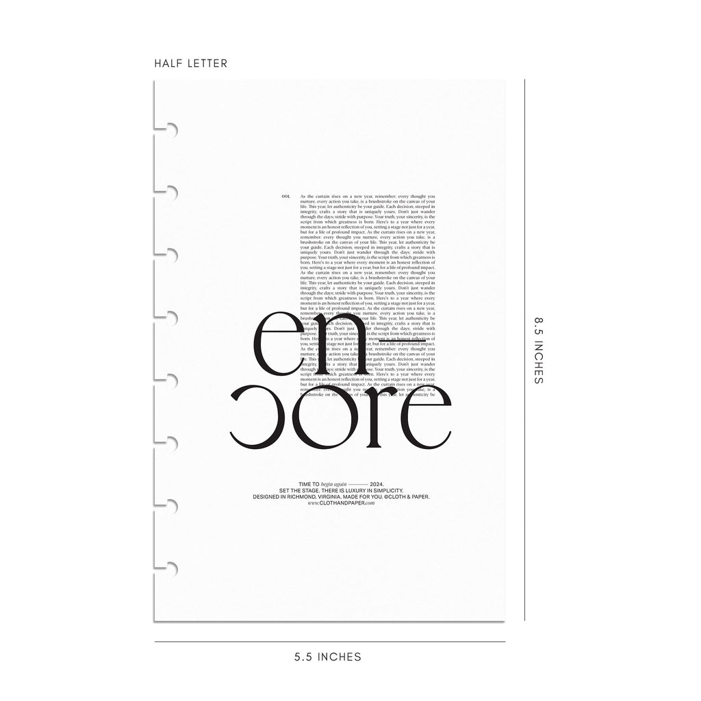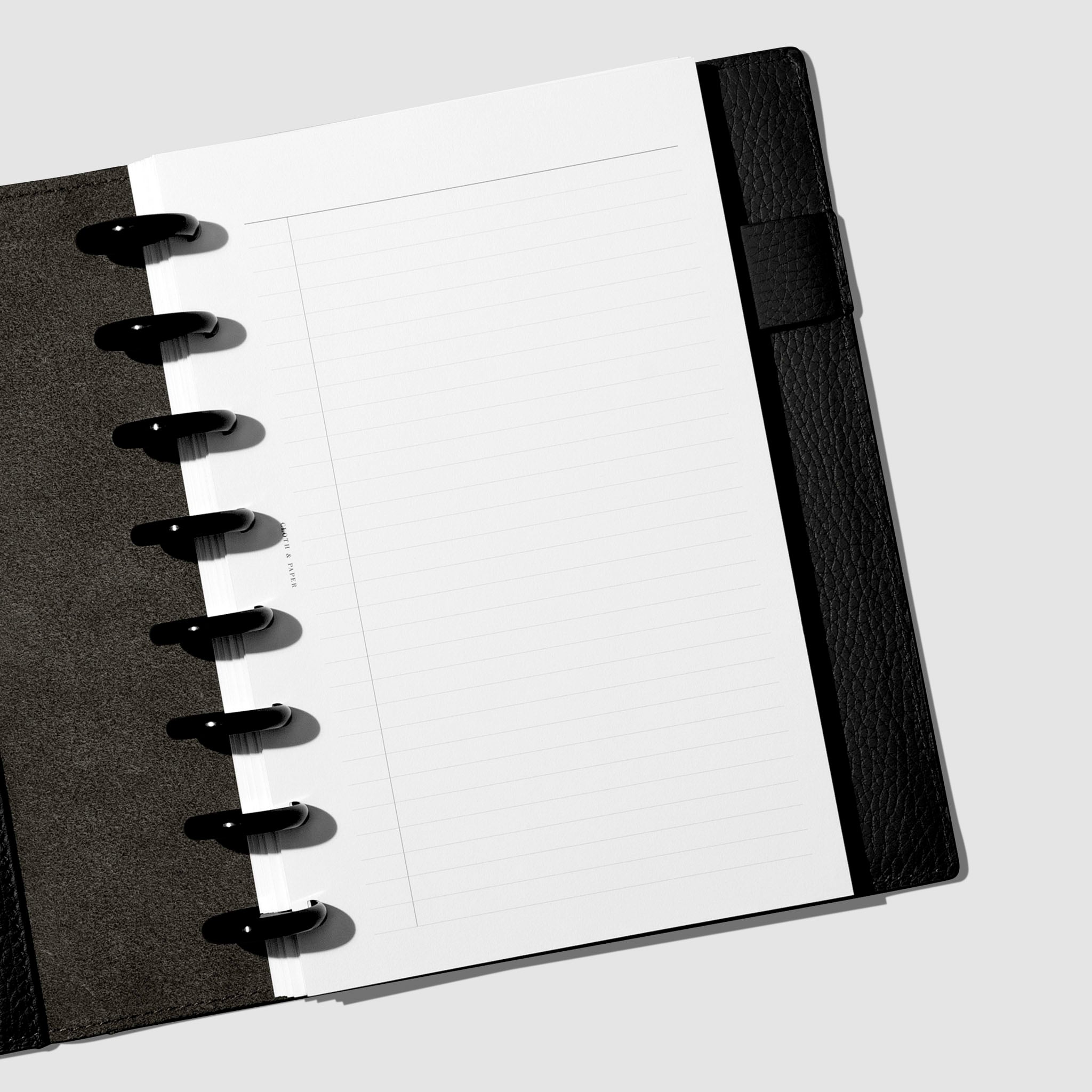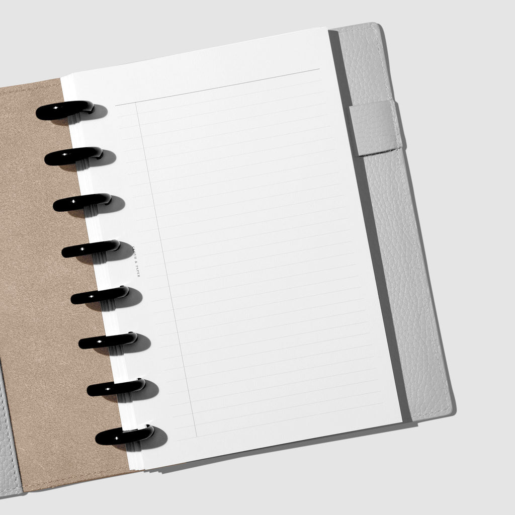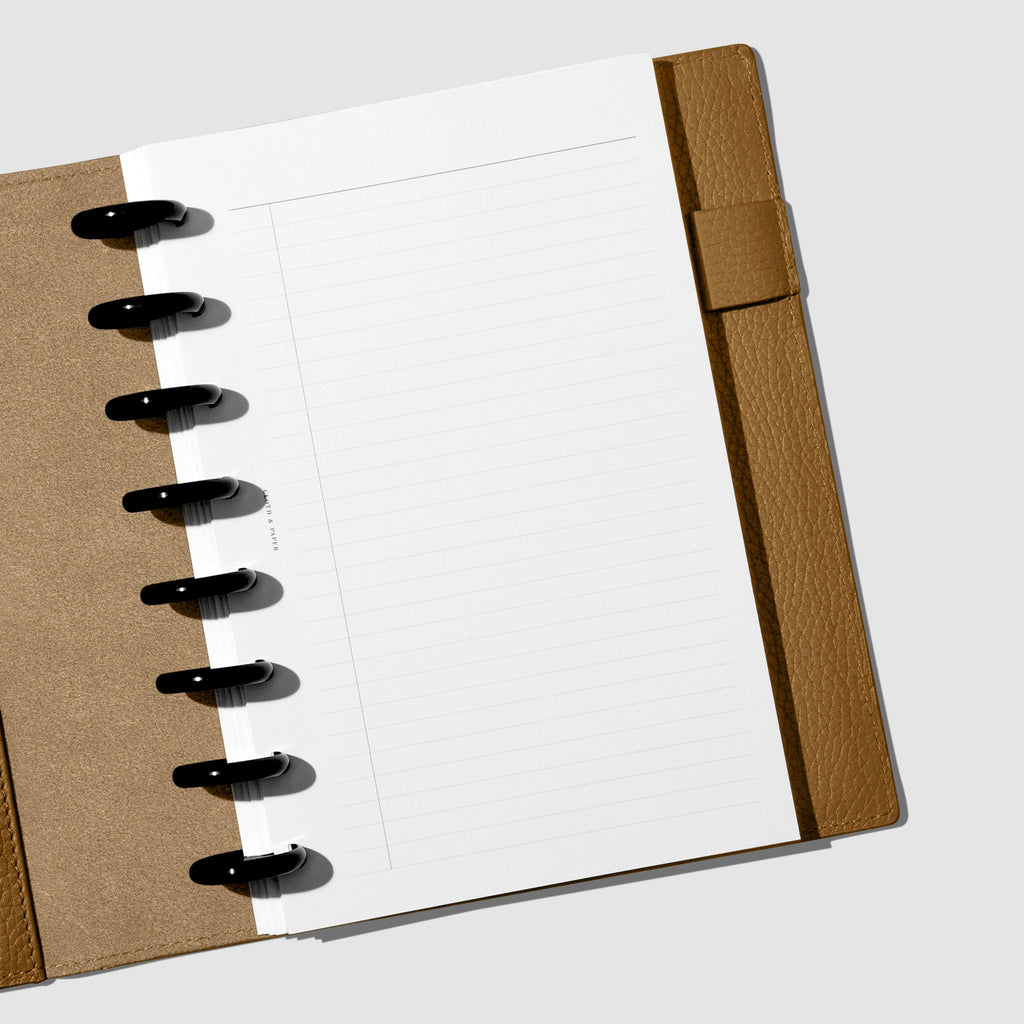 A handcrafted Half Letter leather folio made in Spain, featuring silver foil stamping, multiple storage pockets, and compatibility with Half Letter discbound systems and A5 Spiral notebooks.