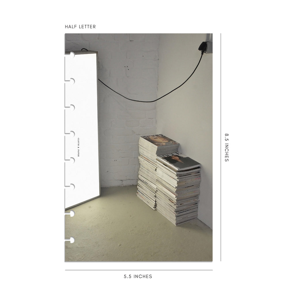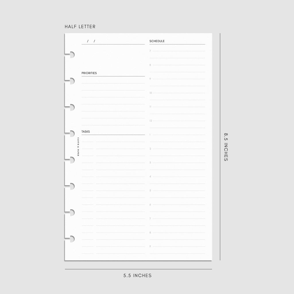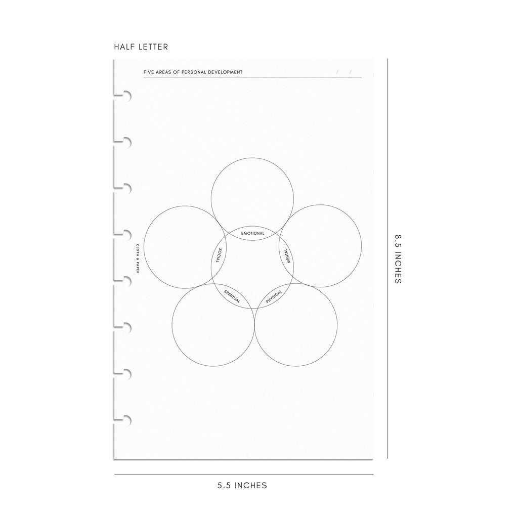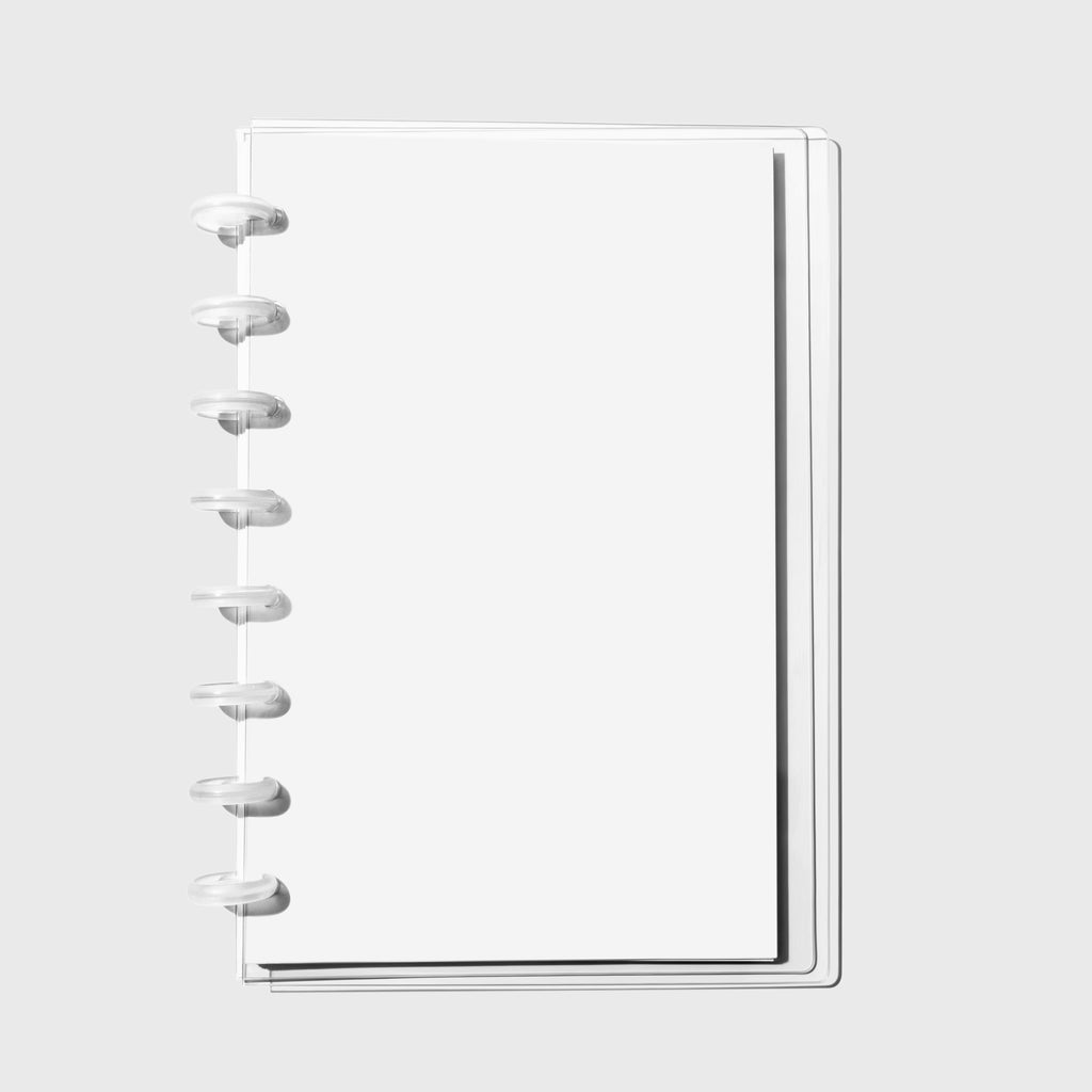 A handcrafted Half Letter leather folio made in Spain, featuring silver foil stamping, multiple storage pockets, and compatibility with Half Letter discbound systems and A5 Spiral notebooks.