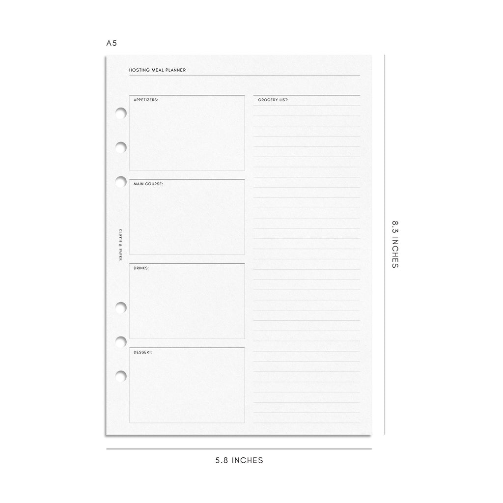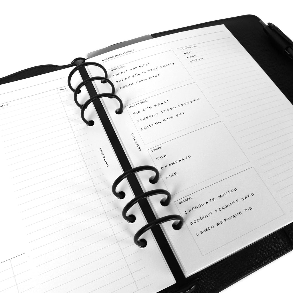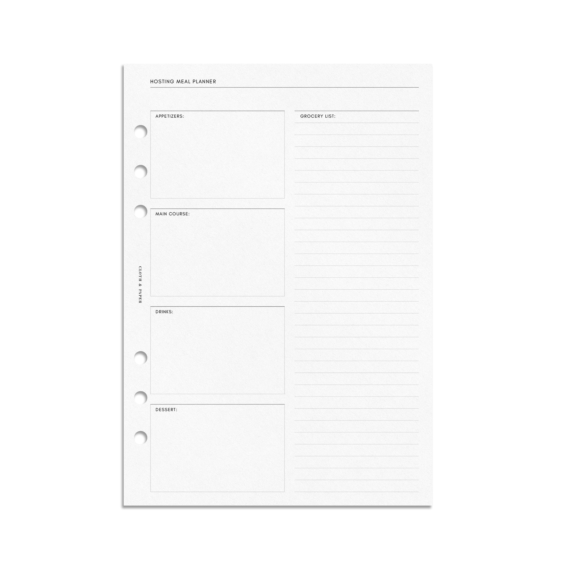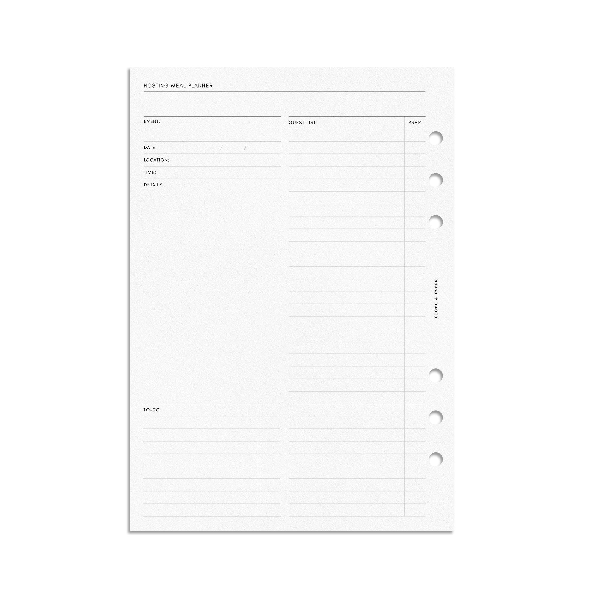 A planner insert with sections for event details, guest lists, menus, and grocery checklists to plan hosting.