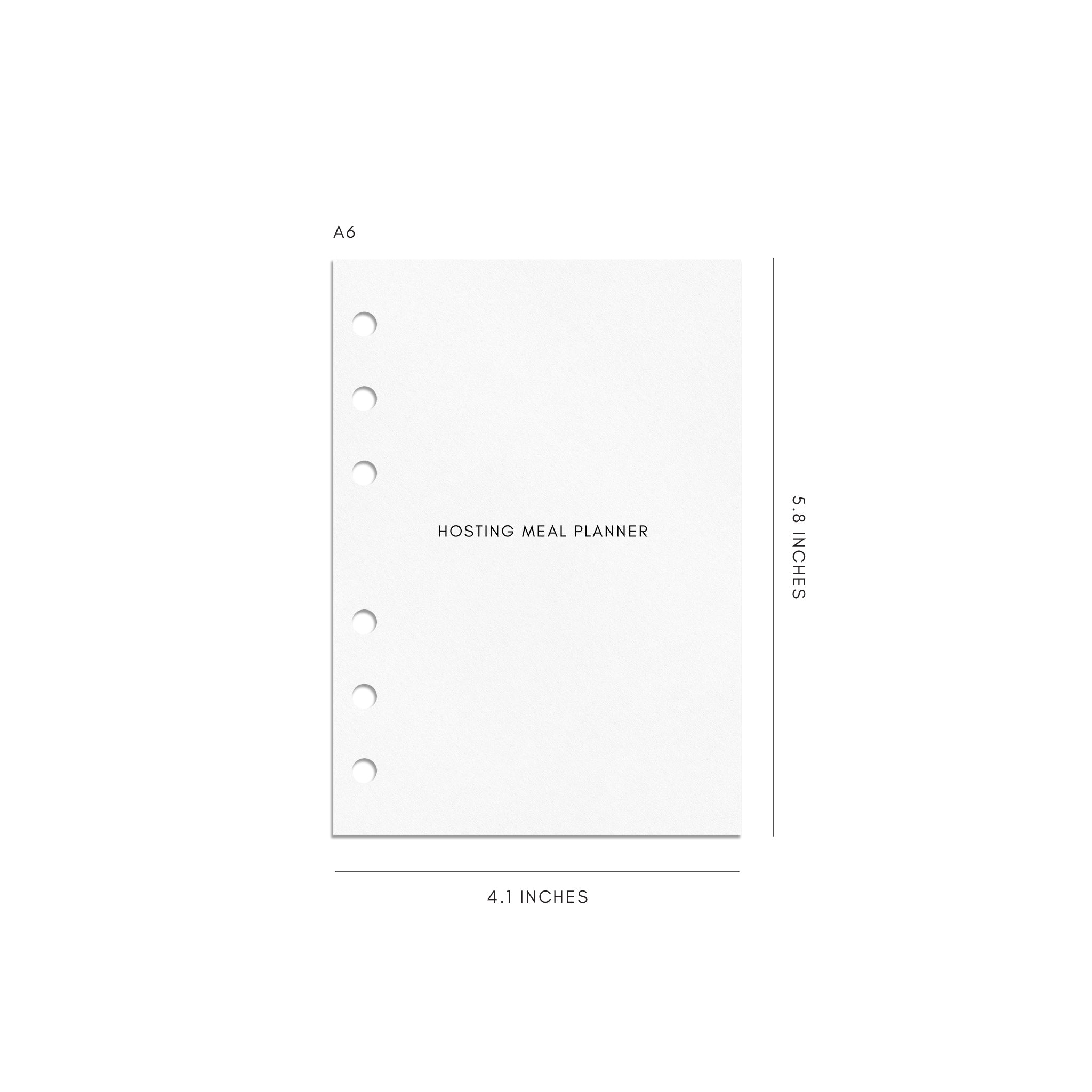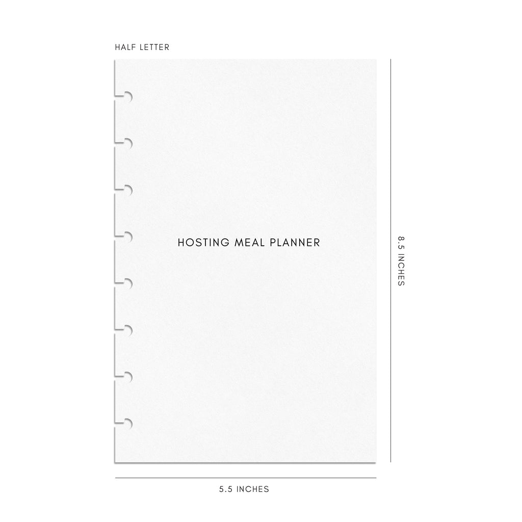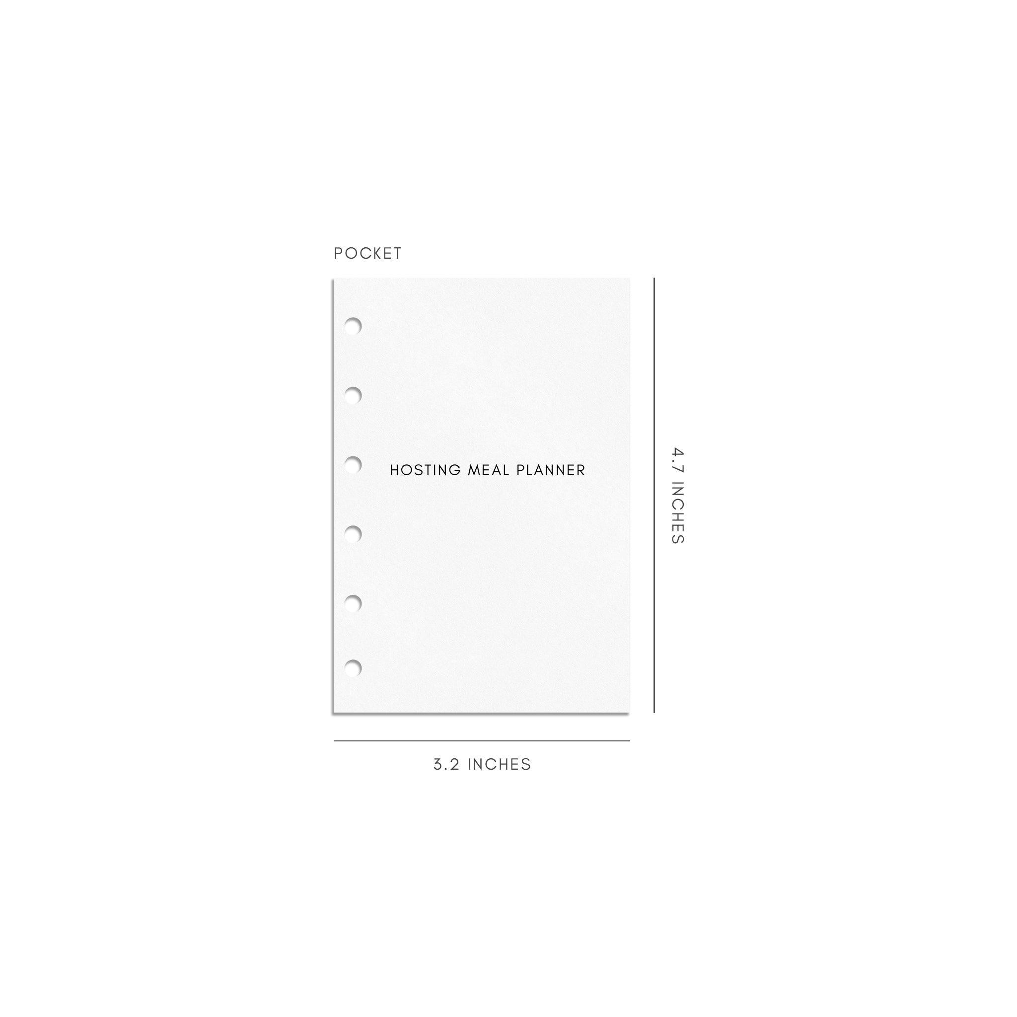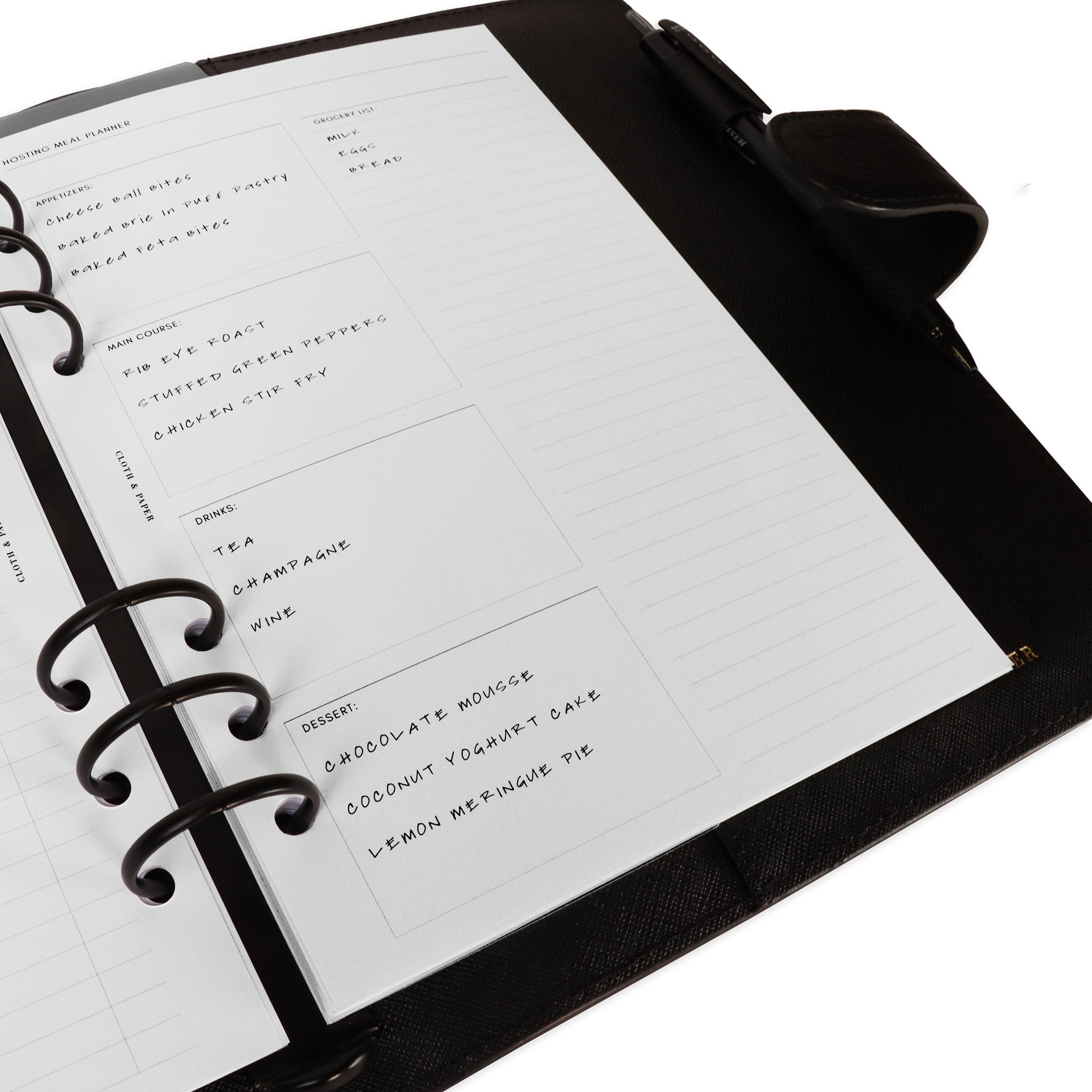 A planner insert with sections for event details, guest lists, menus, and grocery checklists to plan hosting.