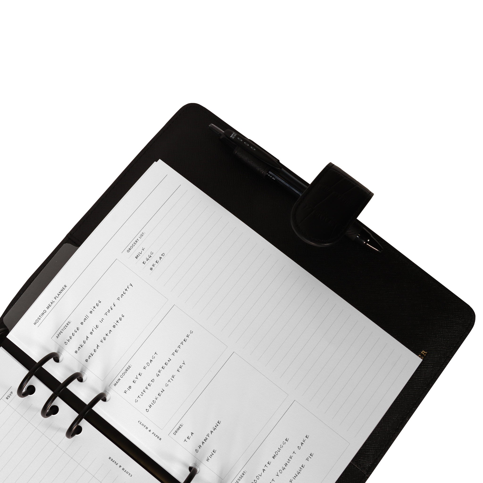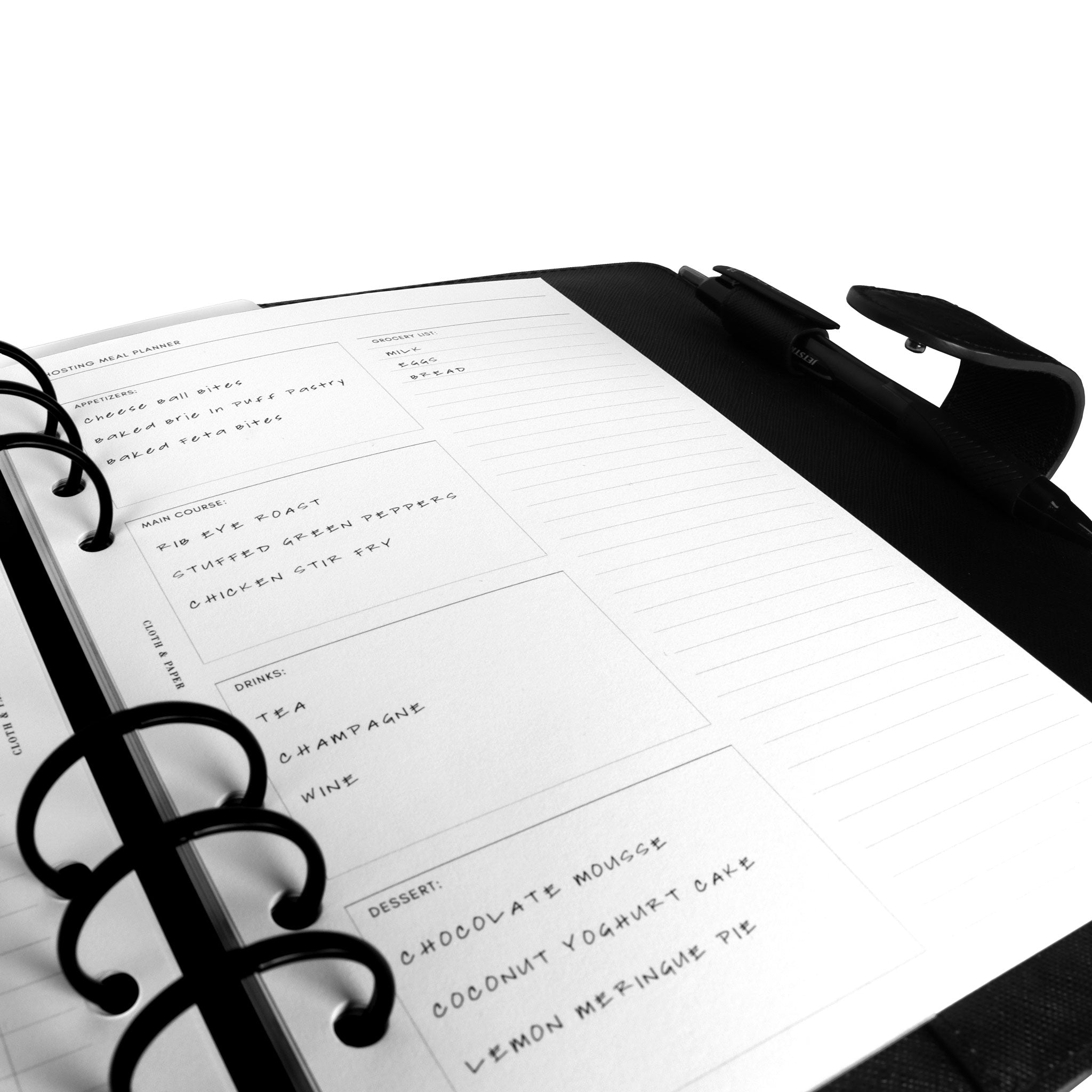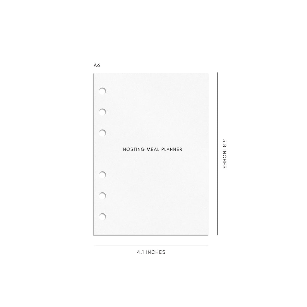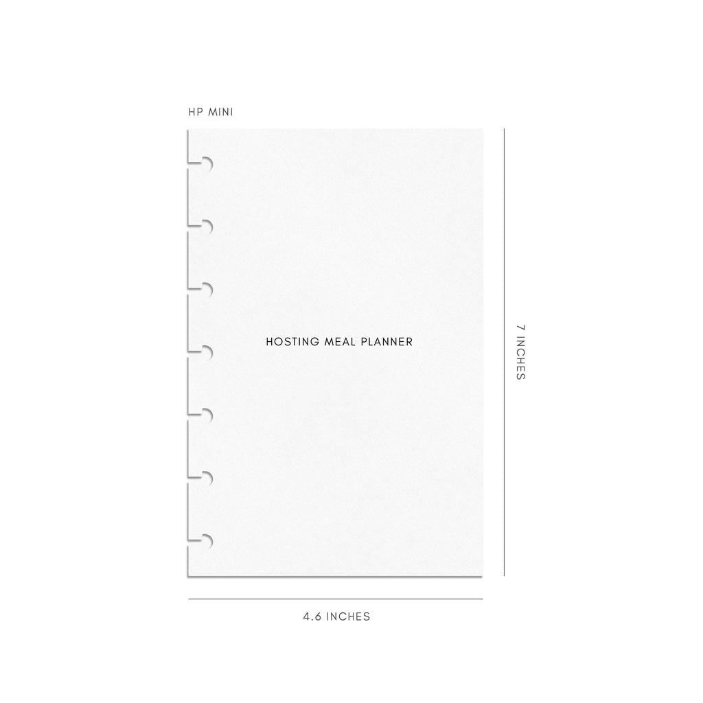 A planner insert with sections for event details, guest lists, menus, and grocery checklists to plan hosting.