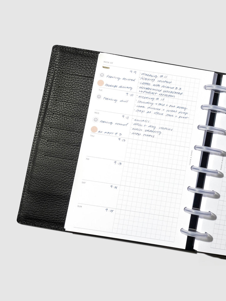 A planner insert with an undated horizontal weekly layout, blank fields for notes, and a graph section for tracking.