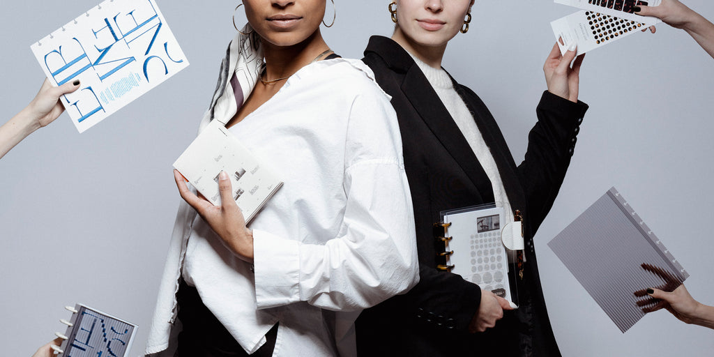 Two models are standing against a light gray background holding planner items from the Front Row Collection as hands coming in from the left and right are attempting to hand them more of these planner essentials.