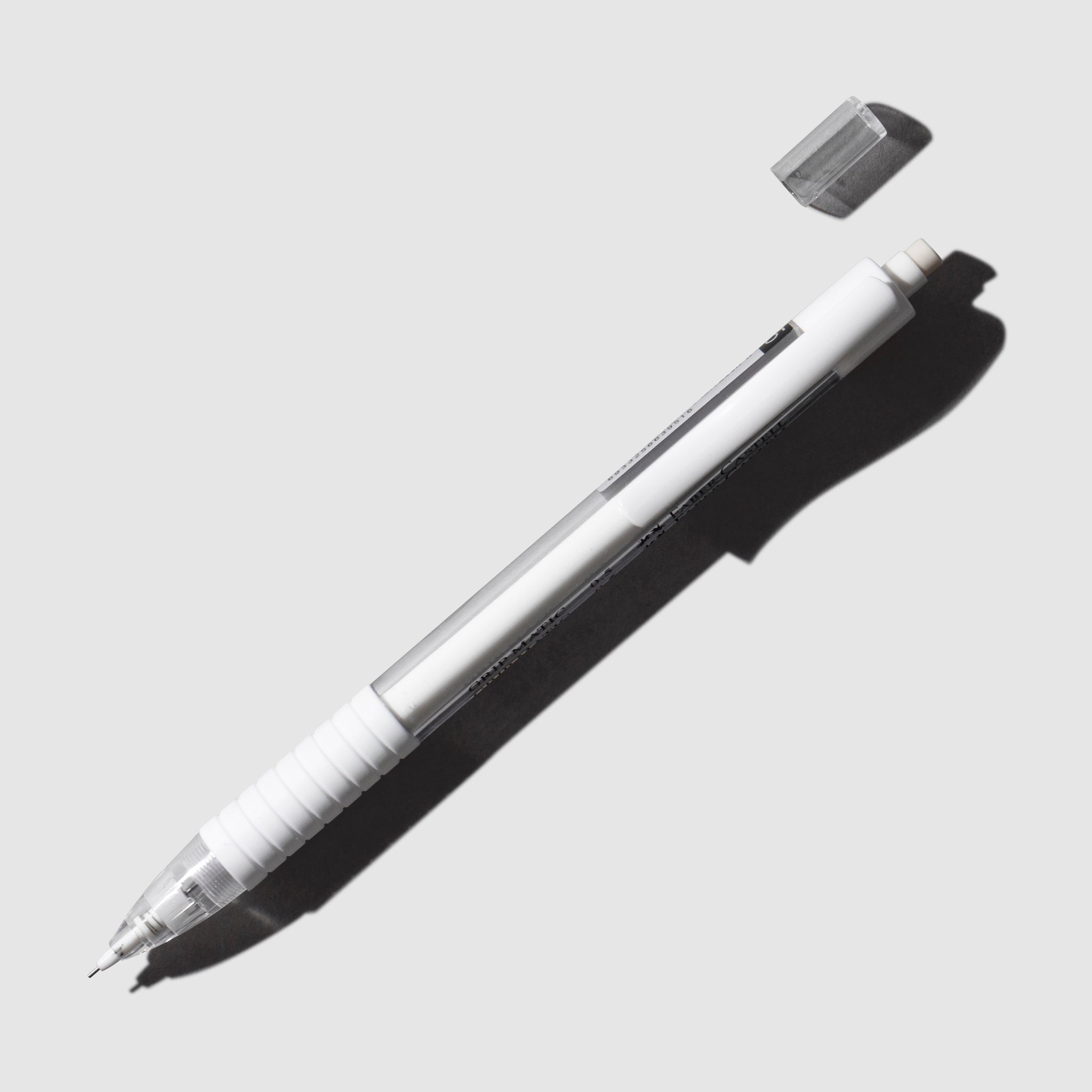 A 0.5 mm mechanical pencil with a cushioned grip, clear barrel, and capped eraser.
