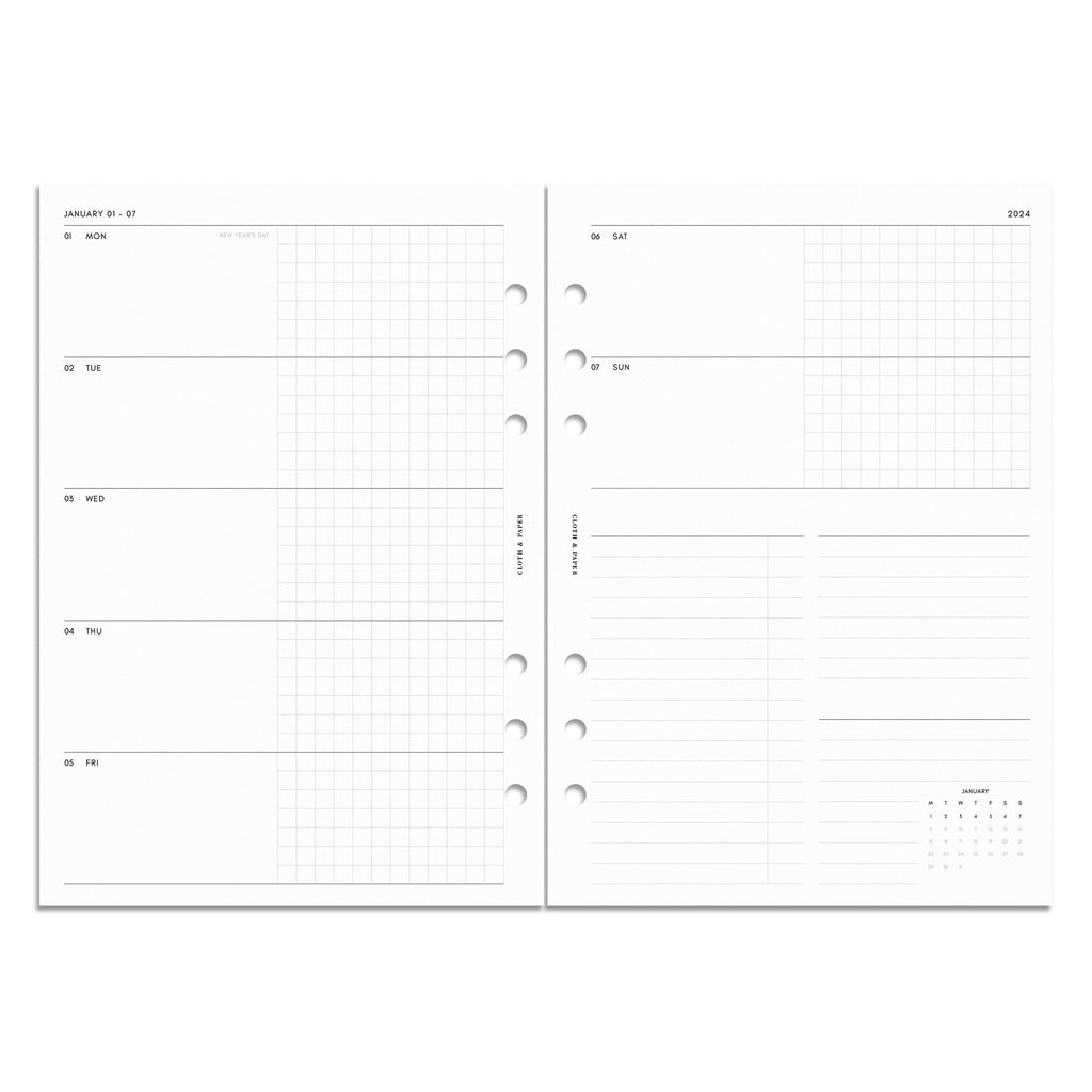 Undated Weekly Notes Planner Inserts in size A5 Close up view of the Undated Weekly Notes Planner Inserts showing a field for the week, sections for each day of the week, and a large lined notes section below.