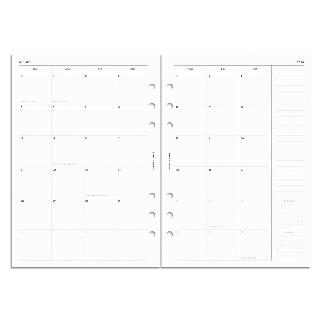 One page of Monthly Graph Planner Inserts in size A5 with graph note style calendar and a lined notes section. Close up of the Monthly Graph Planner Inserts showing a calendar view of the month with graph note style interior.