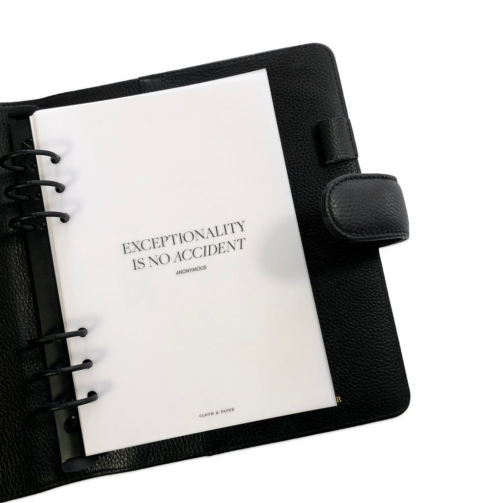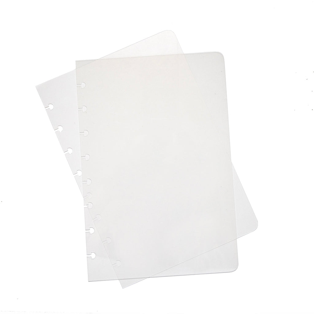 Clear, textured Studded Planner Dashboard in the size A5, on a neutral background. Clear, textured Studded Planner Dashboard in the size A5, shown ringbound in a black leather agenda.