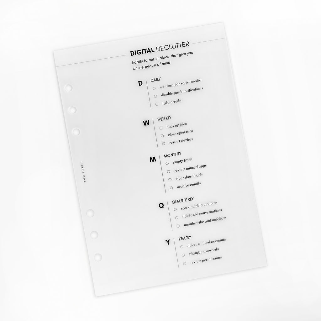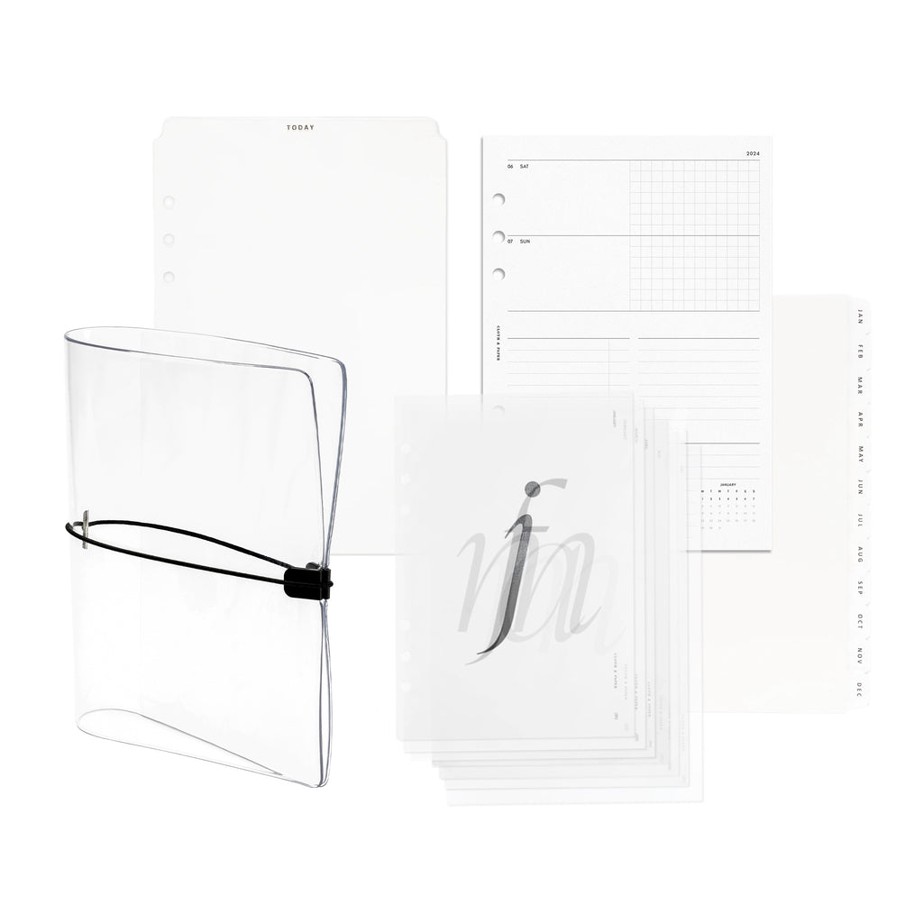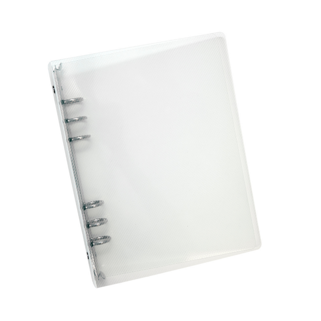 Light grey, semi-transparent, and glossy plastic planner dashboard with organic raised shape design in size A5 on a neutral background. Light grey, semi-transparent, and glossy plastic planner dashboard with organic raised shape design in size A5 shown ringbound in a black leather agenda.