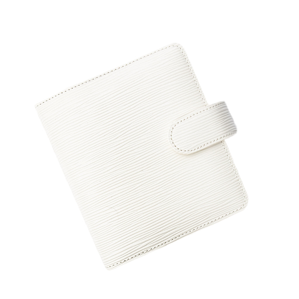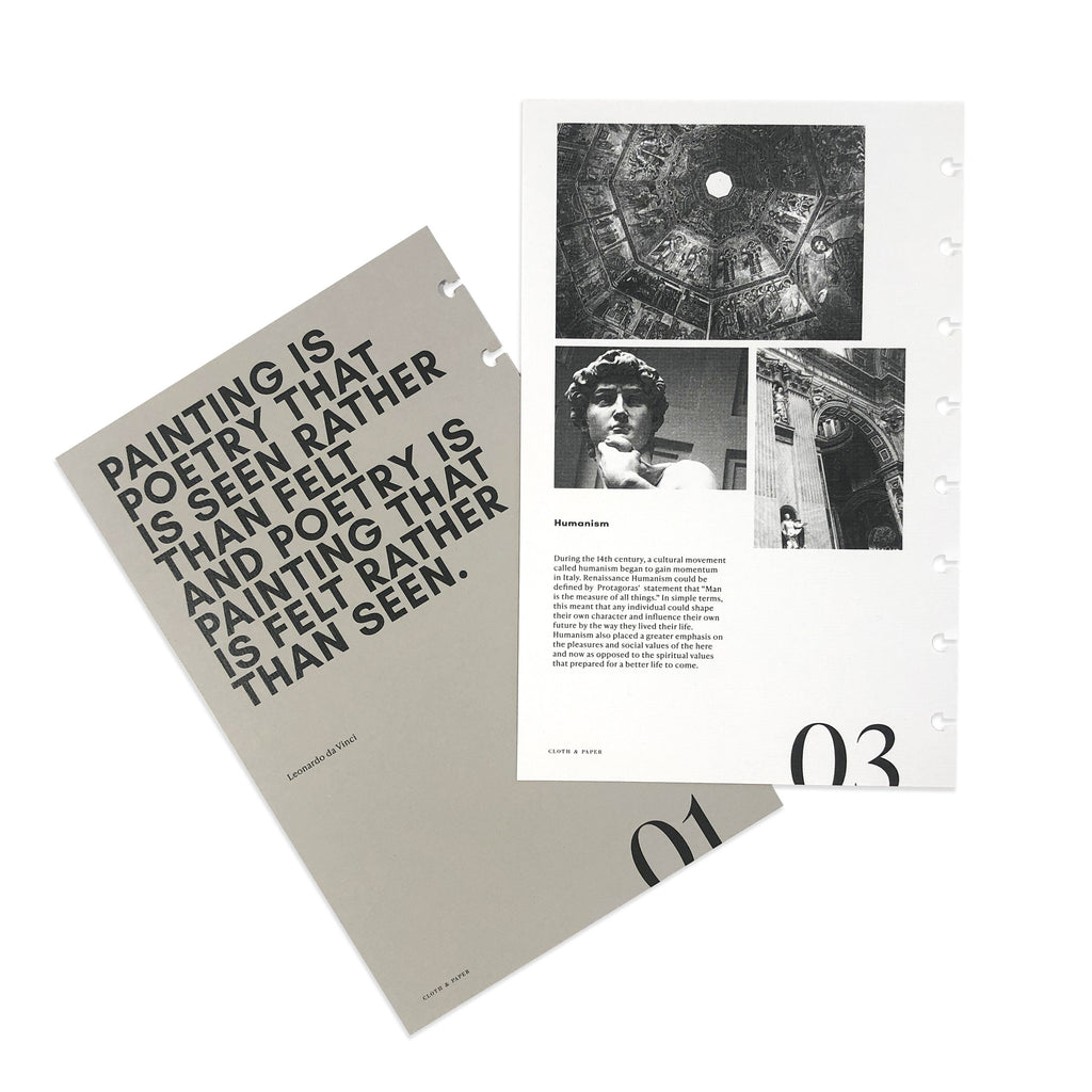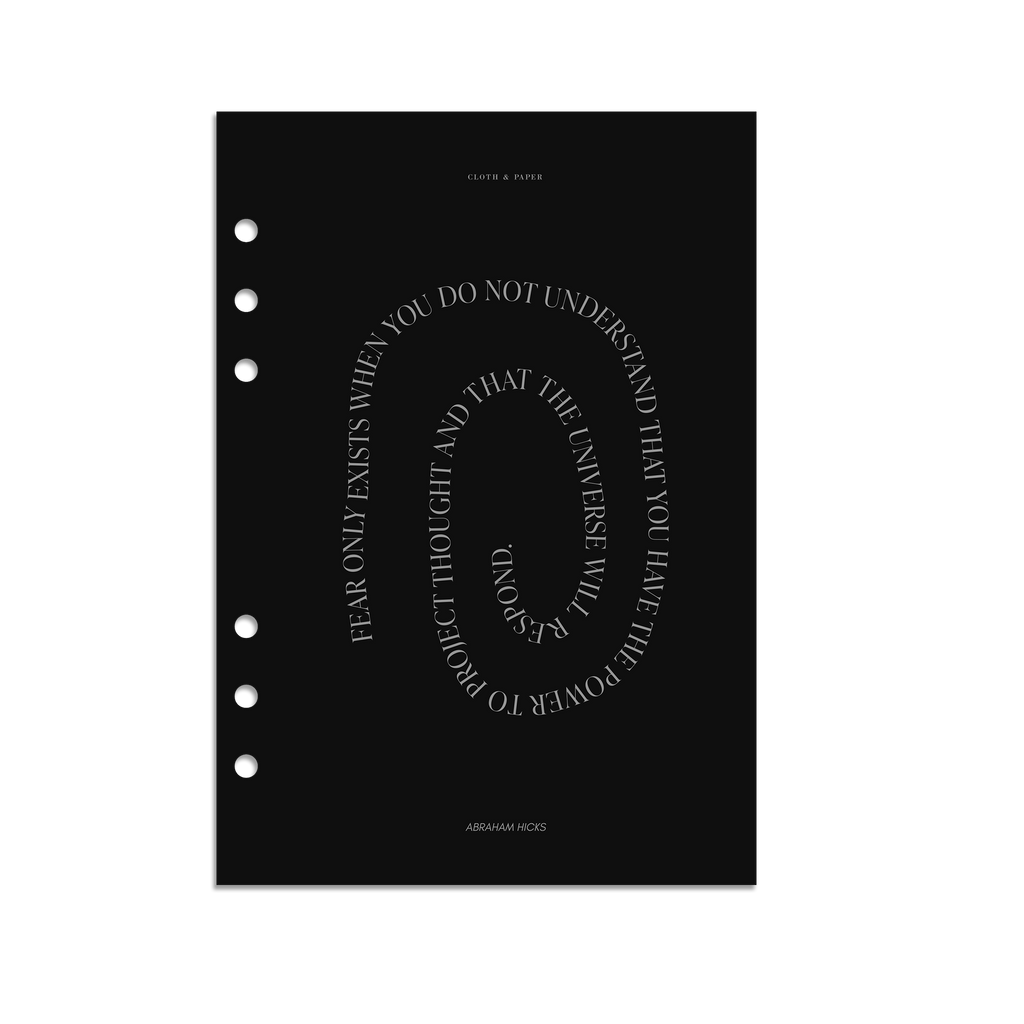 Light grey, semi-transparent, and glossy plastic planner dashboard with organic raised shape design in size A5 on a neutral background. Light grey, semi-transparent, and glossy plastic planner dashboard with organic raised shape design in size A5 shown ringbound in a black leather agenda.