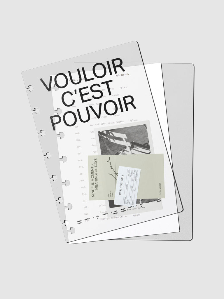 A5 Reinvention Dashboard from the Confidential Collection, translucent planner cover displayed on a white background. A5 Reinvention Dashboard shown inside a ring-bound planner with a minimal, layered spread.