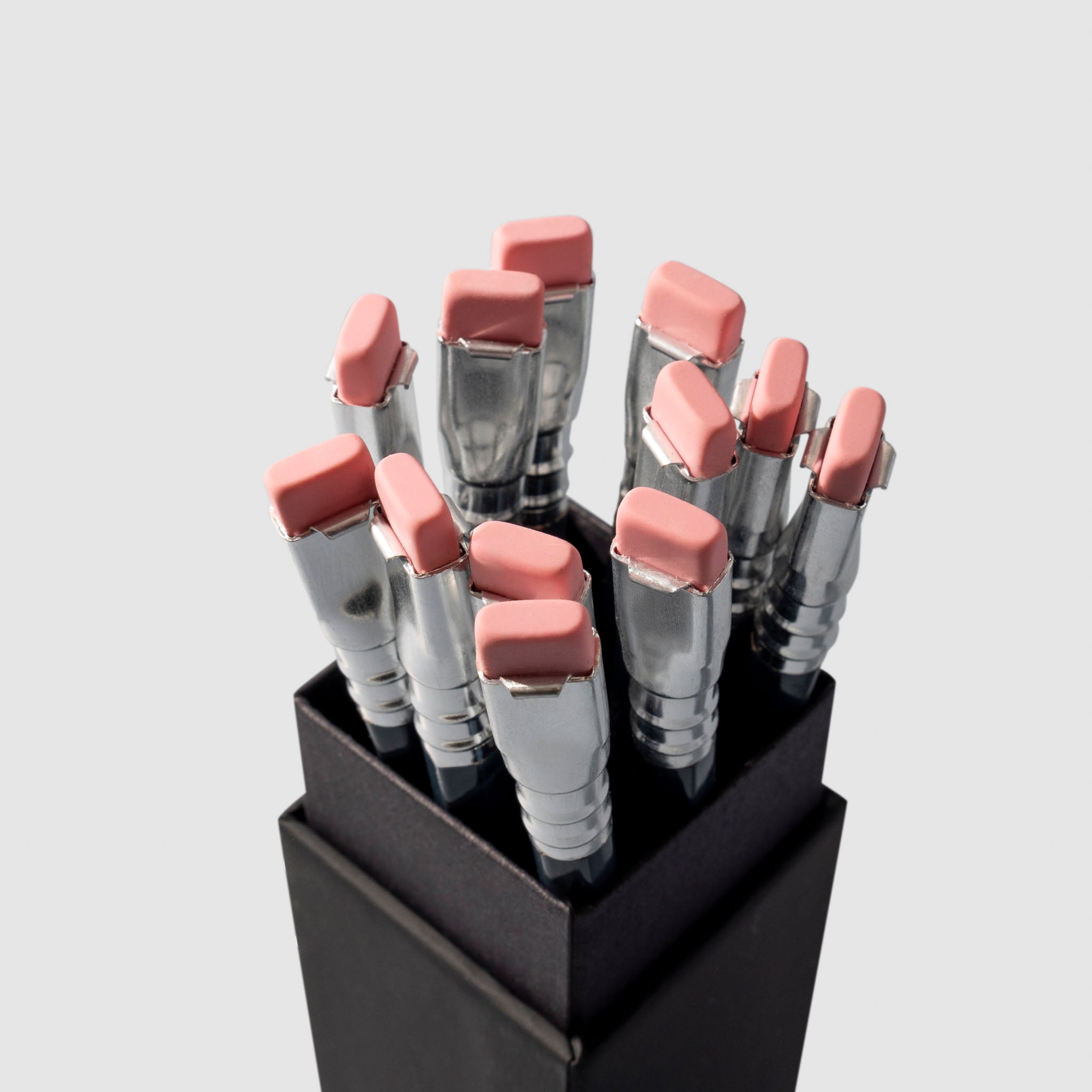 Pencil set of 12 made from California cedar with soft 3B graphite, silver accents, pink erasers, and a storage box.