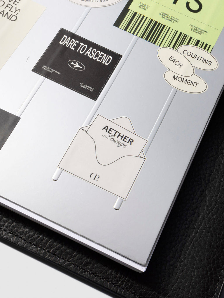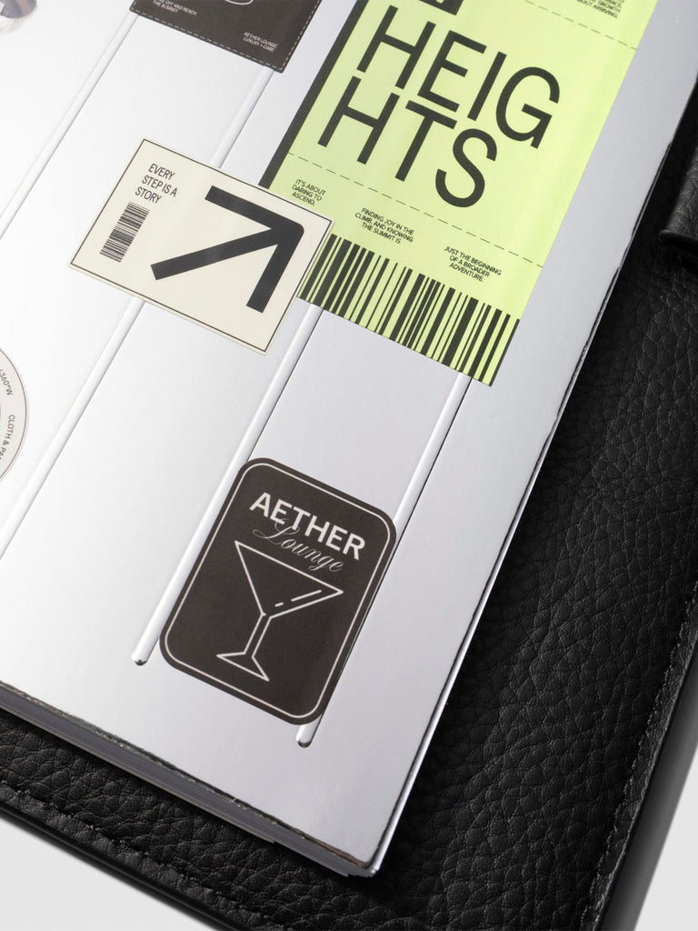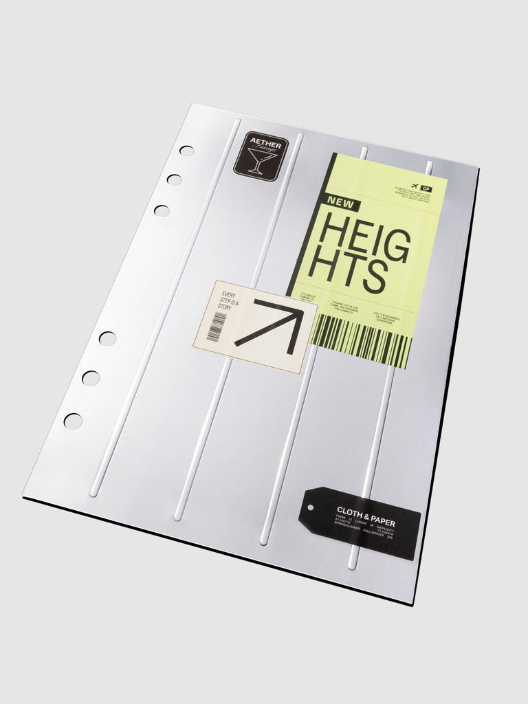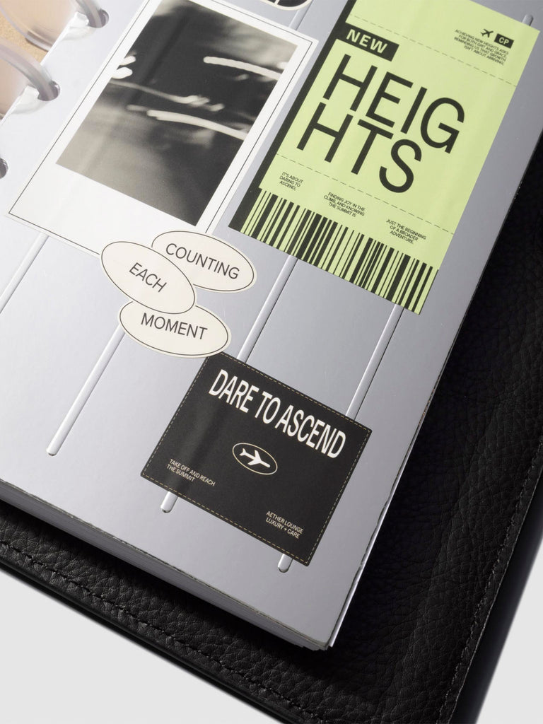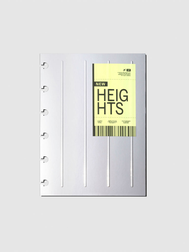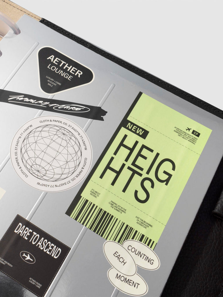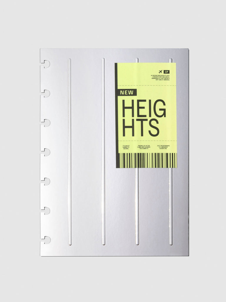 A silver embossed planner dashboard with a travel-inspired design, packaged with an avocado New Heights sticker and customization sheet.