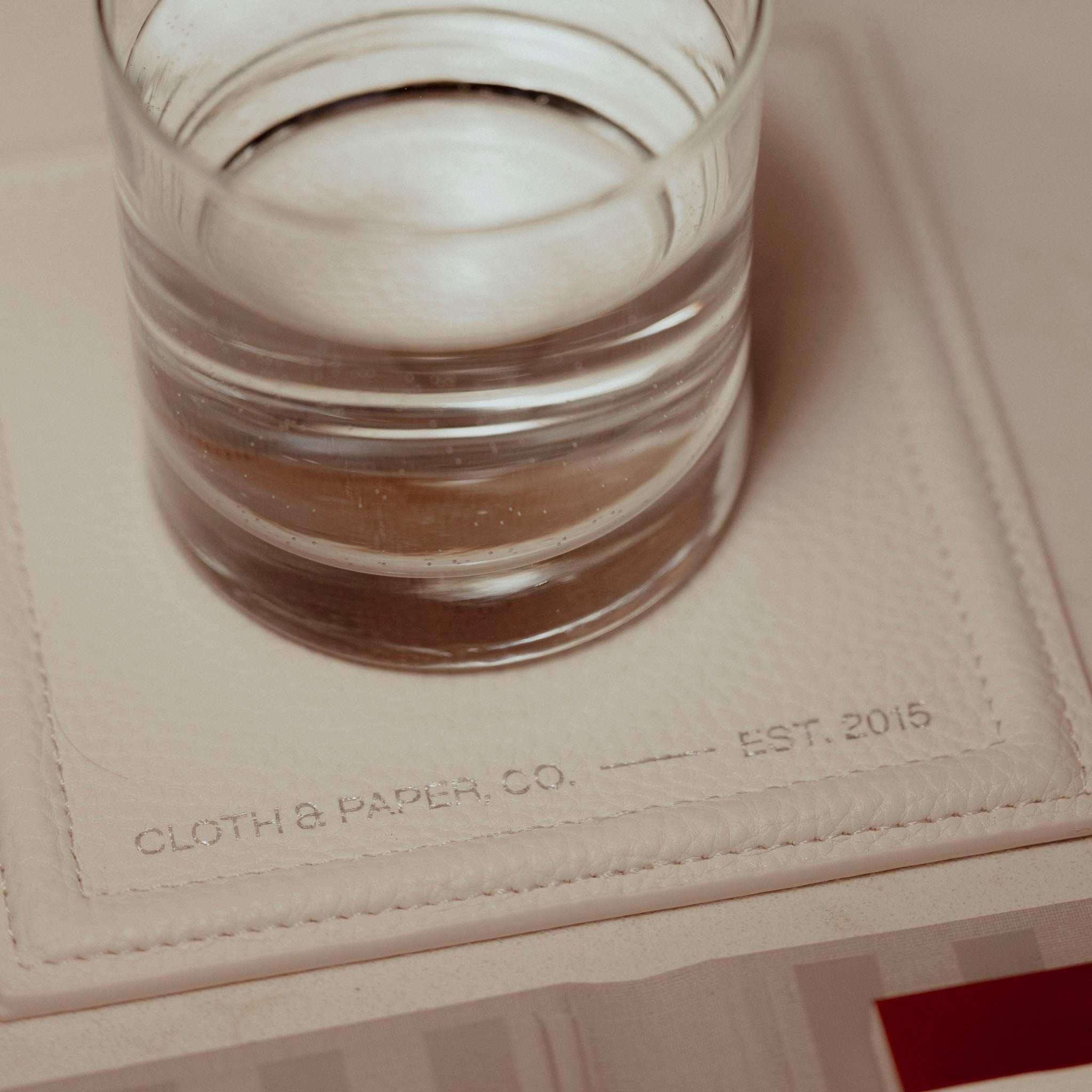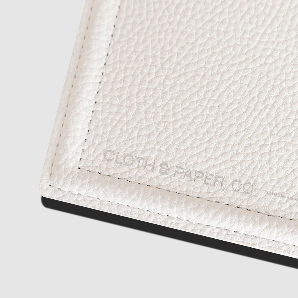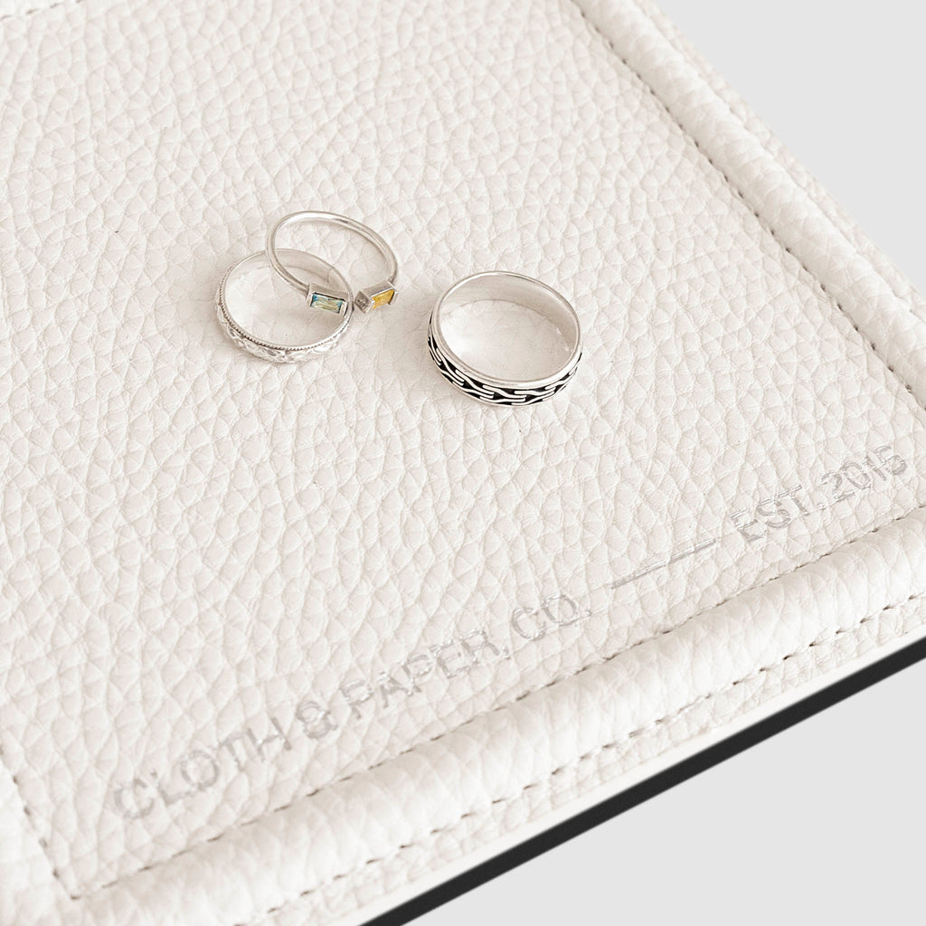 Trinket tray in white vegan leather with embossed silver foil logo and raised ridge, perfect for organizing keys, change, or small accessories.