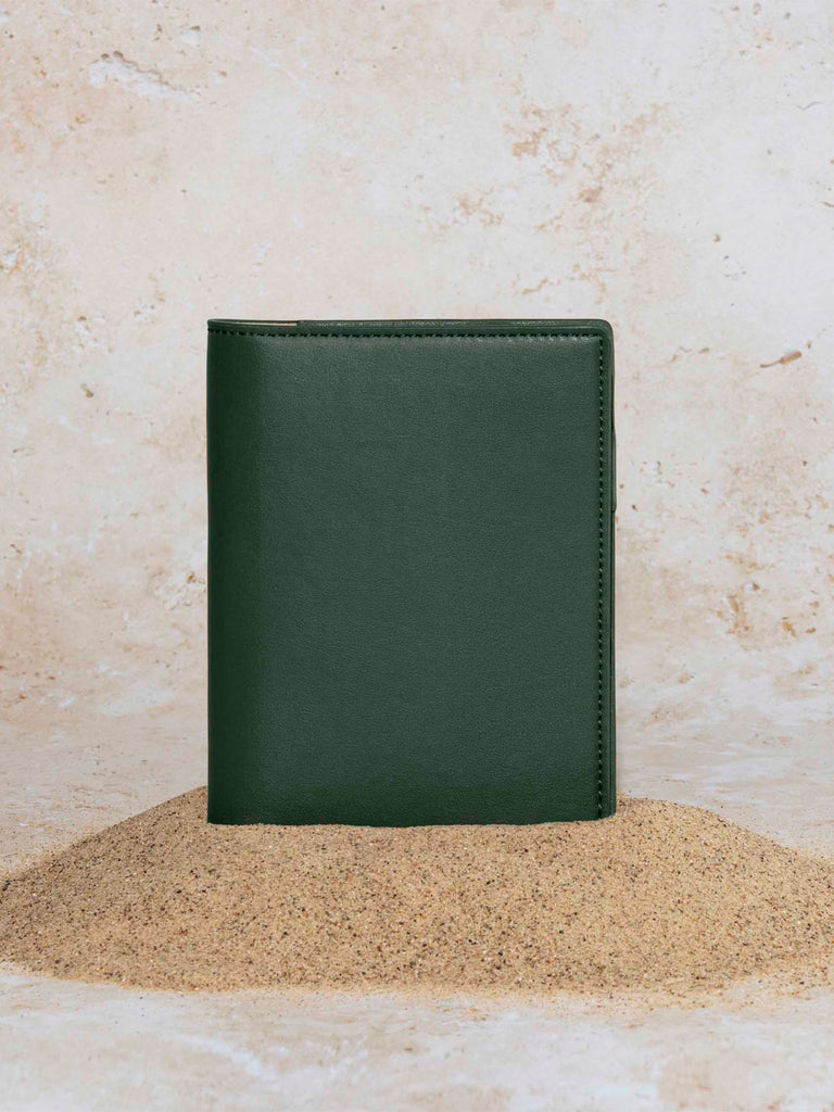 Handmade cactus vegan leather folio crafted from prickly pear with eco-friendly durability, featuring card slots, pockets, and a pen loop, designed for CP Petite discbound systems.