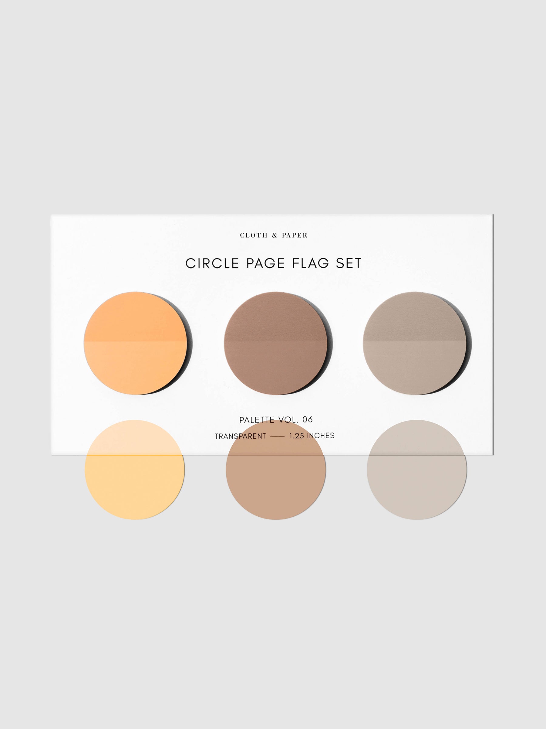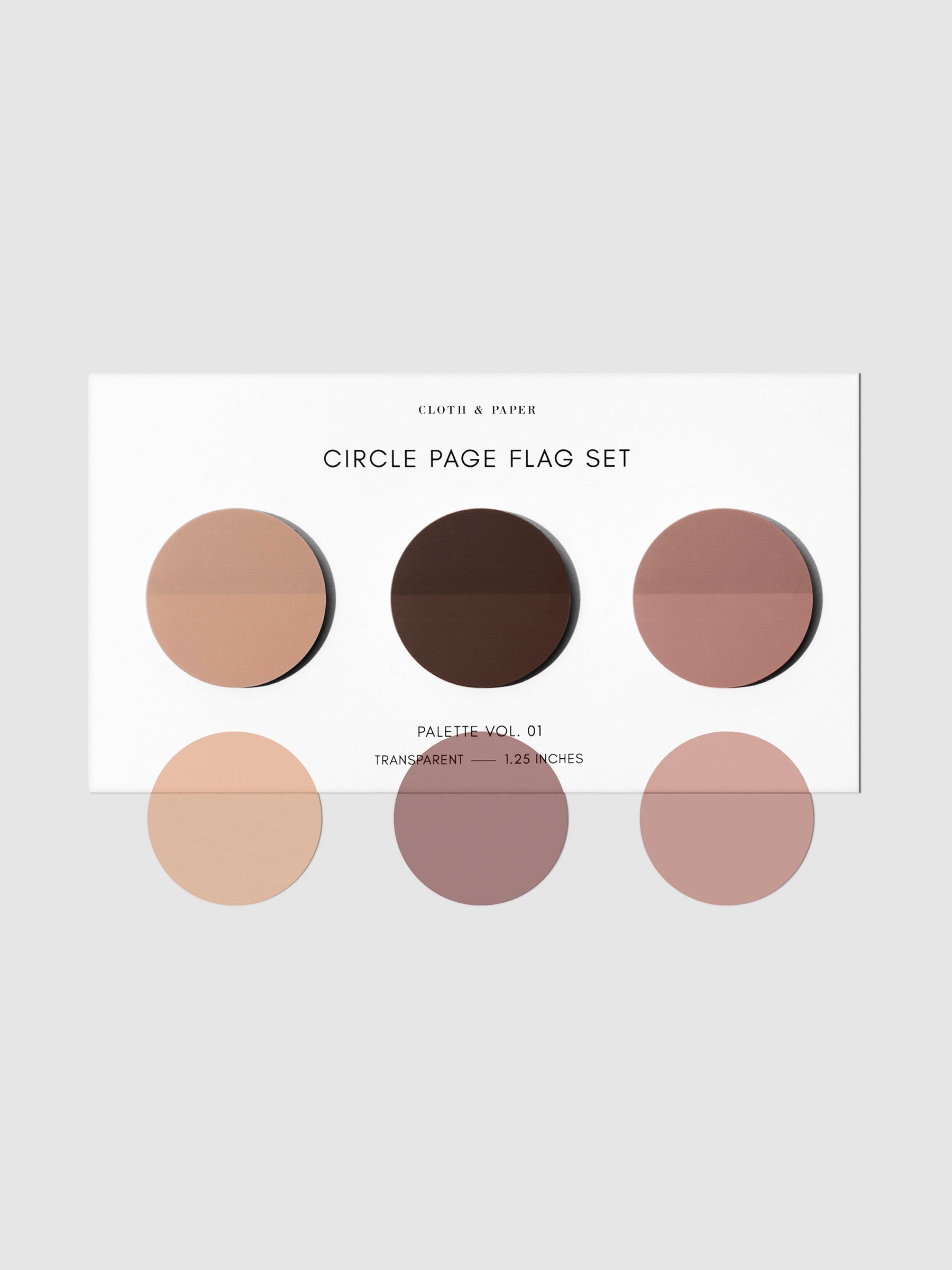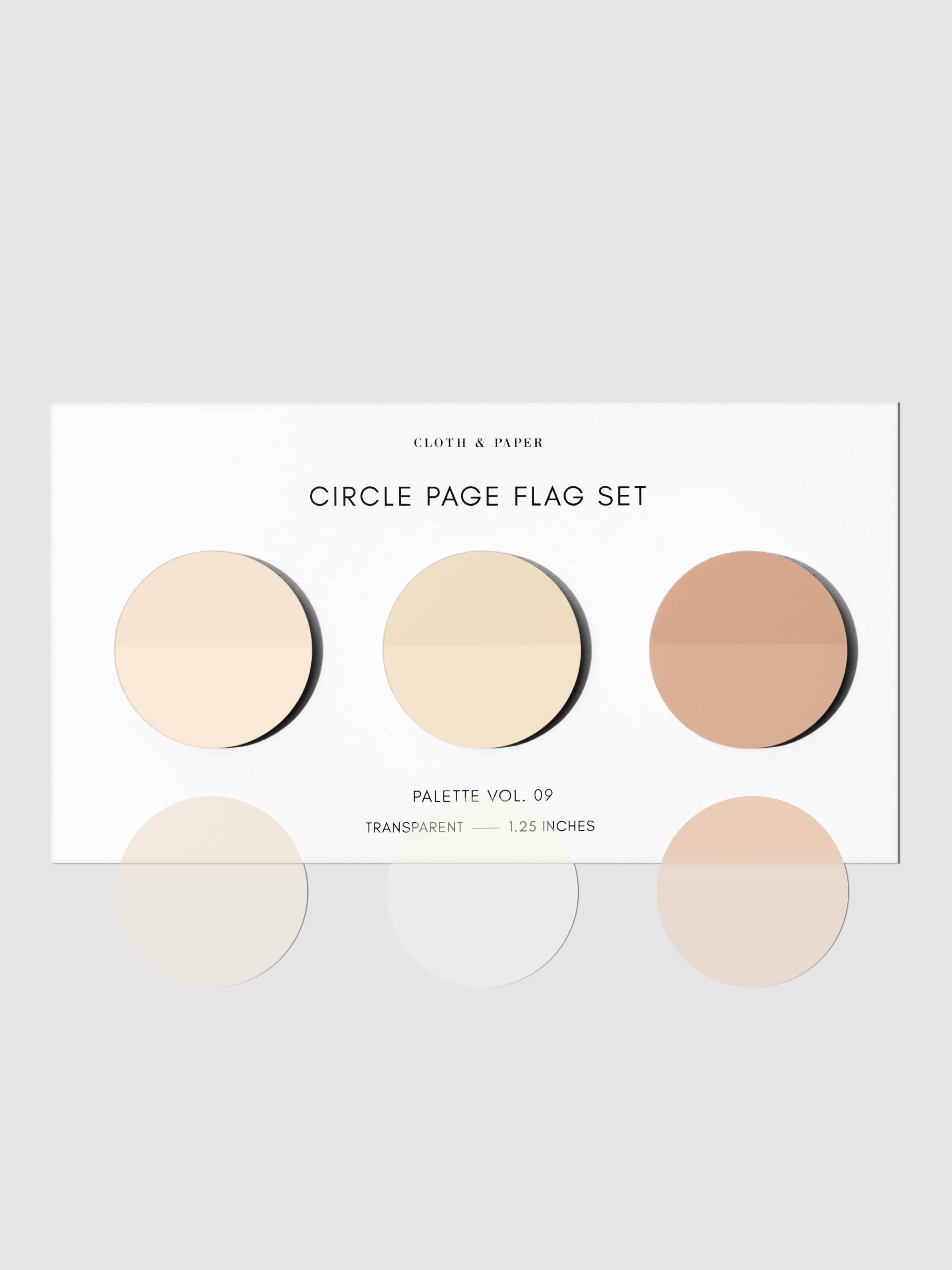 Circle Page Flag Trio, Leché, Cashmere, and Nude, Cloth & Paper. Page flags on their backing on a neutral background.