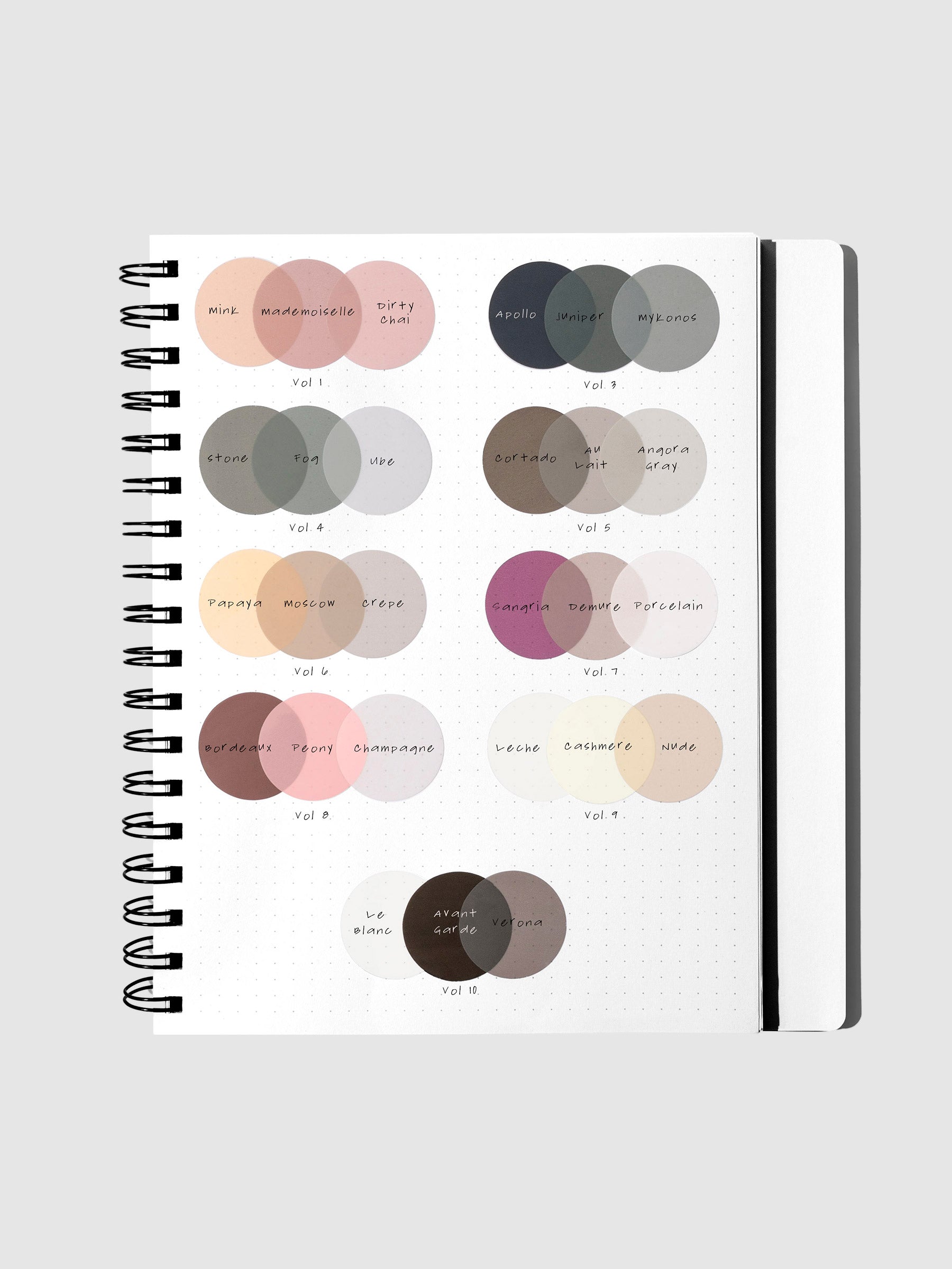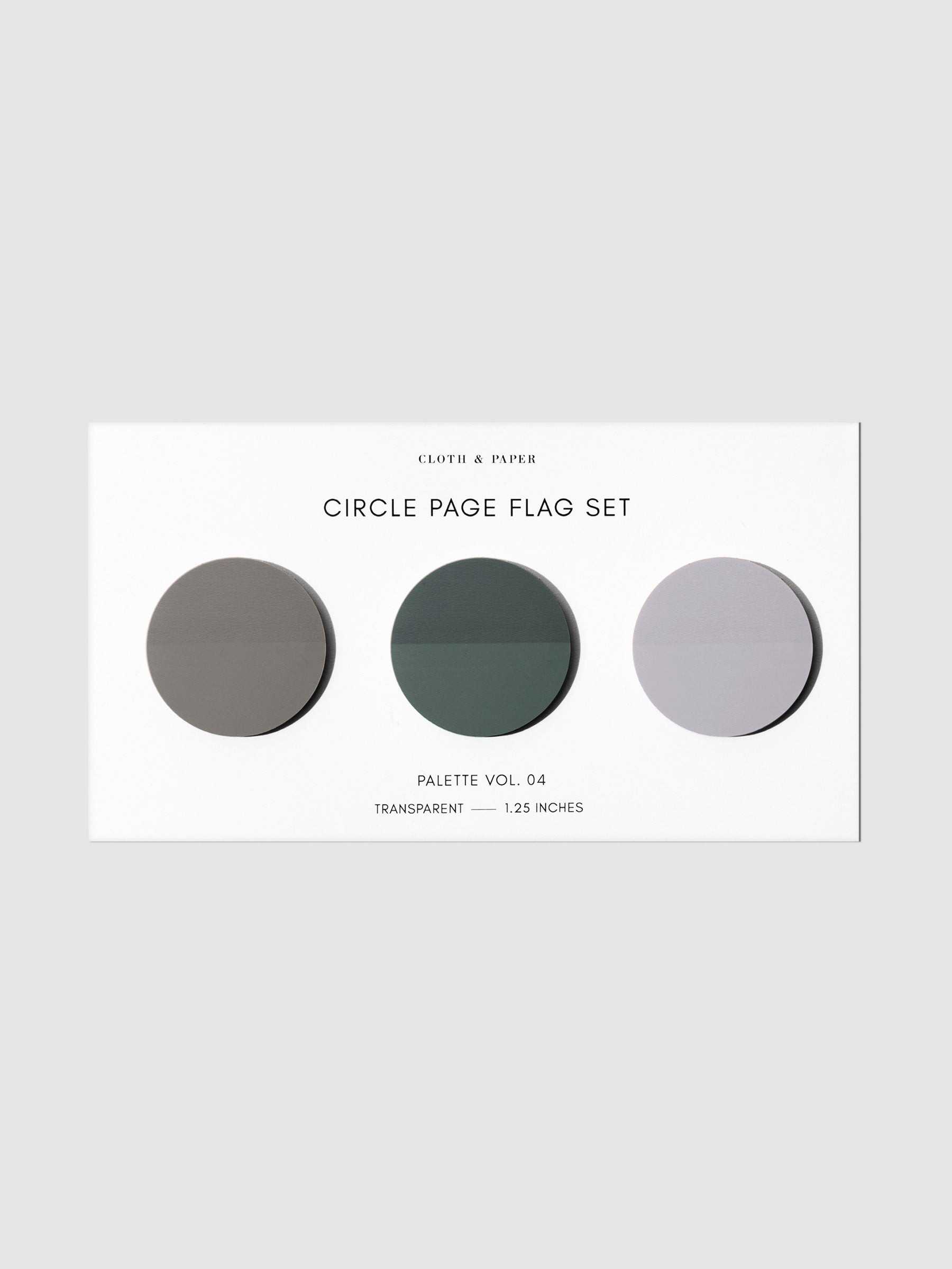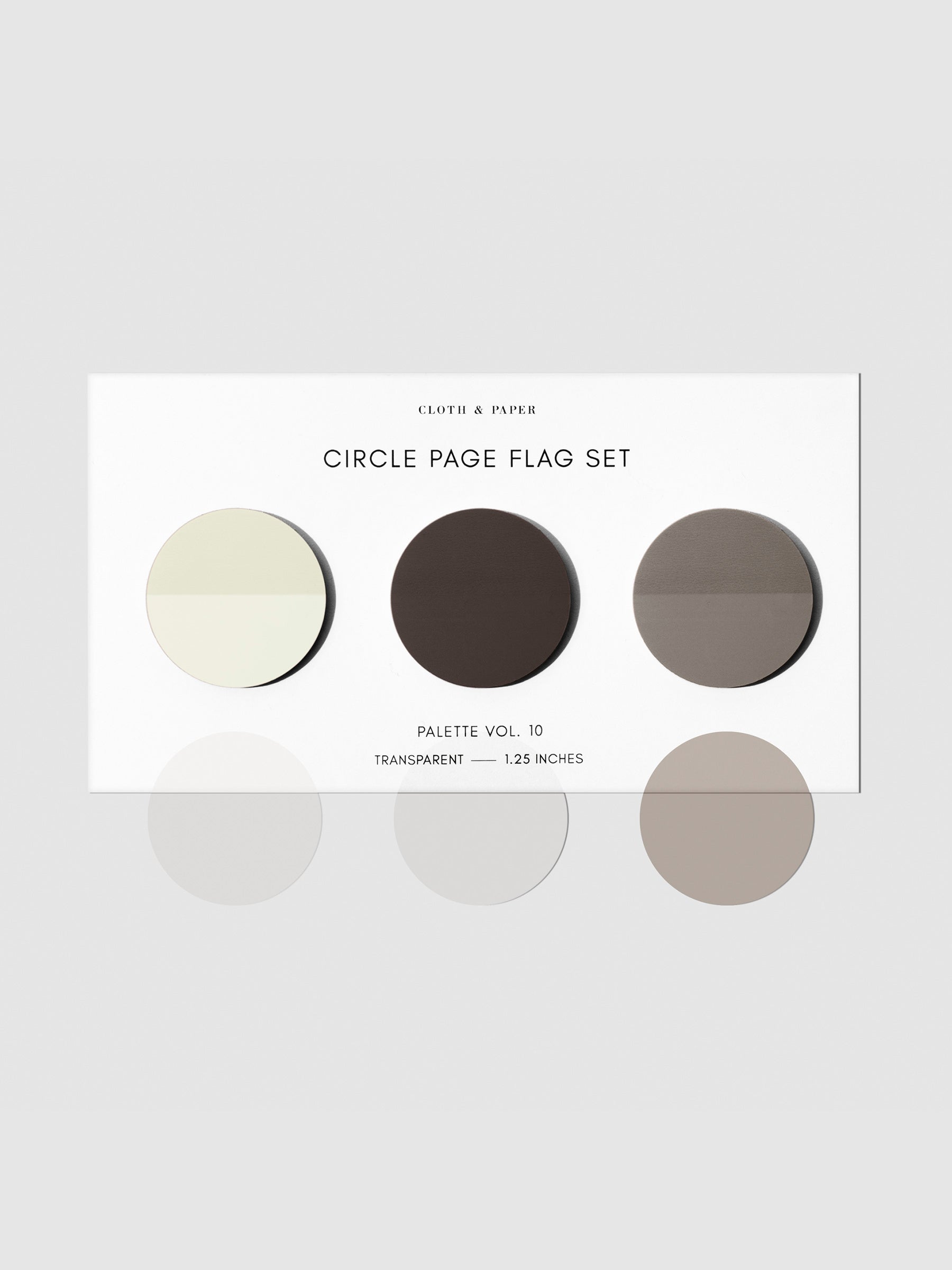 Circle Page Flag Trio, Leché, Cashmere, and Nude, Cloth & Paper. Page flags on their backing on a neutral background.