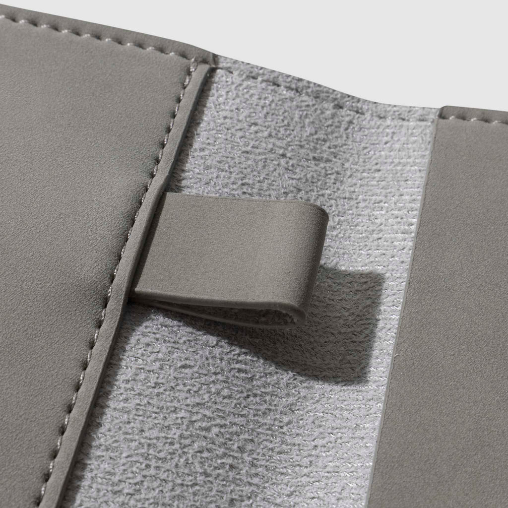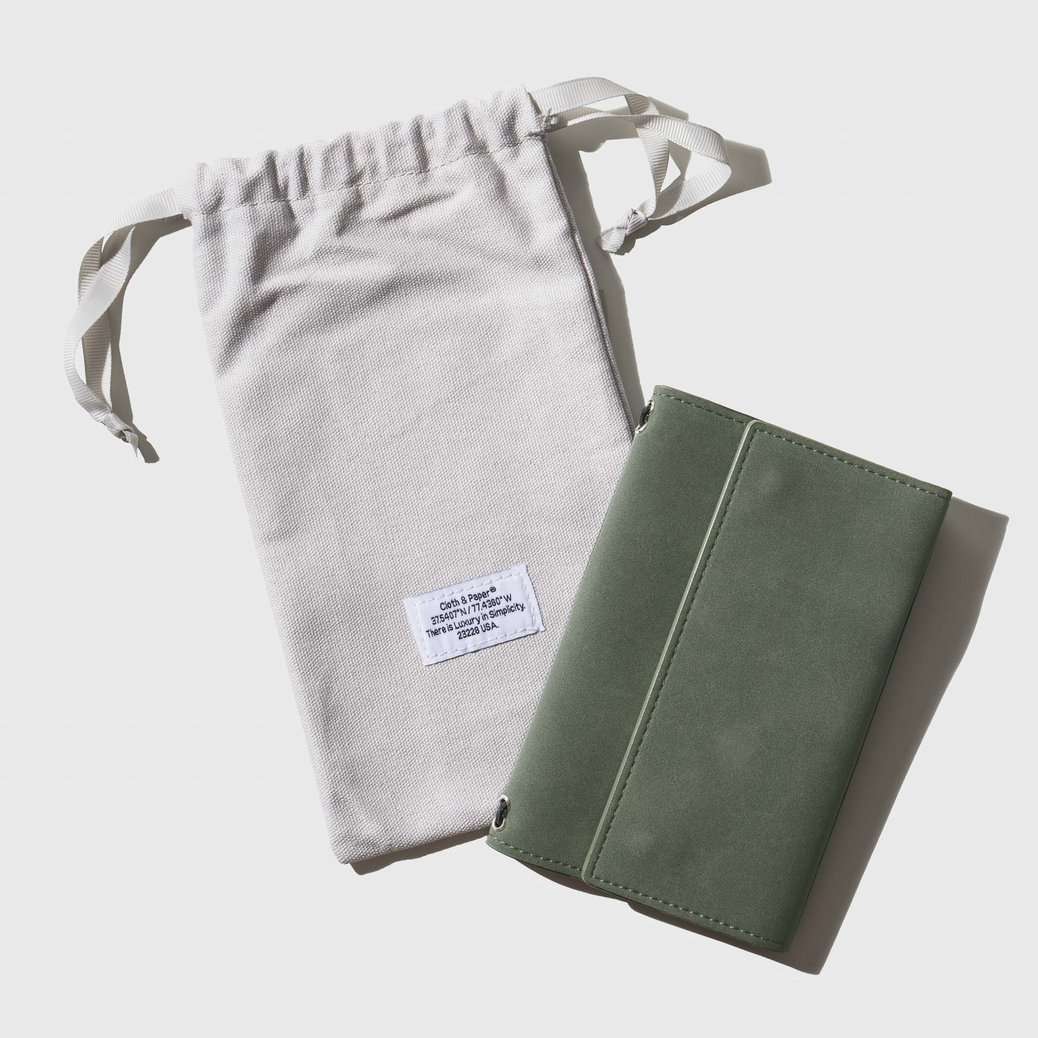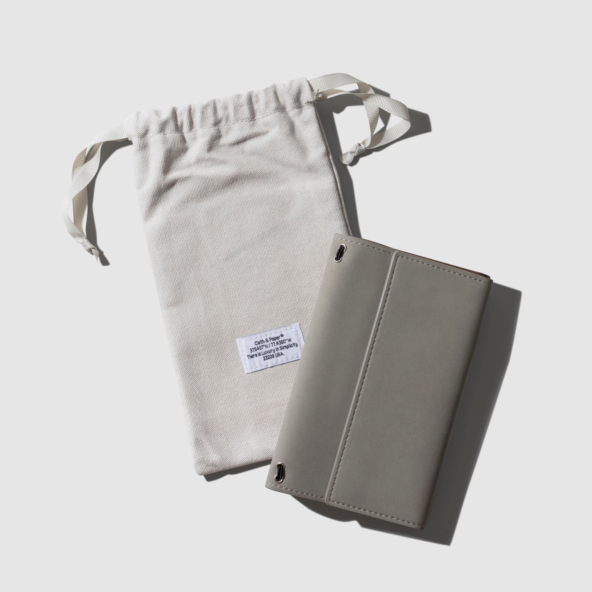 Travel Refillable Notebook Cover, Ristretto, Cloth and Paper. Notebook cover shown with dust bag on a neutral background.
