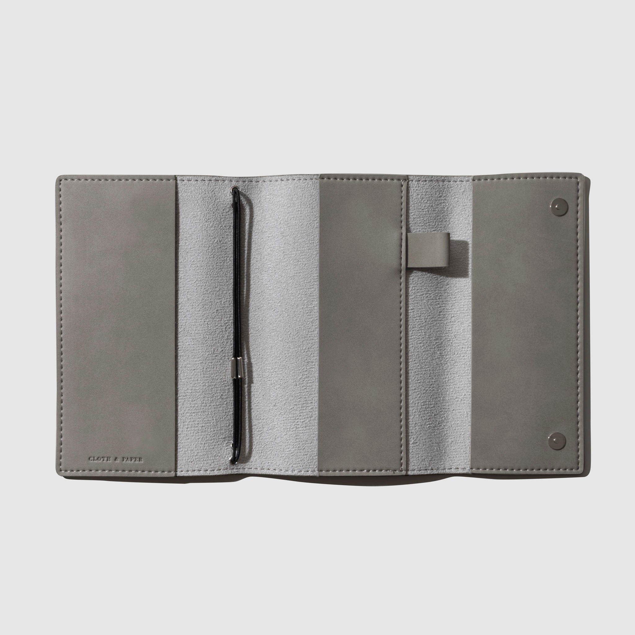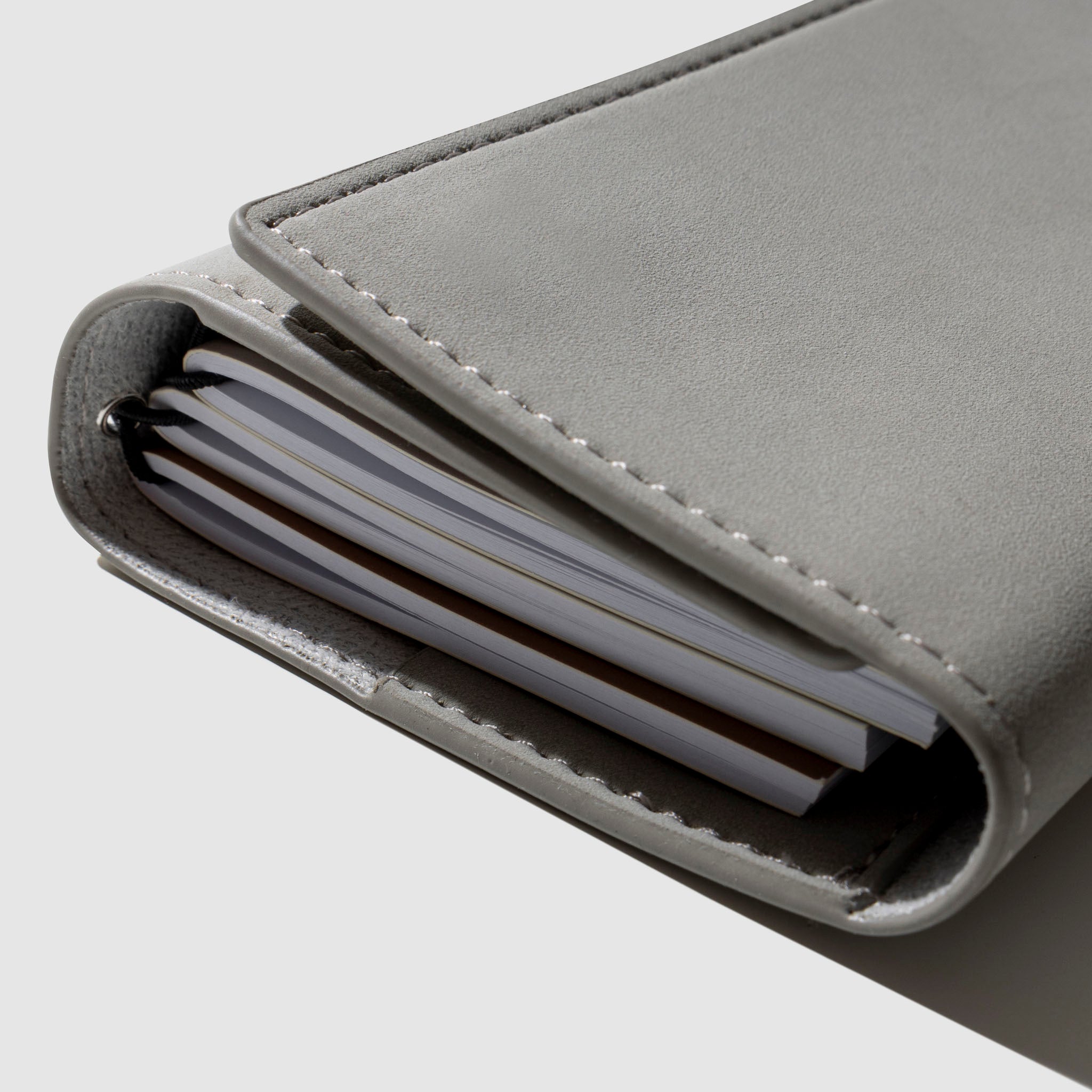 Notebook cover crafted from vegan leather with snap closure, elastic loop for up to four notebooks, interior pockets, and pen loop for portable organization.