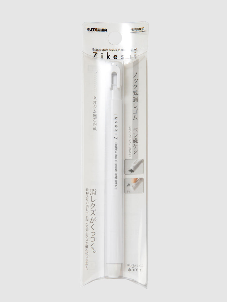 Kutsuwa Zikeshi retractable eraser with a magnetic top that collects and releases eraser dust for a clean workspace.