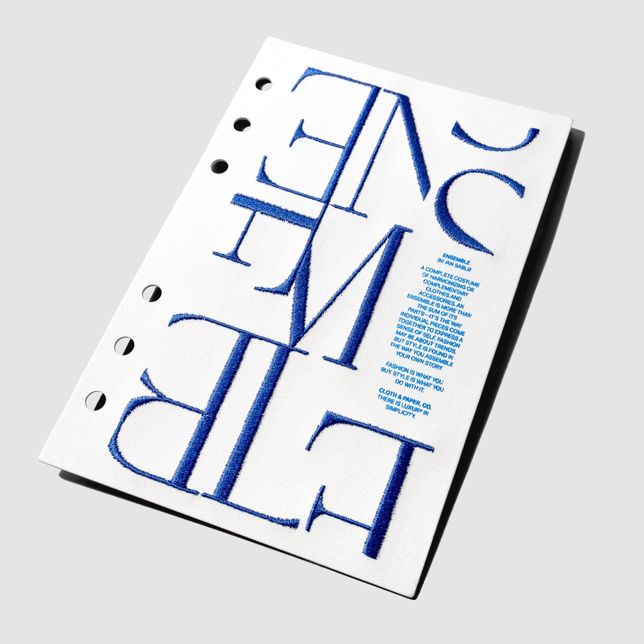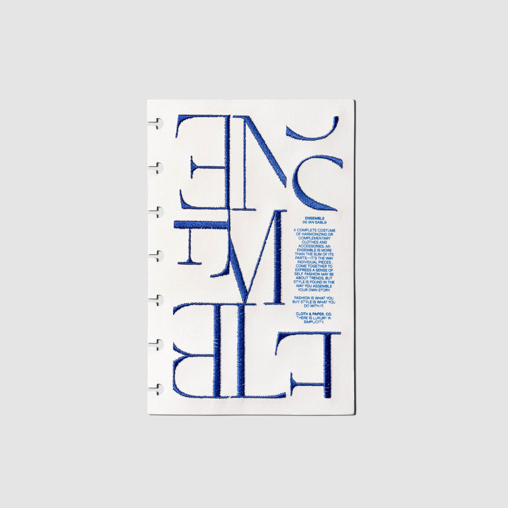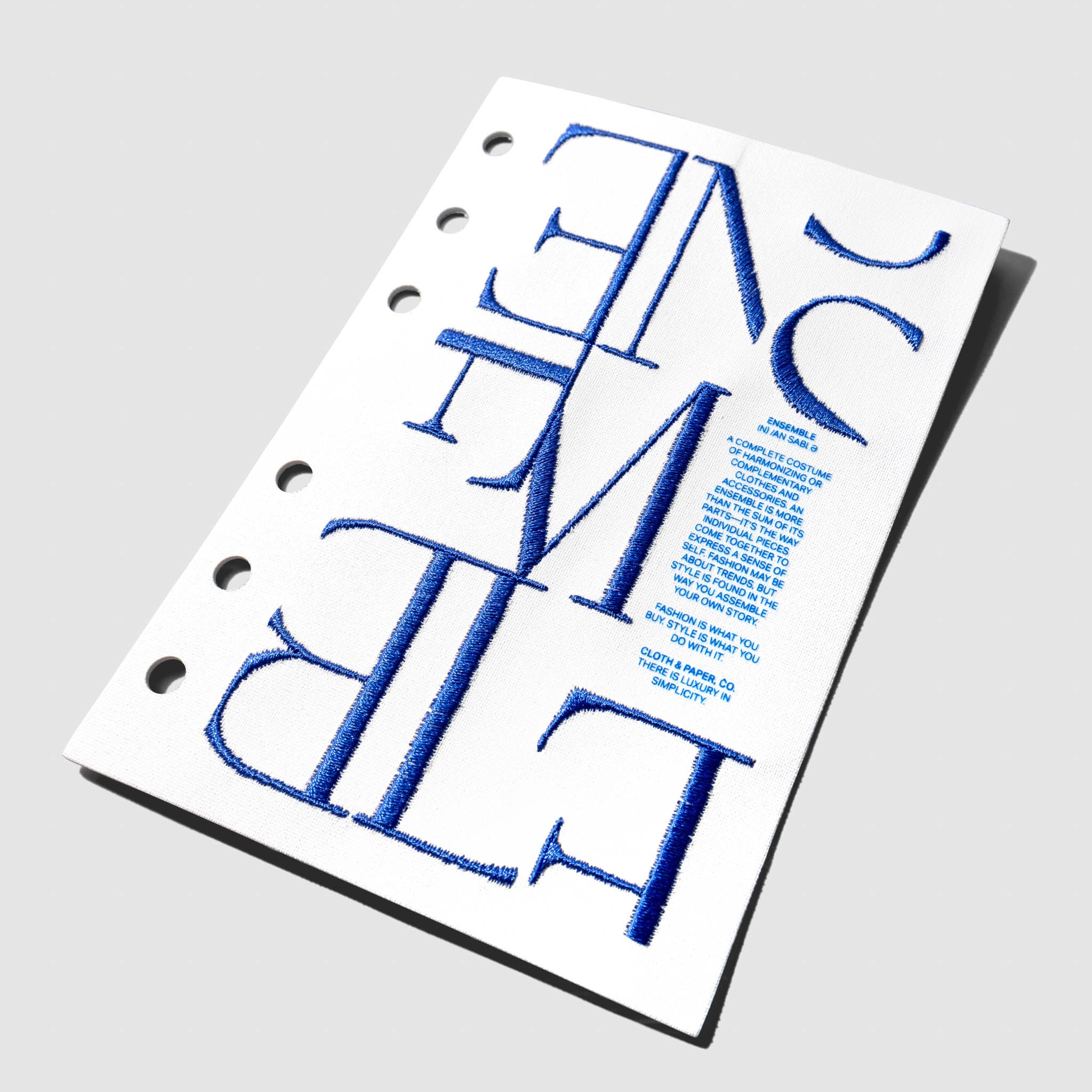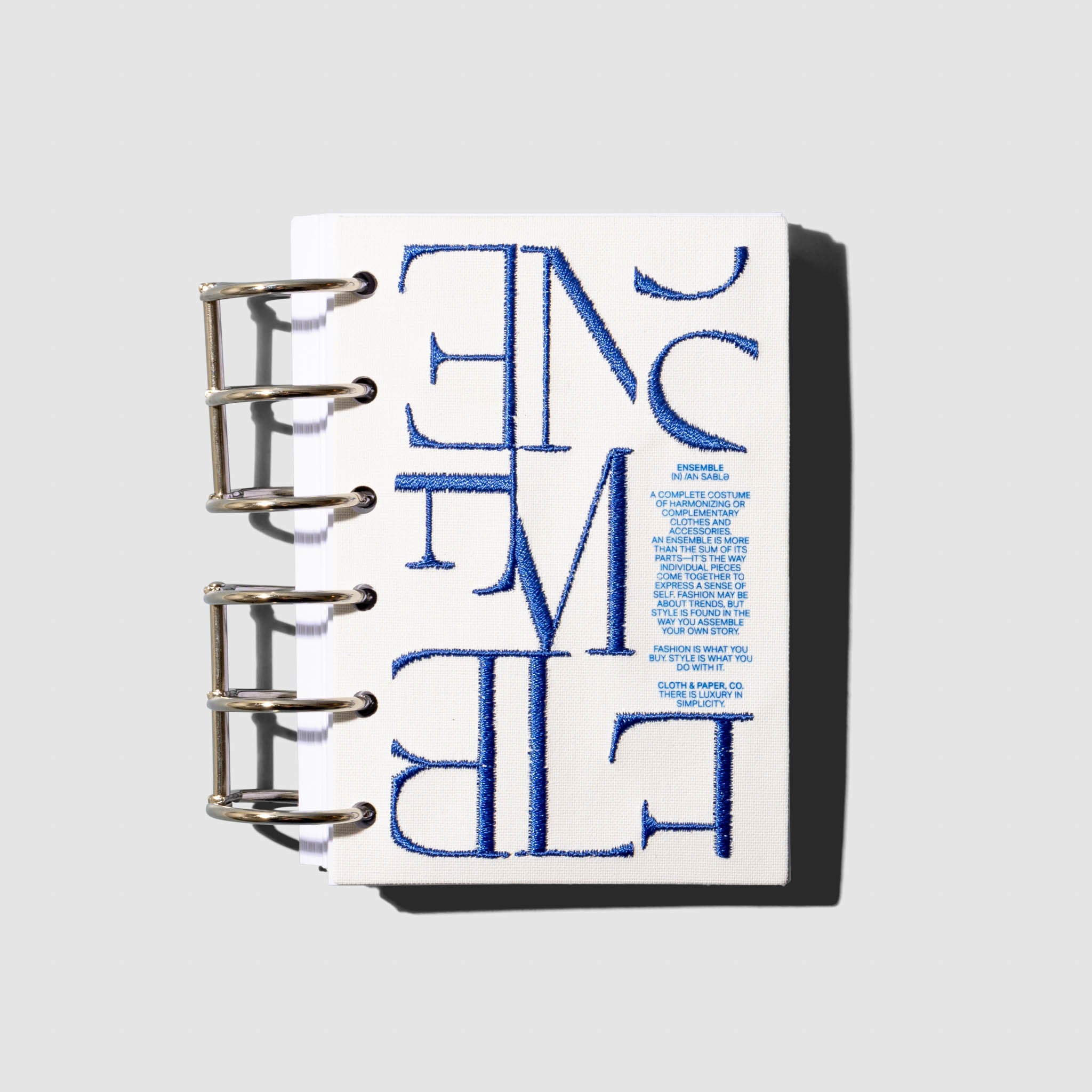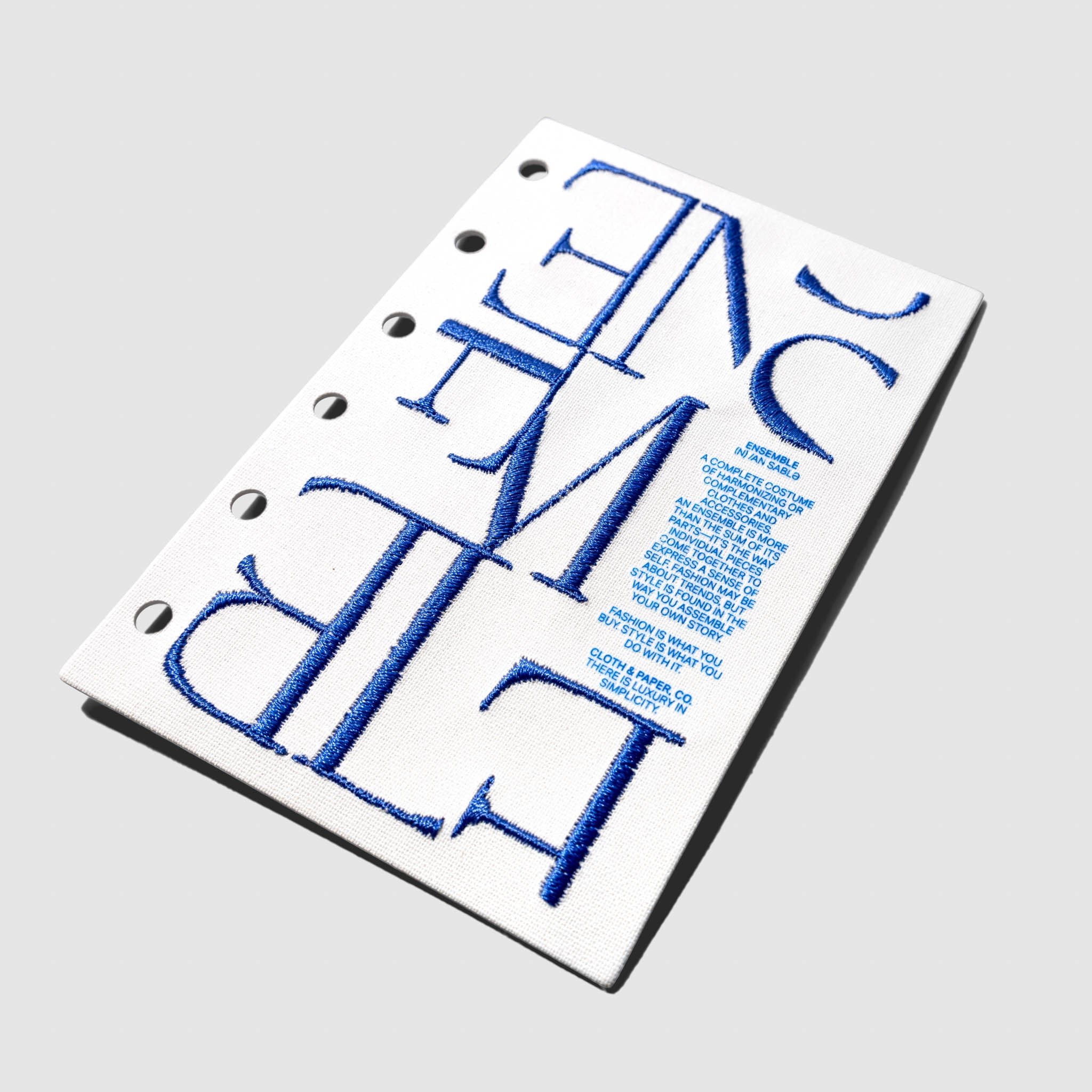 A white linen planner dashboard with blue embroidered accents, combining fabric texture with functional design.