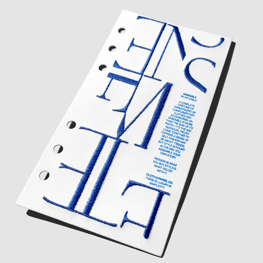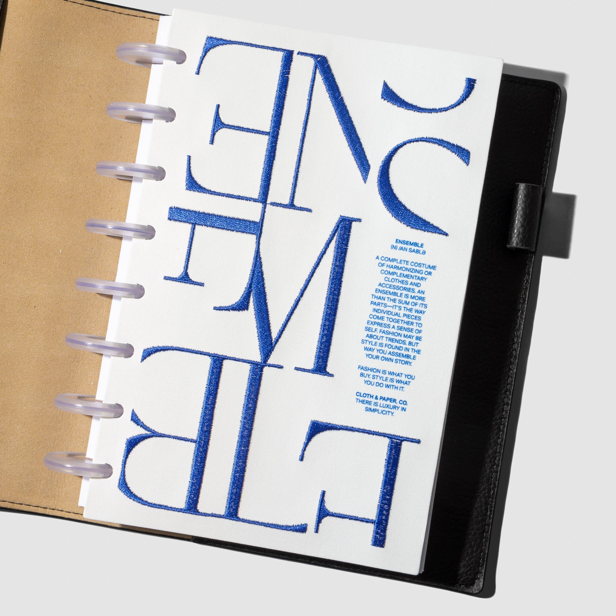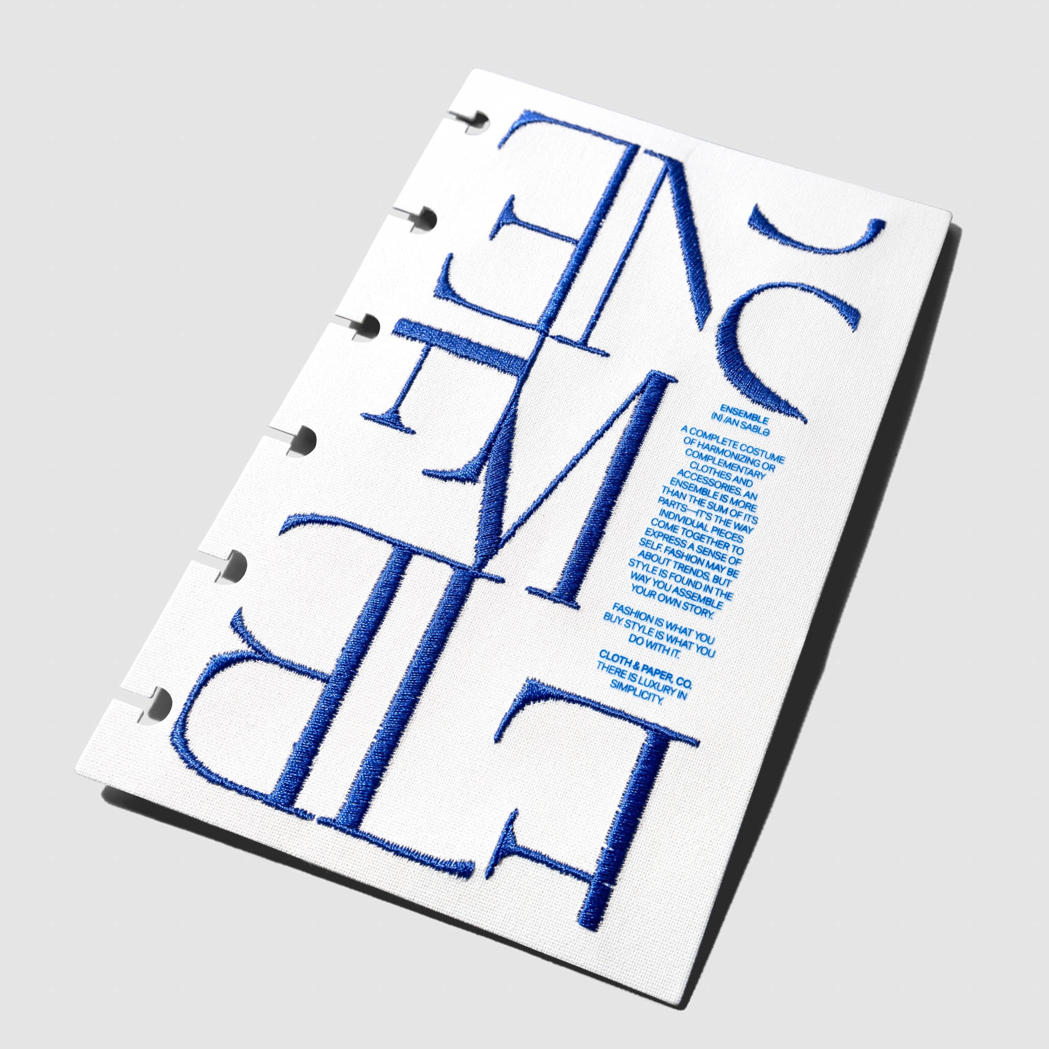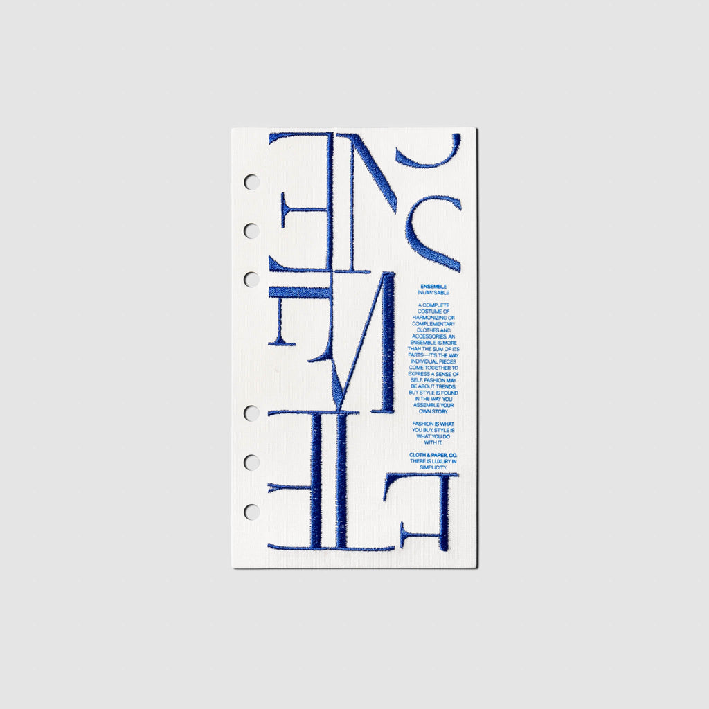 A white linen planner dashboard with blue embroidered accents, combining fabric texture with functional design.