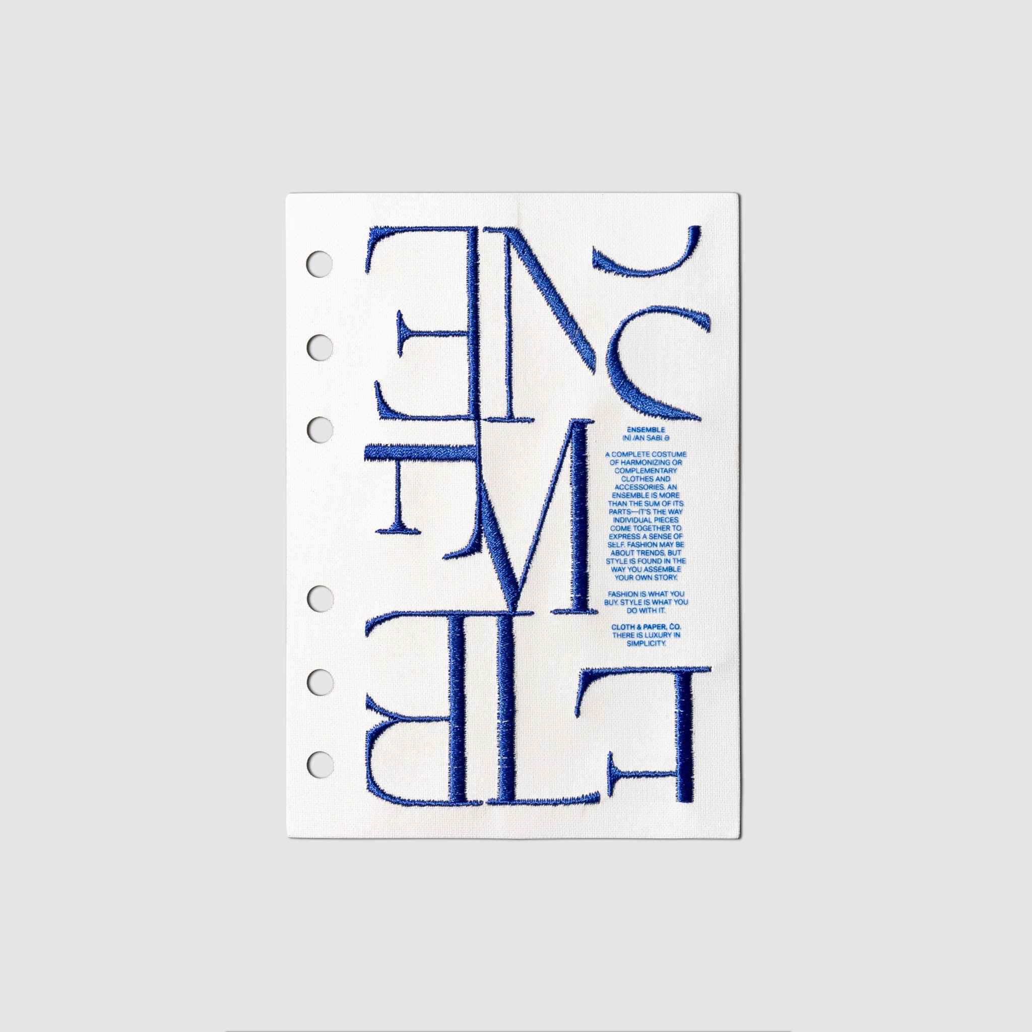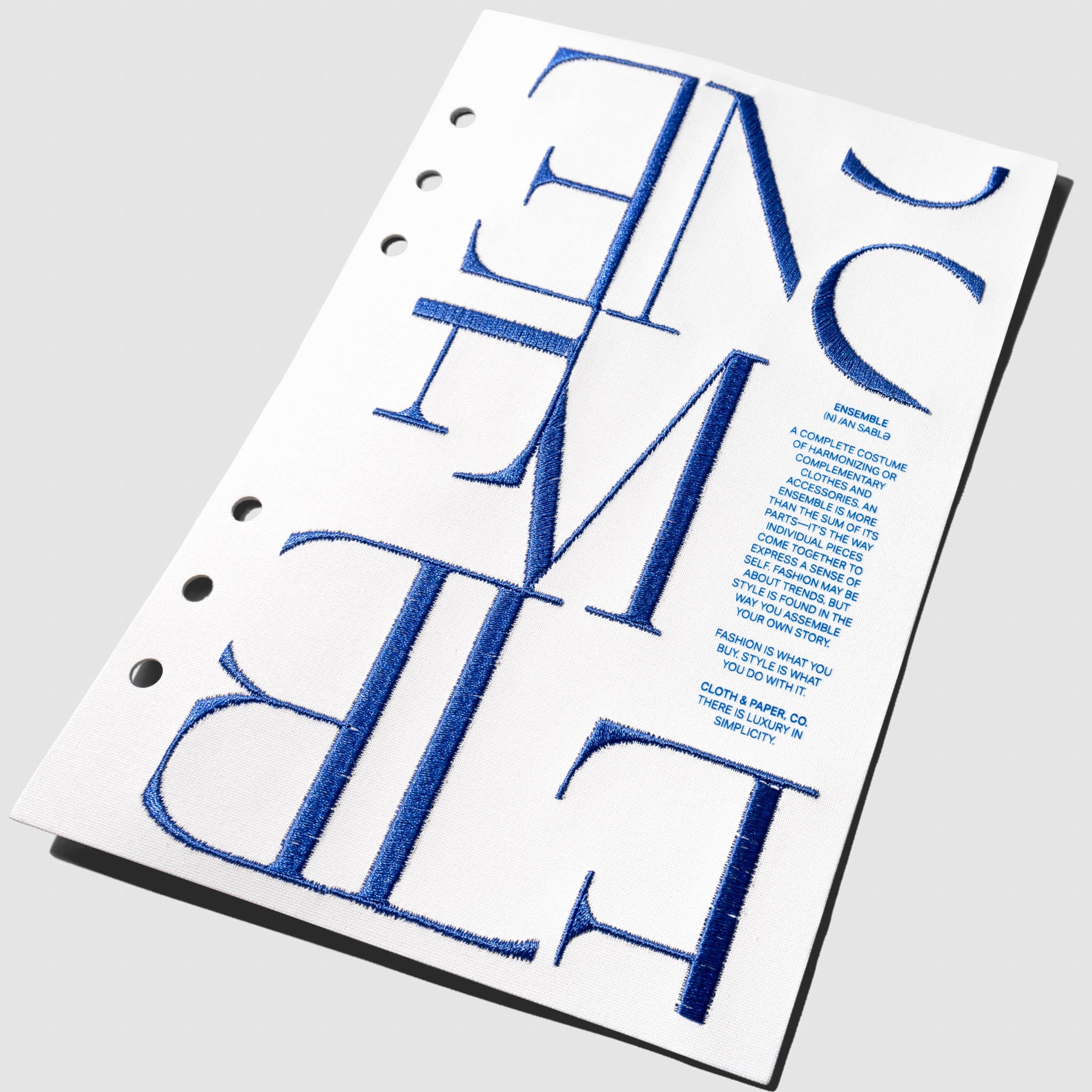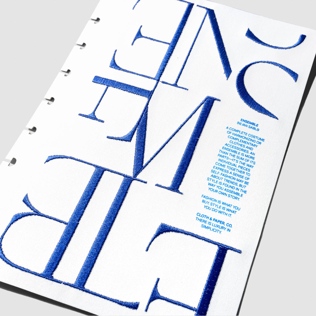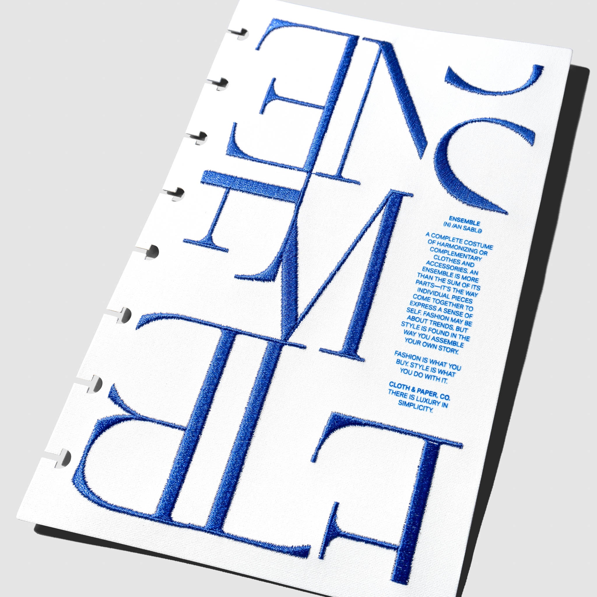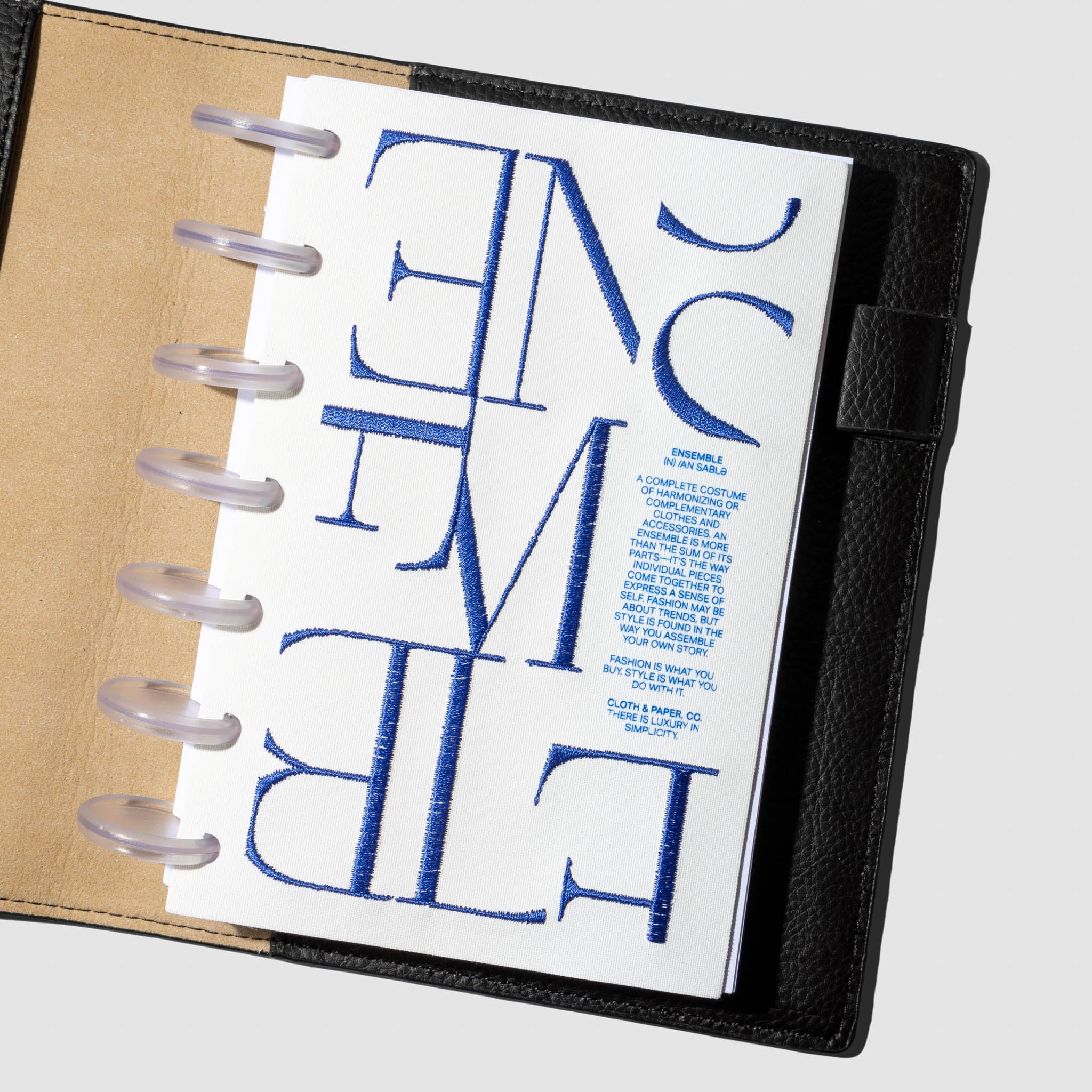 A white linen planner dashboard with blue embroidered accents, combining fabric texture with functional design.