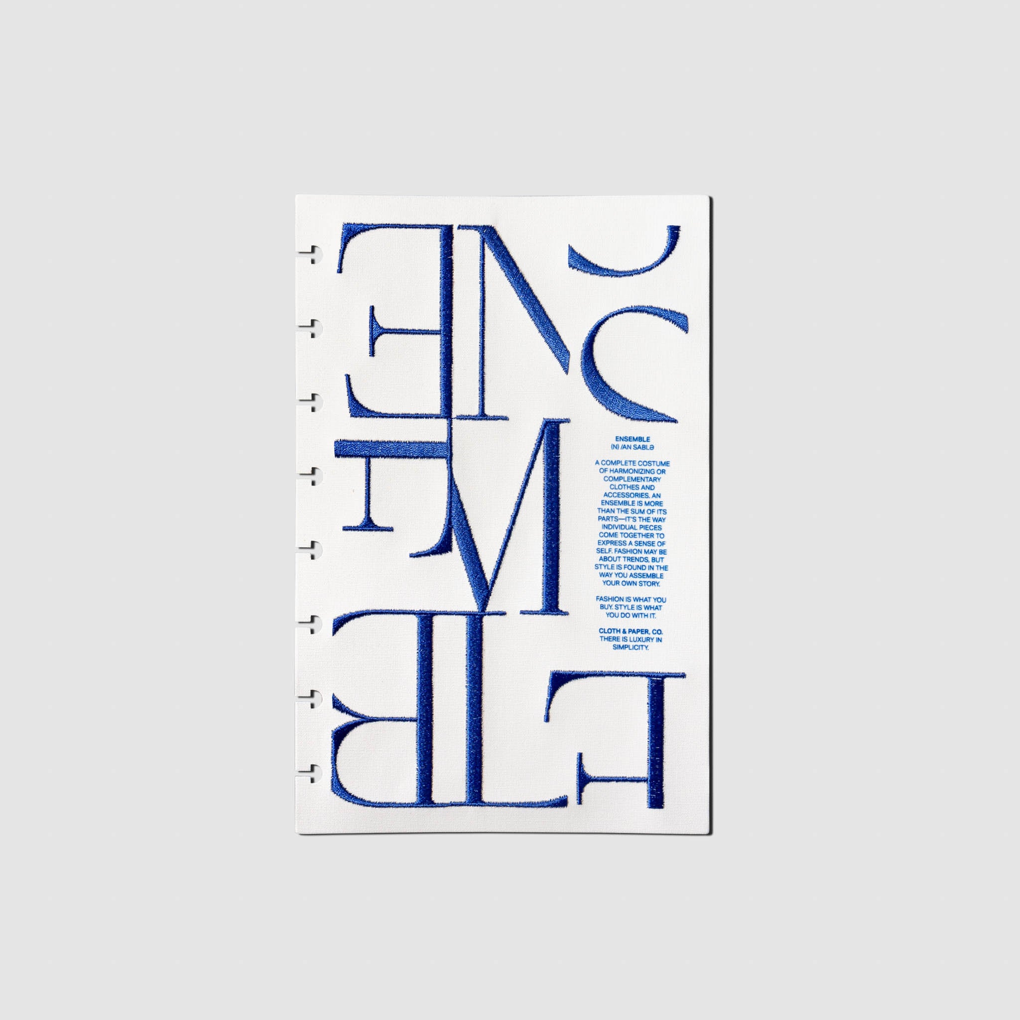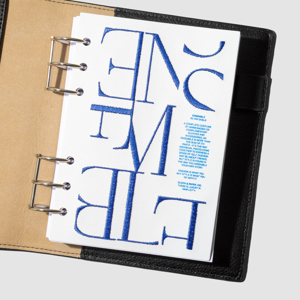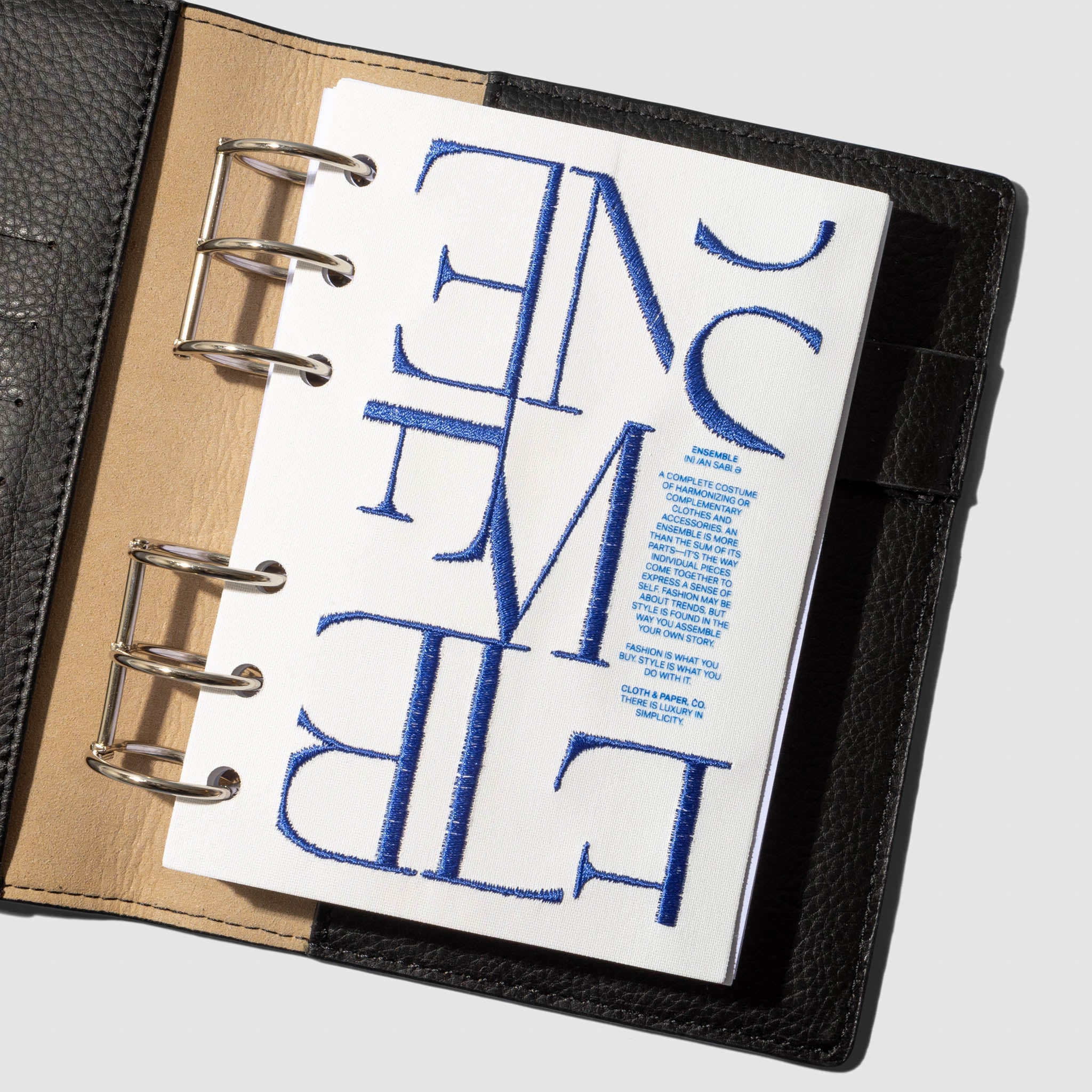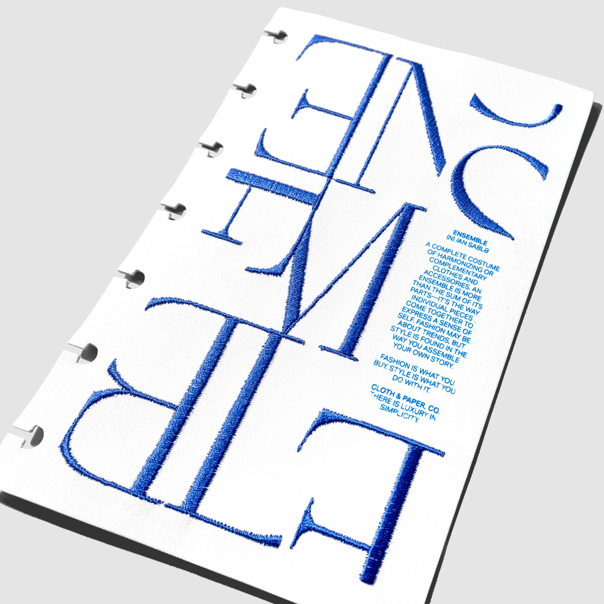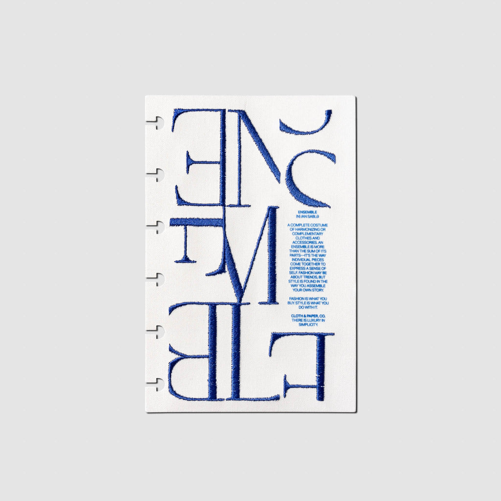 A white linen planner dashboard with blue embroidered accents, combining fabric texture with functional design.