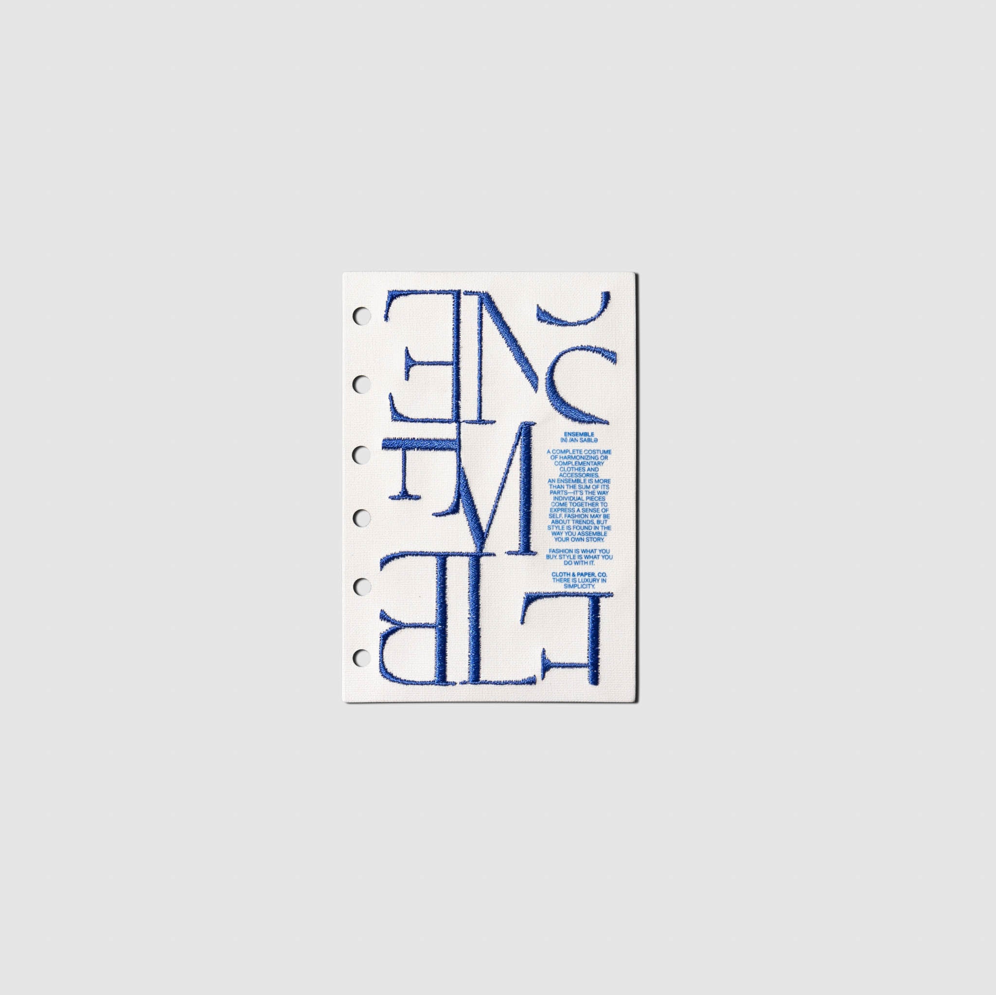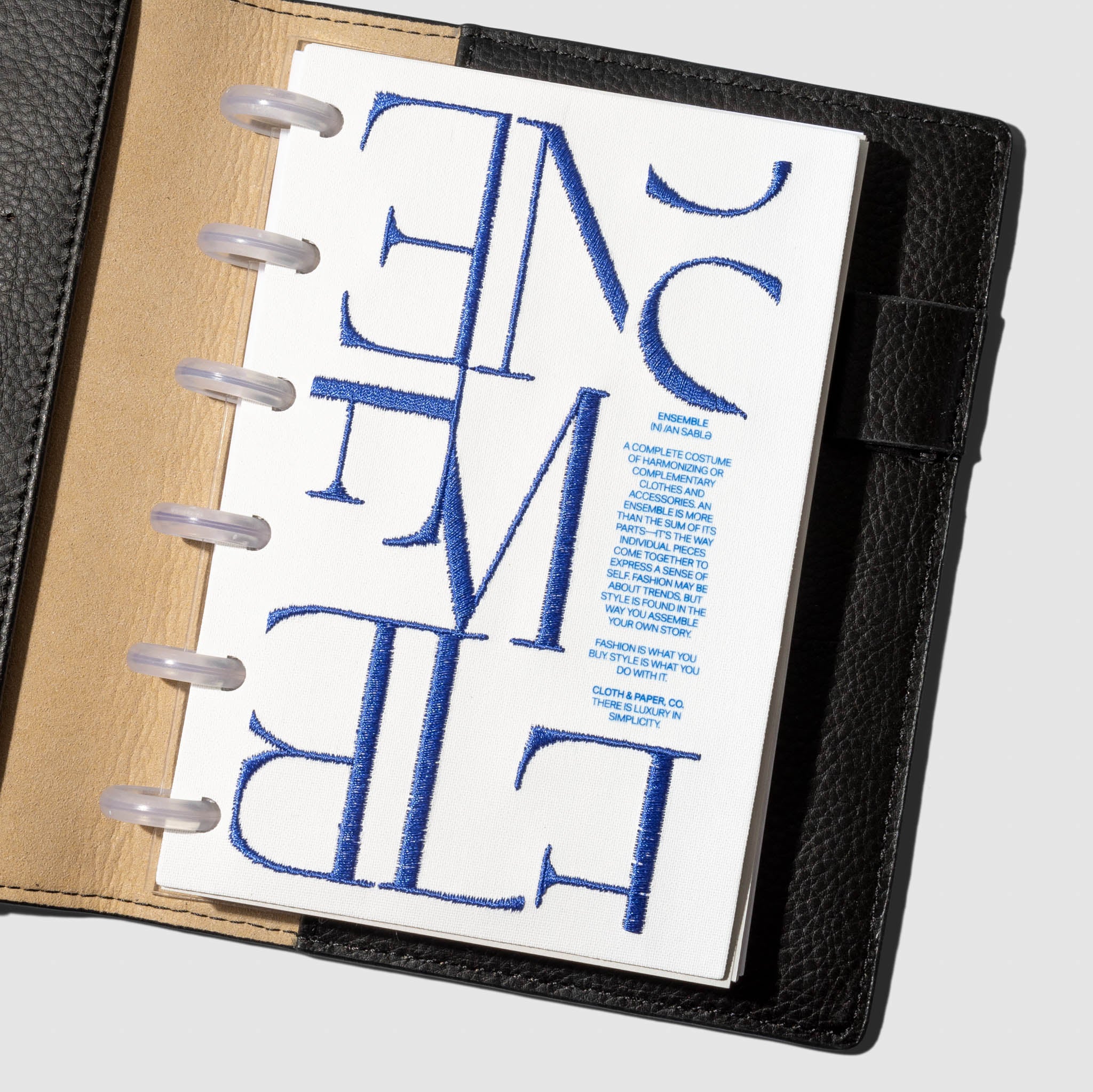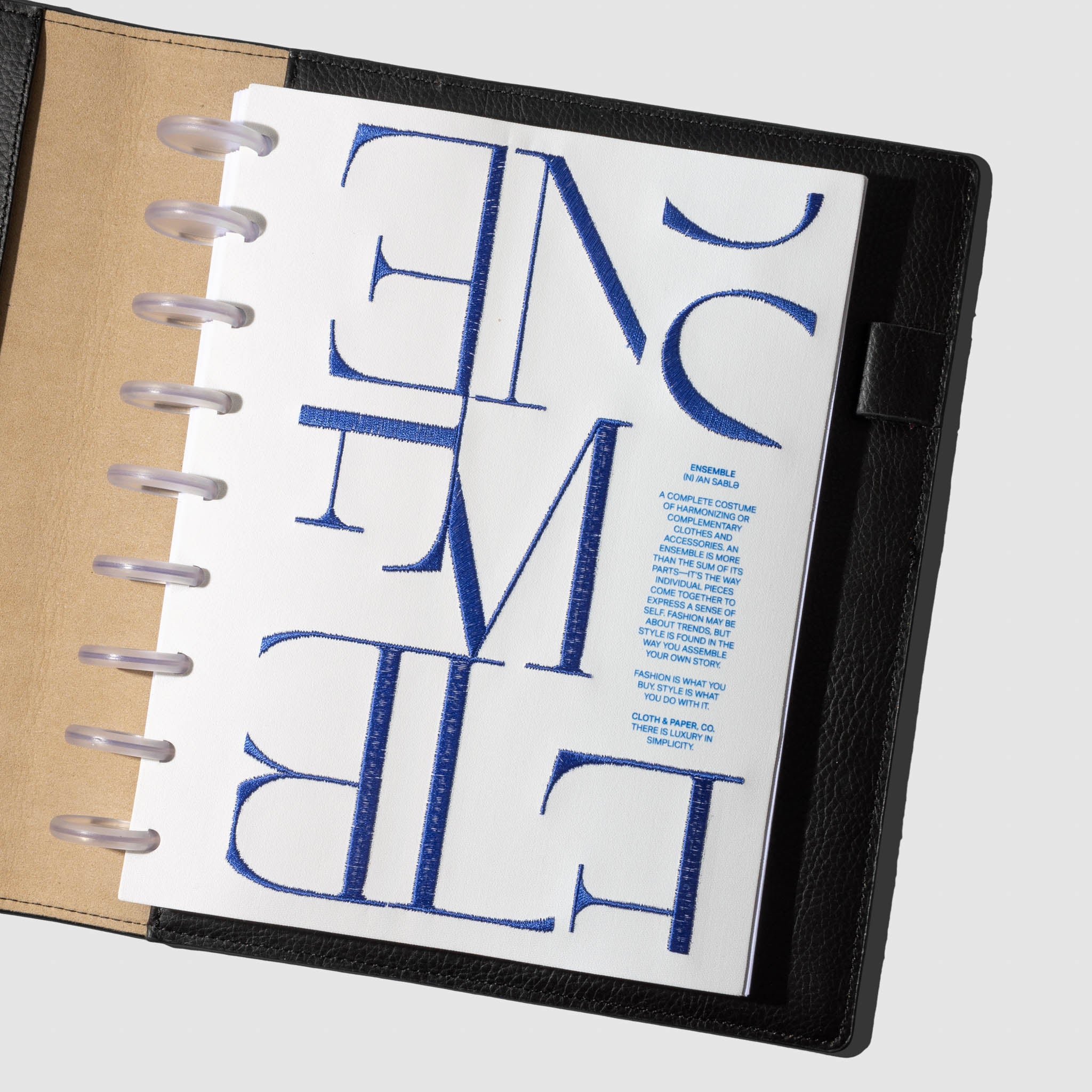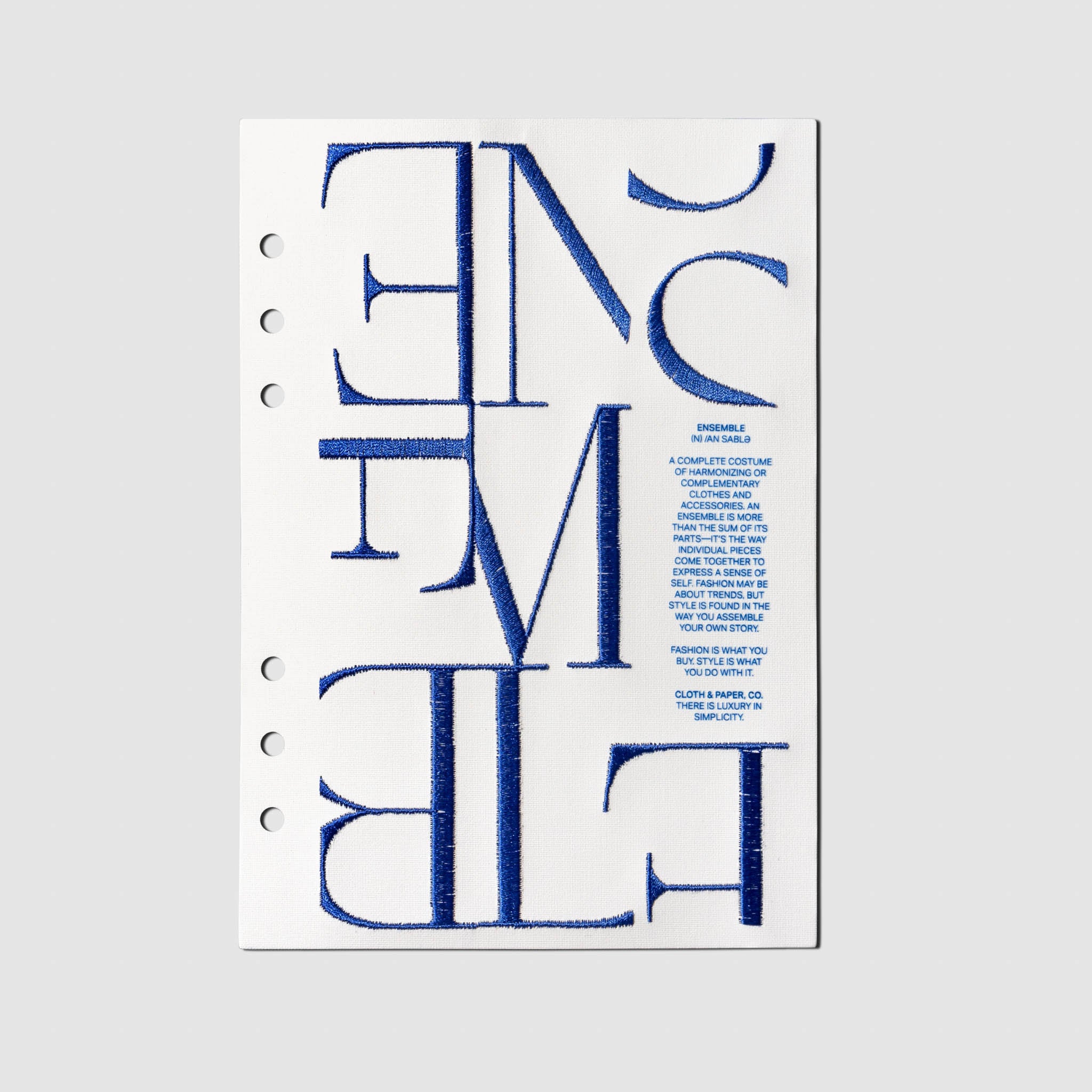 A white linen planner dashboard with blue embroidered accents, combining fabric texture with functional design.