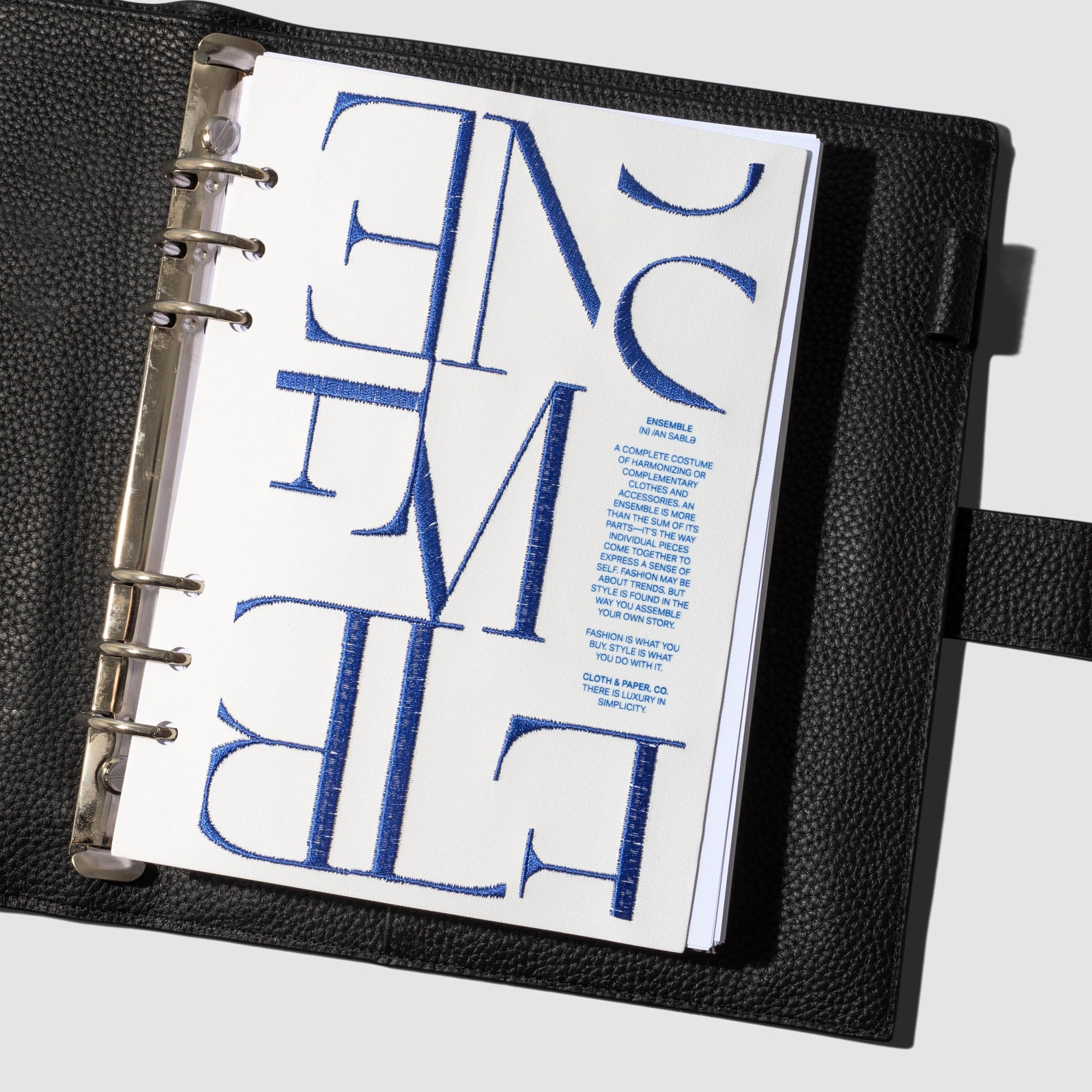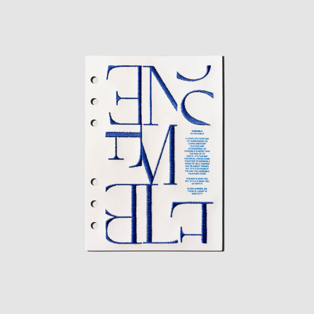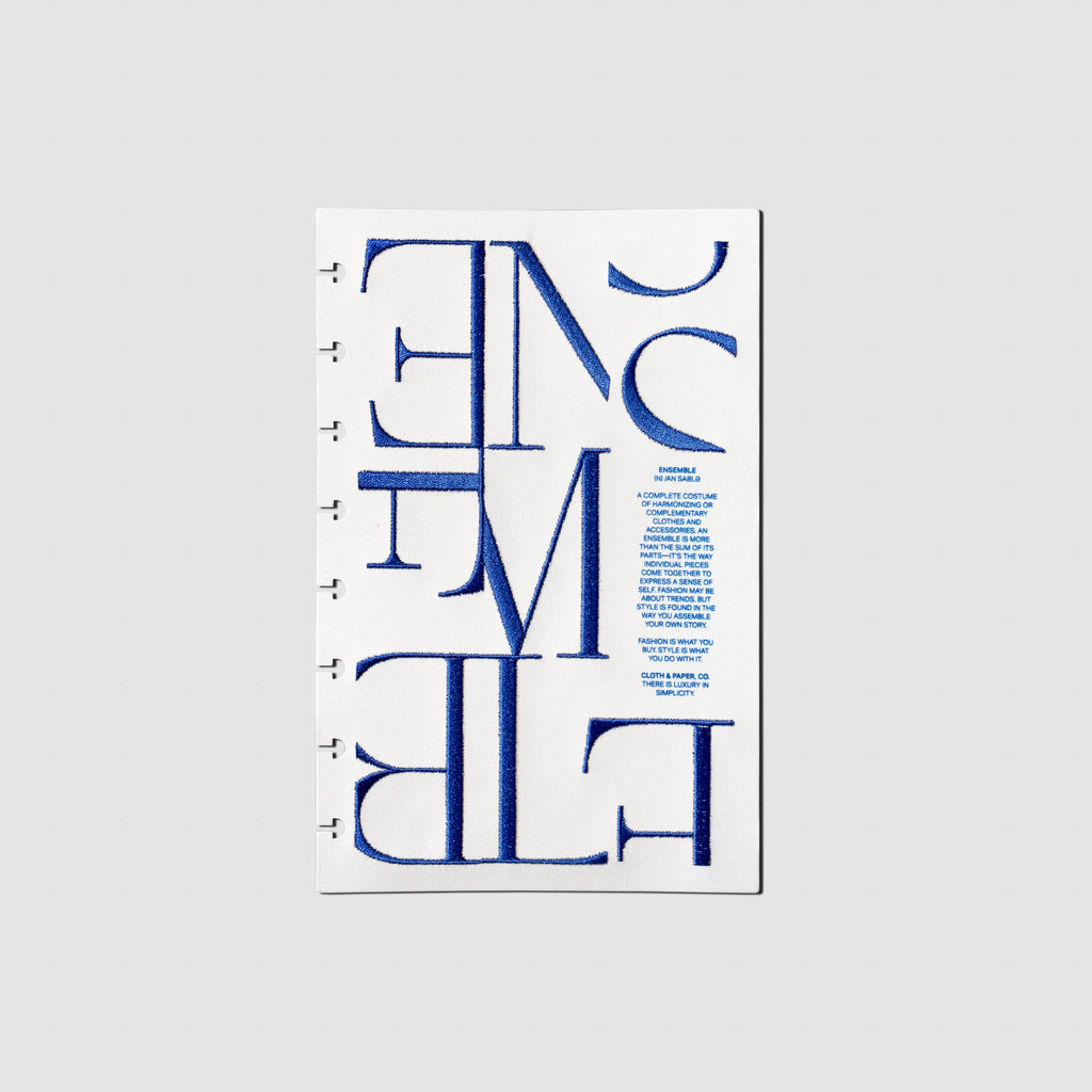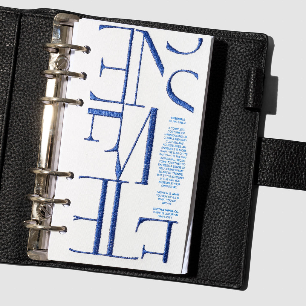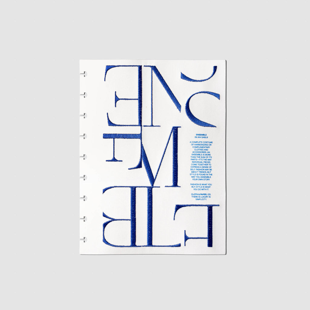 A white linen planner dashboard with blue embroidered accents, combining fabric texture with functional design.