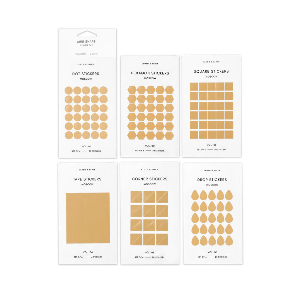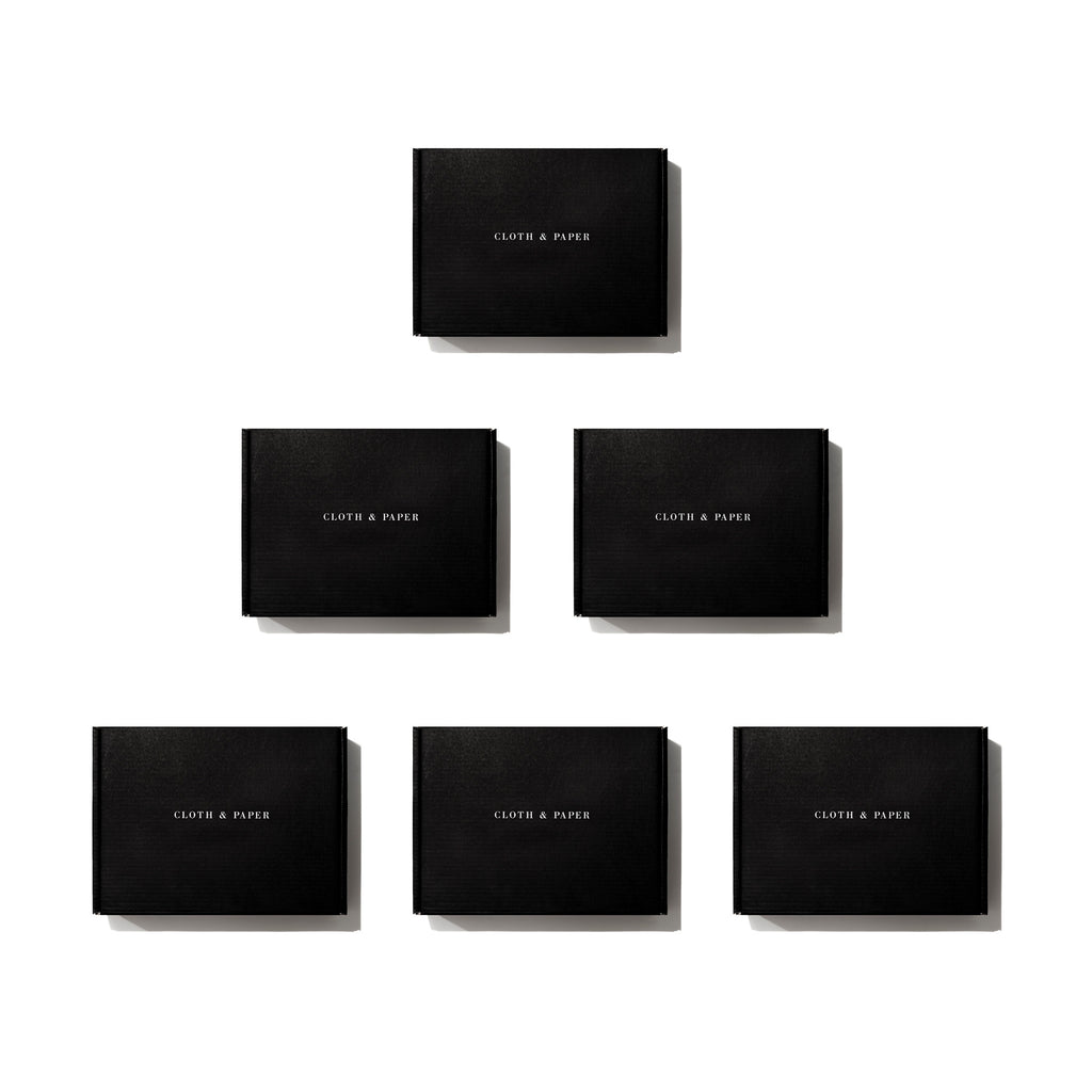 Six white, sealed boxes, viewed from the top down on a neutral background. In black lettering on the top reads "Cloth & Paper. There is luxury in simplicity". Planner dashboards and covers included in the December 2025 Intention Box on a dark background.