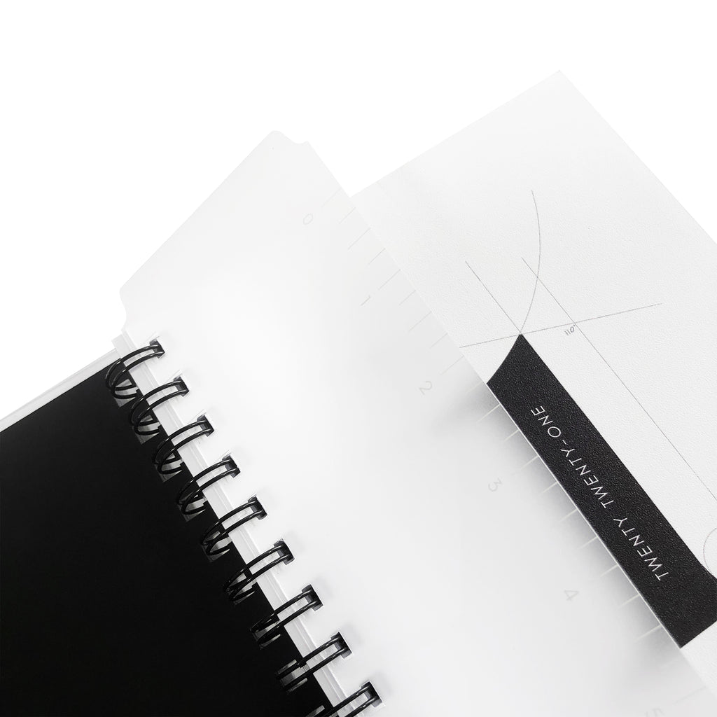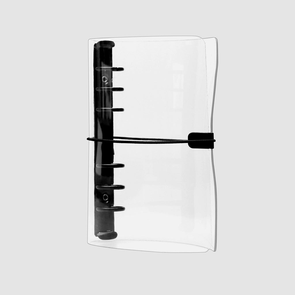 Clear, textured Studded Planner Dashboard in the size A5, on a neutral background. Clear, textured Studded Planner Dashboard in the size A5, shown ringbound in a black leather agenda.
