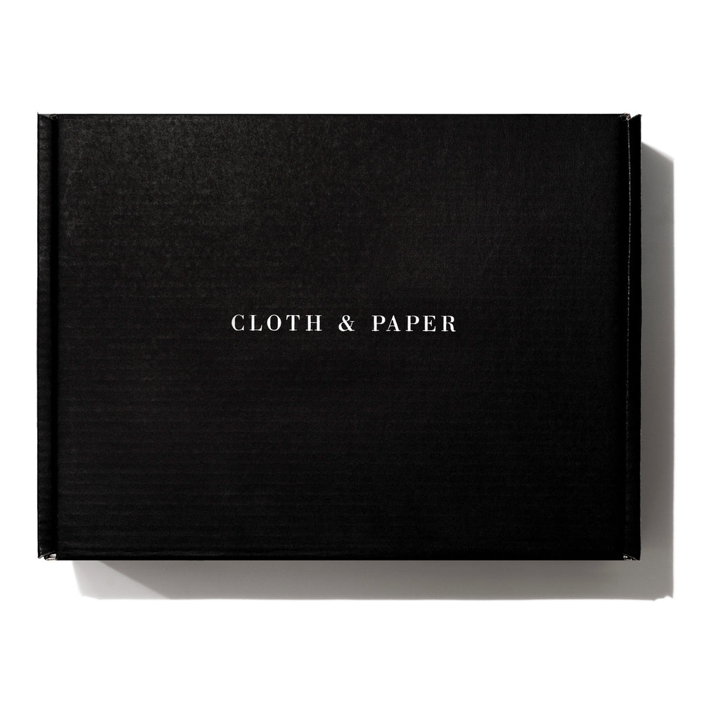 A image of the Intention Box. A white, sealed box, viewed from the top down on a neutral background. In black lettering on the top reads "Cloth & Paper. There is luxury in simplicity". Planner dashboards and covers included in the December 2025 Intention Box on a dark background.