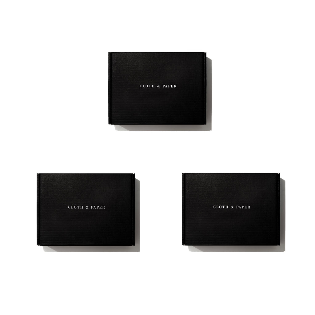 Three white, sealed boxes, viewed from the top down on a neutral background. In black lettering on the top reads "Cloth & Paper. There is luxury in simplicity". Planner dashboards and covers included in the December 2025 Intention Box on a dark background.